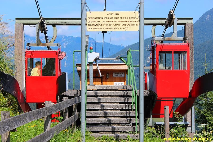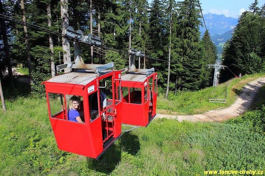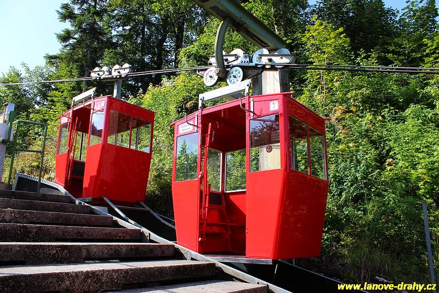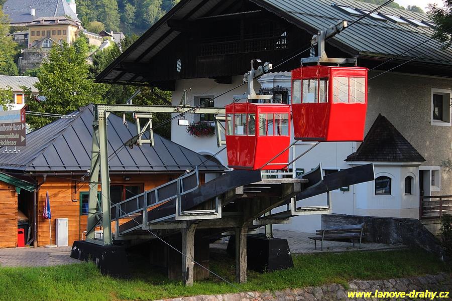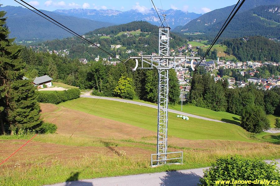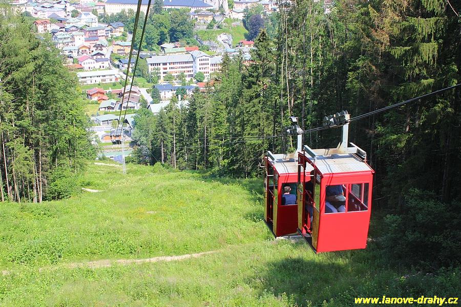 Obersalzbergbahn. Jde o malou skupinovou kyvadlovou lanovku s čtyřmístnými