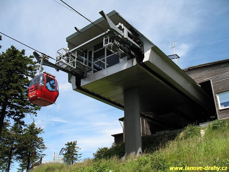 lanovkou Doppelmayr, která je sice taktéž vybavena lomenou mezistanicí, má již