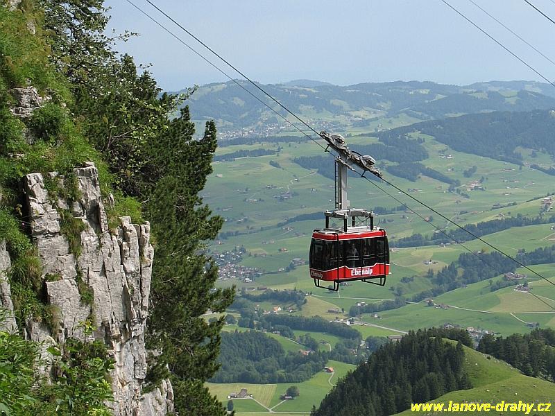 Appenzellerlandu. Kyvadlová lanovka s kabinami pro 40 osob je dlouhá 1514 metrů