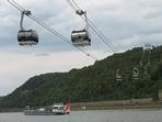 dvěma podpěrami křižuje mohutnou řeku Rýn, železniční trať a silniční