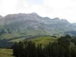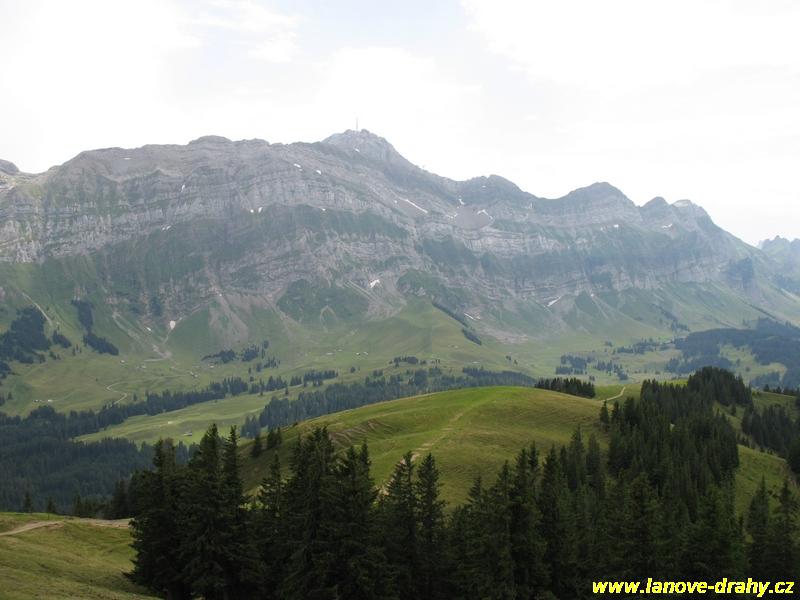 výhled na nejvyšší vrchol tét o oblasti, známý Säntis s mohutným vysílačem.