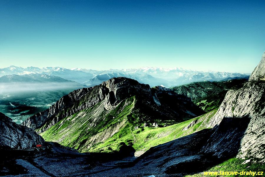 Titlis přes čtyřtisícovky Bernských Alp až po německý Schwarzwald. Ozubnicová