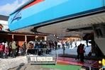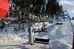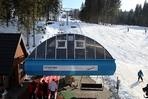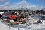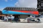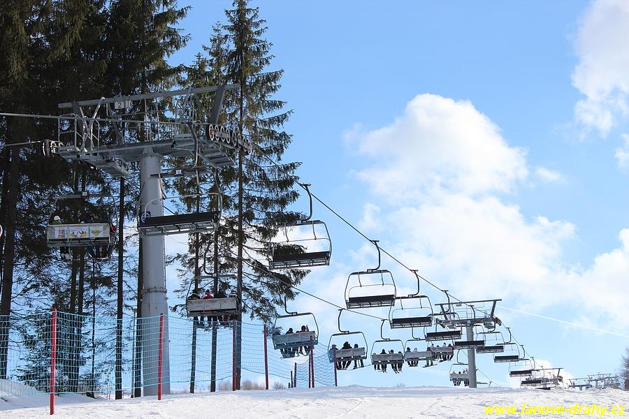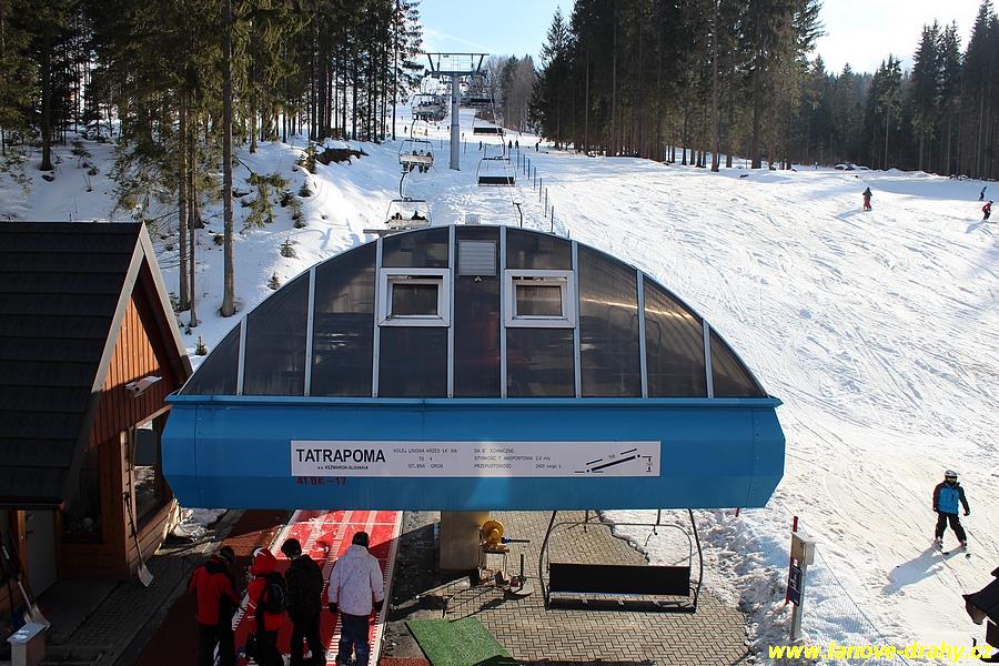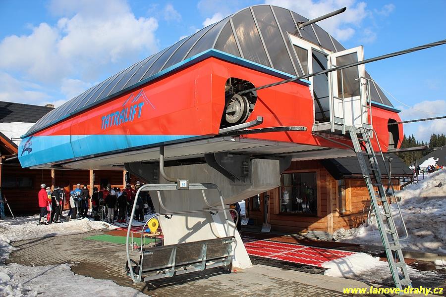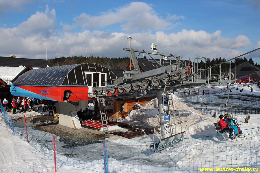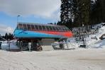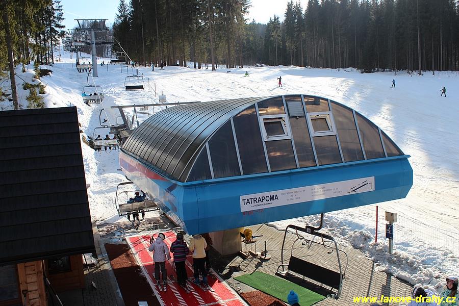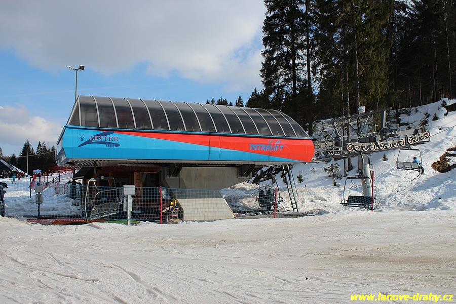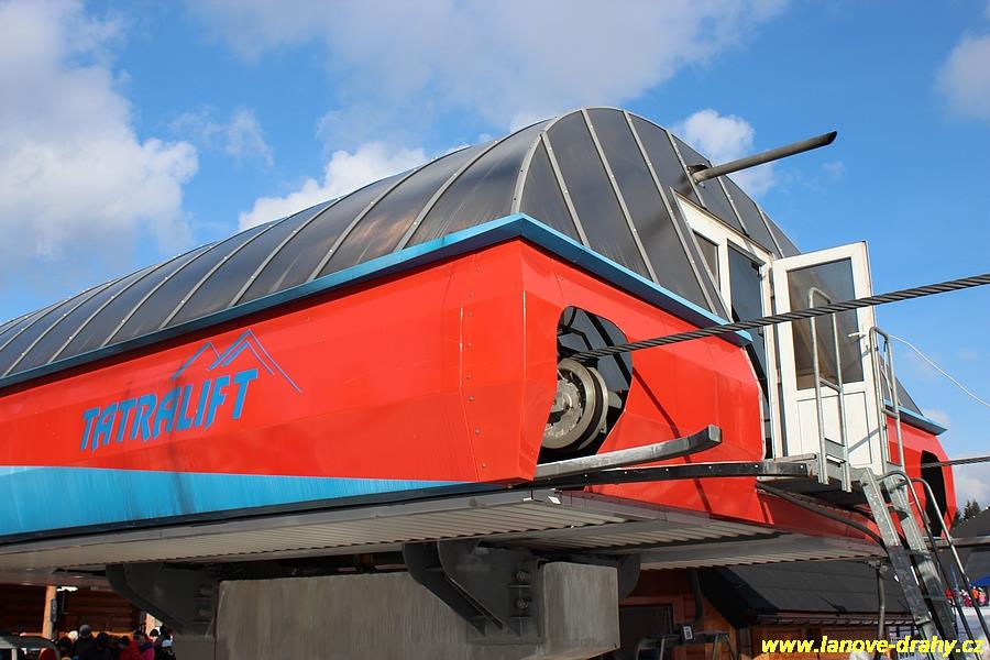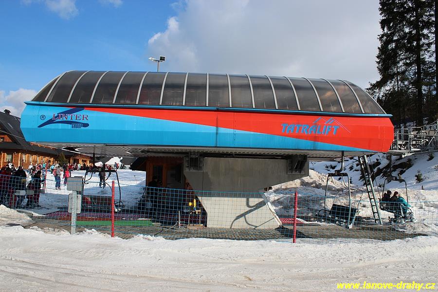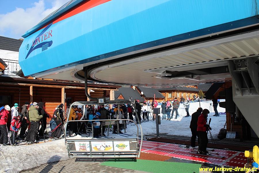 osobní visutá jednolanová dráha oběžného systému s pevným uchycením čtyřmístných sedaček a rozběhovým pásem |