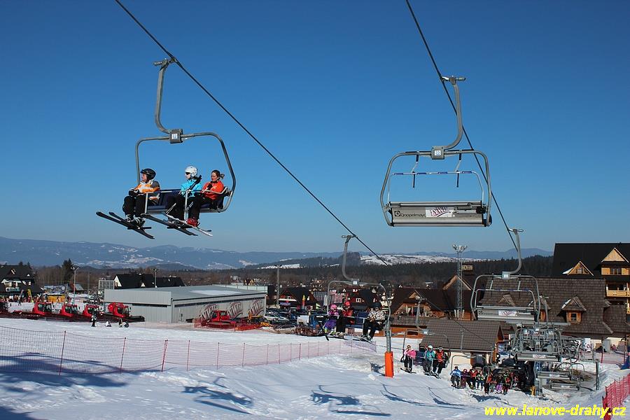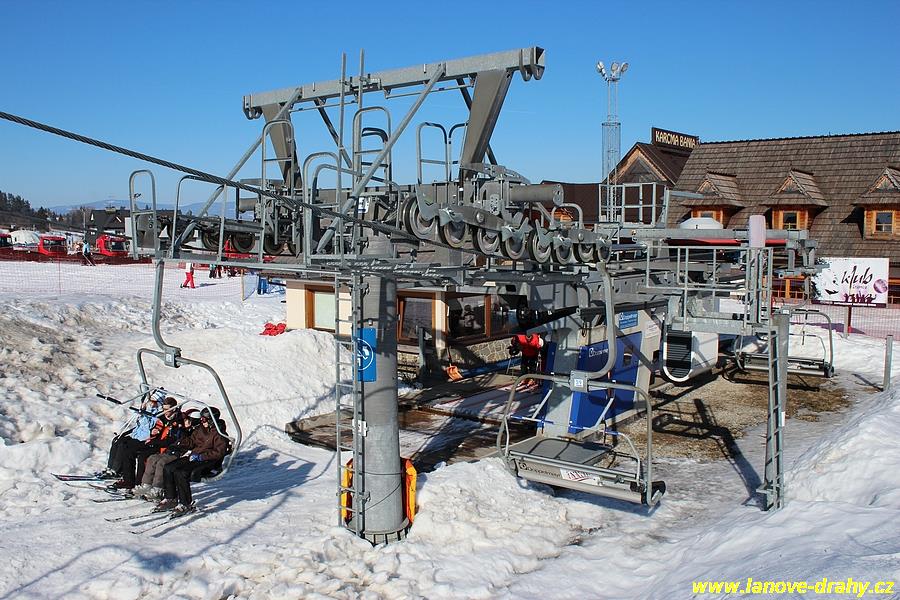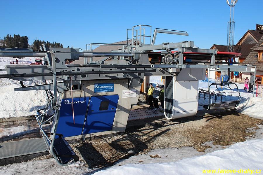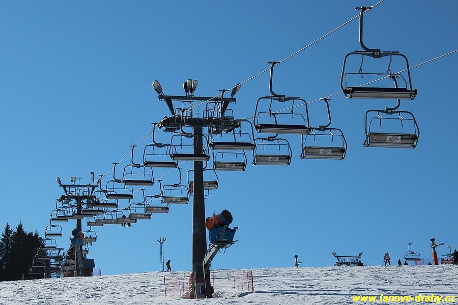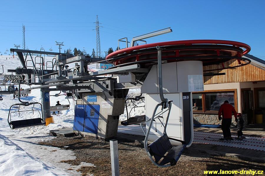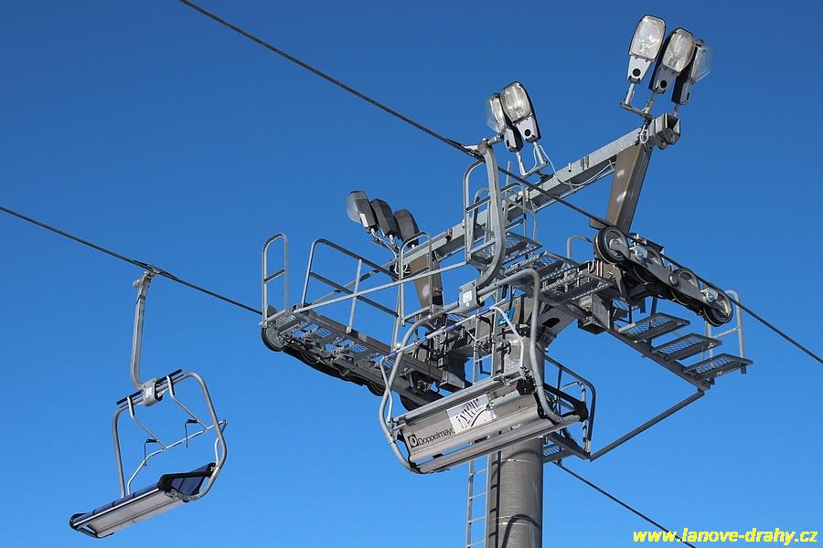Typ lanovky : osobní visutá jednolanová dráha oběžného systému s neodpojitelným uchycením čtyřmístných sedaček a rozběhovým pásem