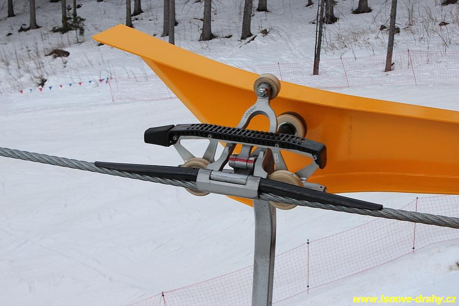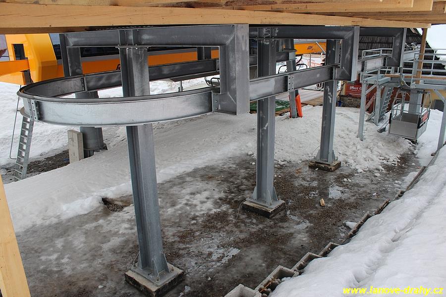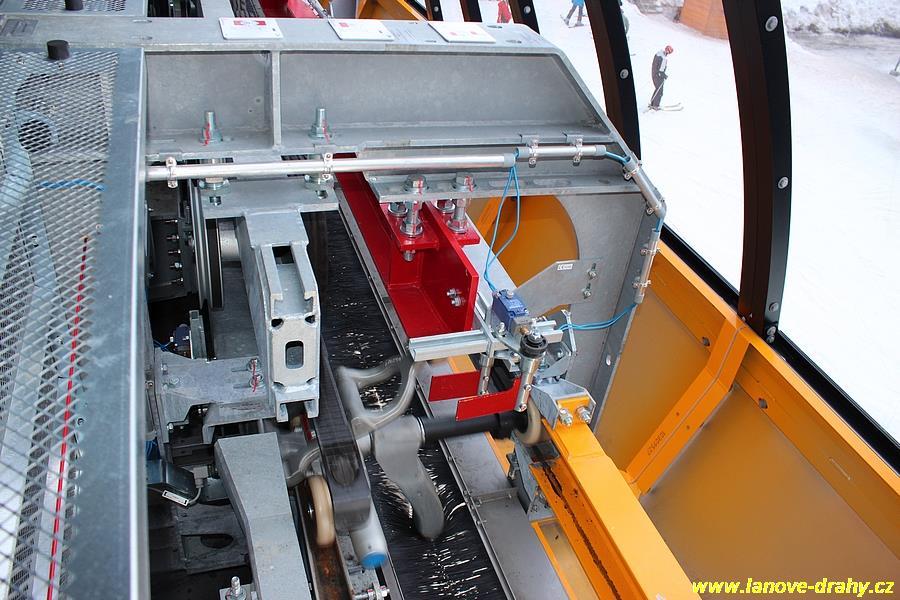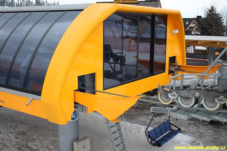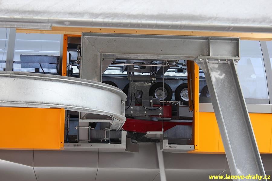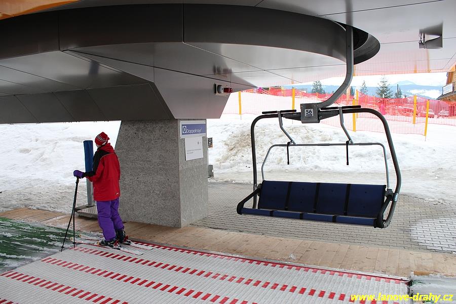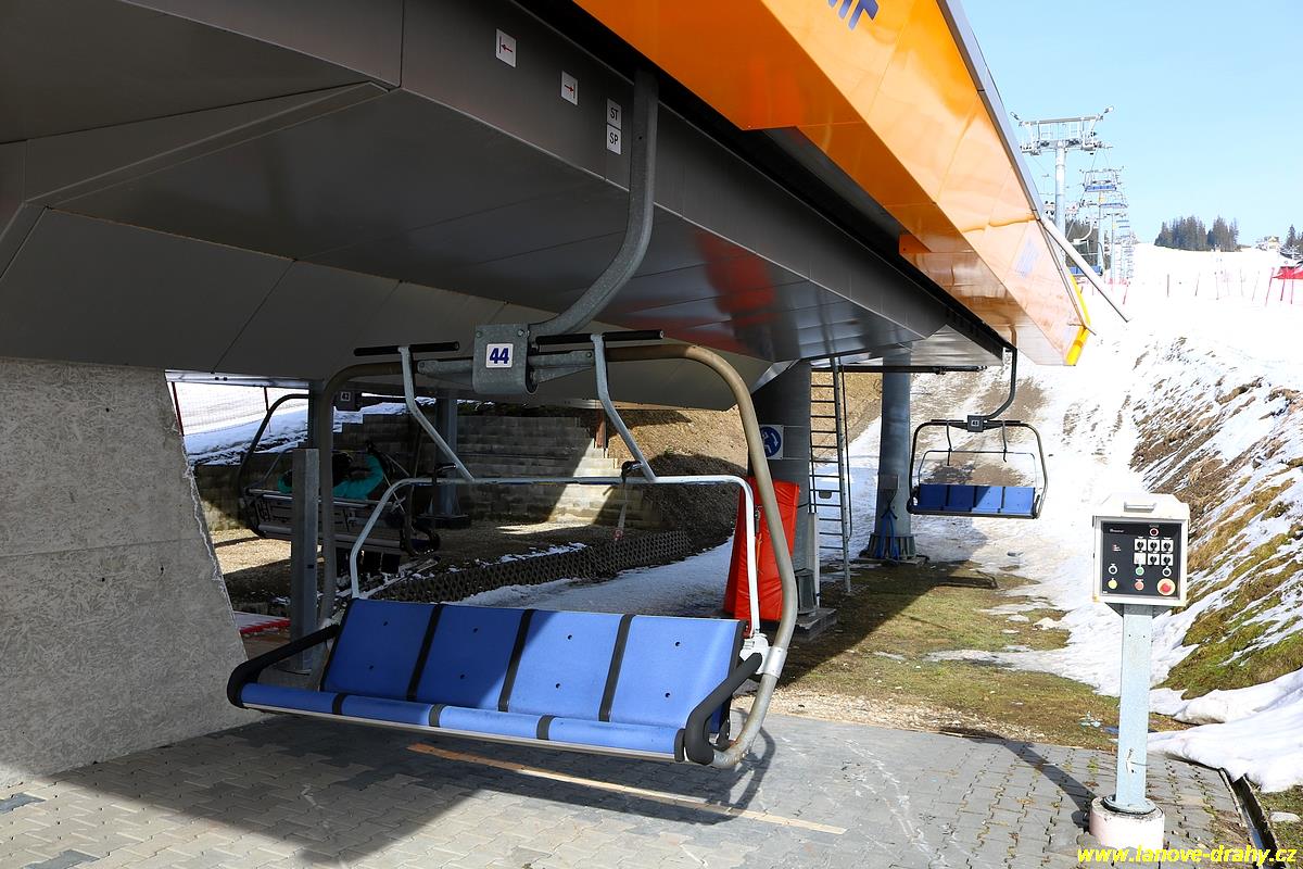 uchycením čtyřmístných sedaček a nástupním pásem |