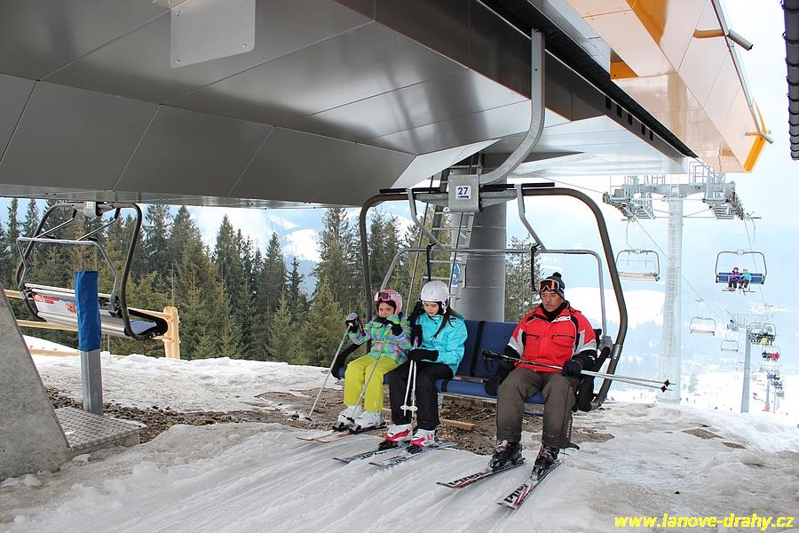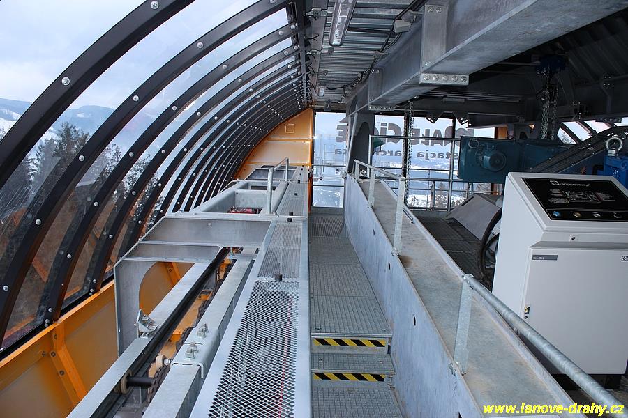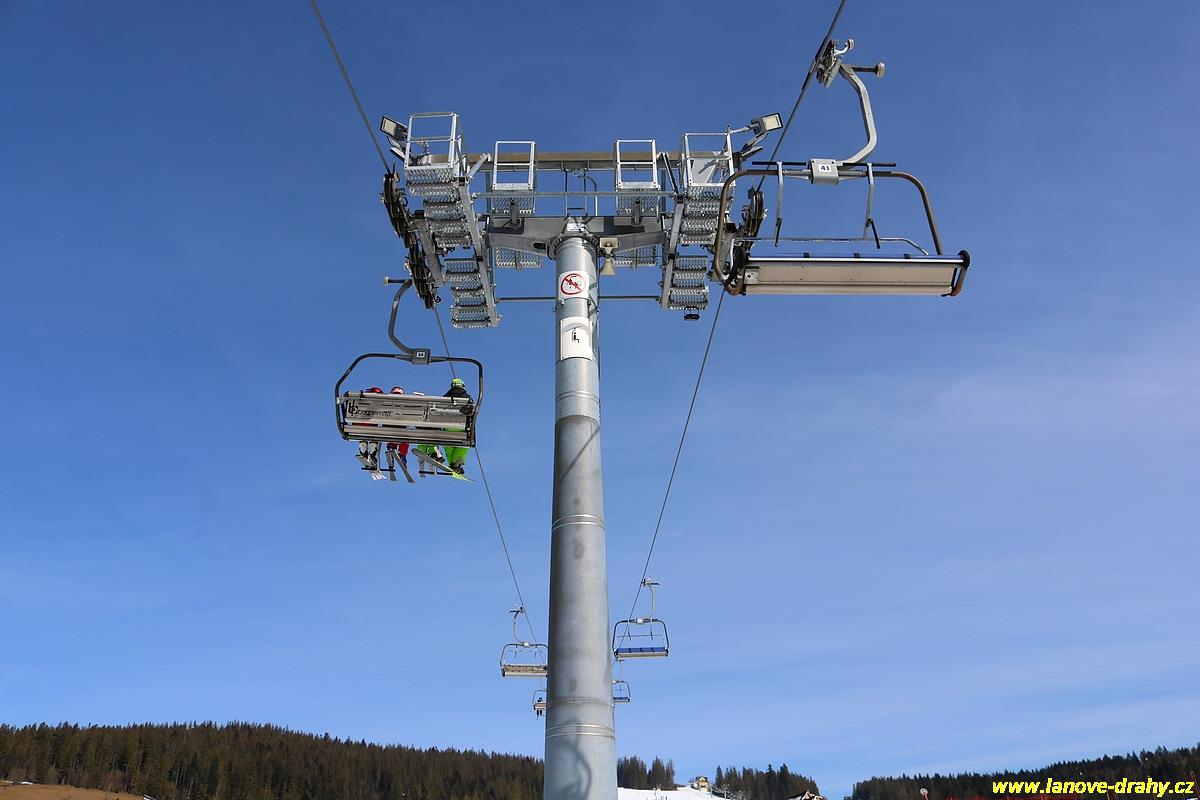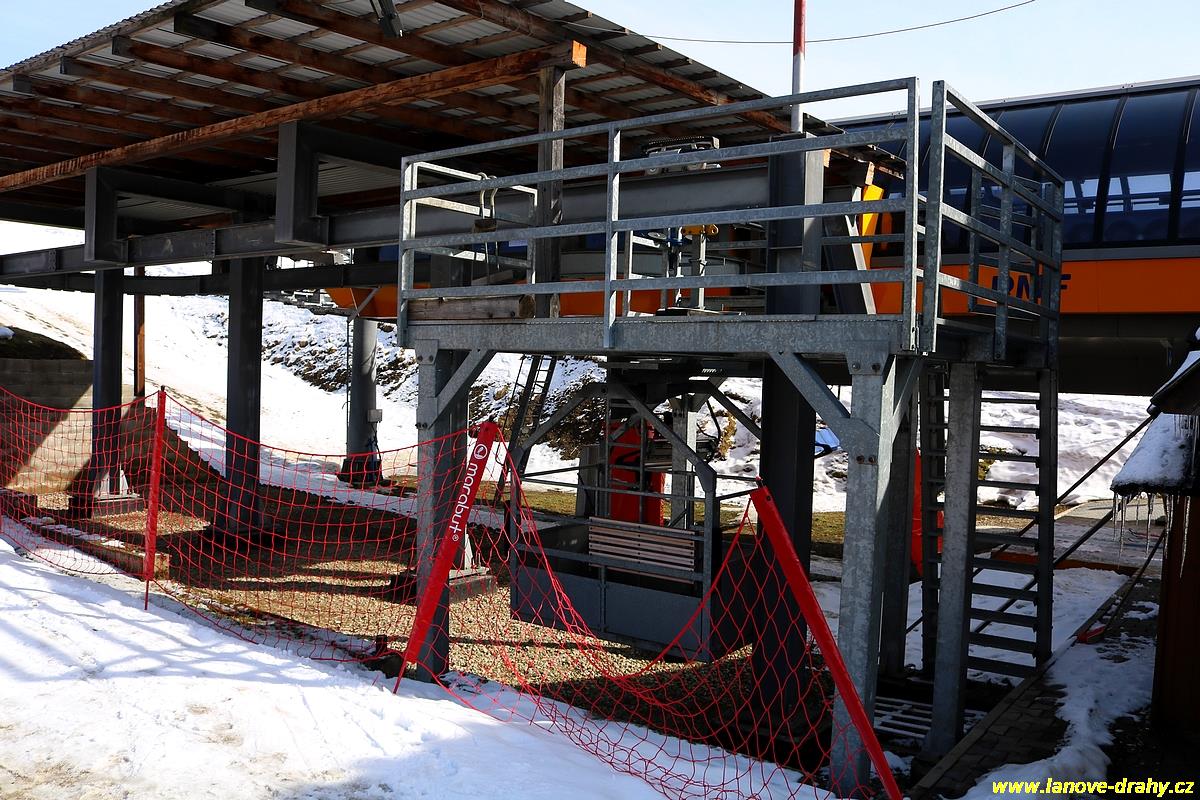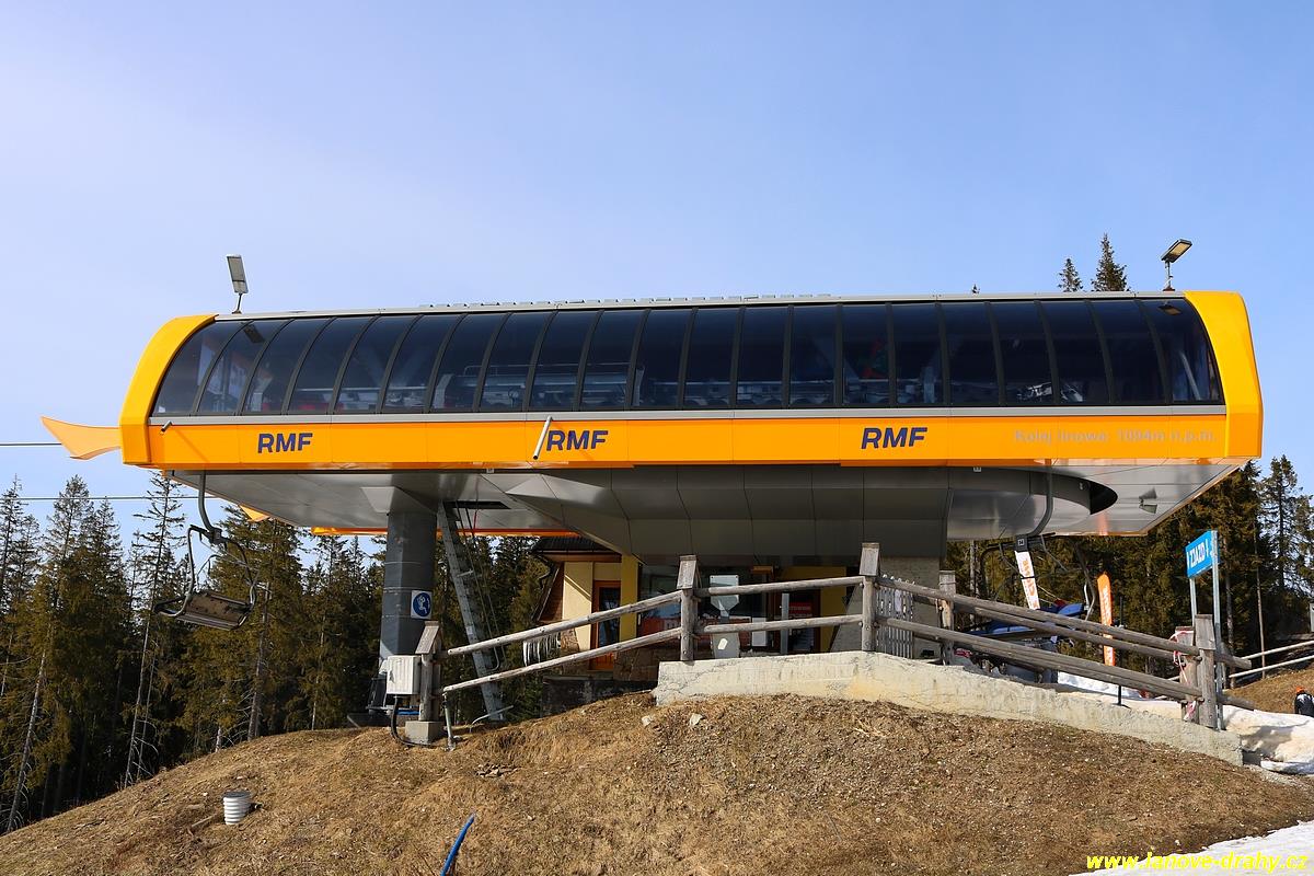 uchycením čtyřmístných sedaček a nástupním pásem |