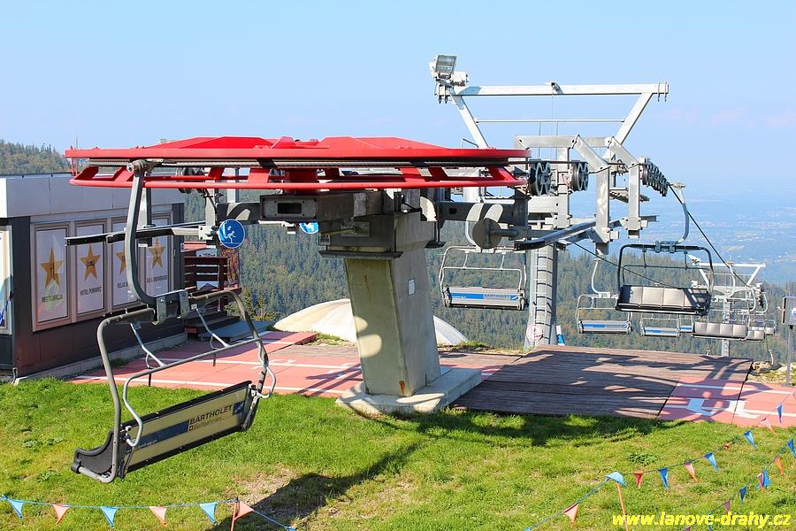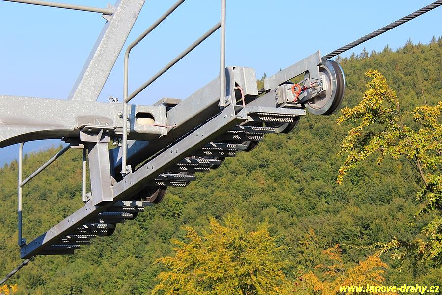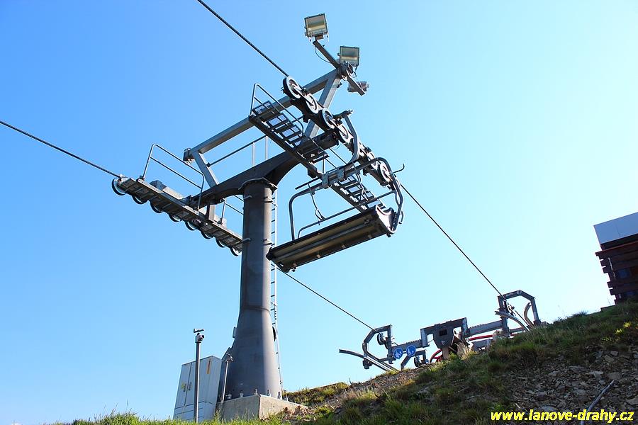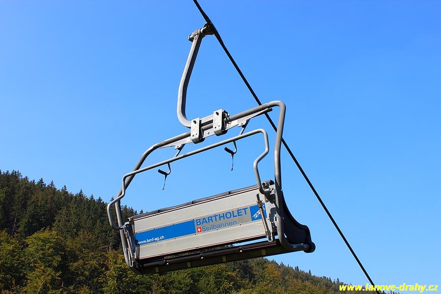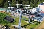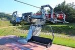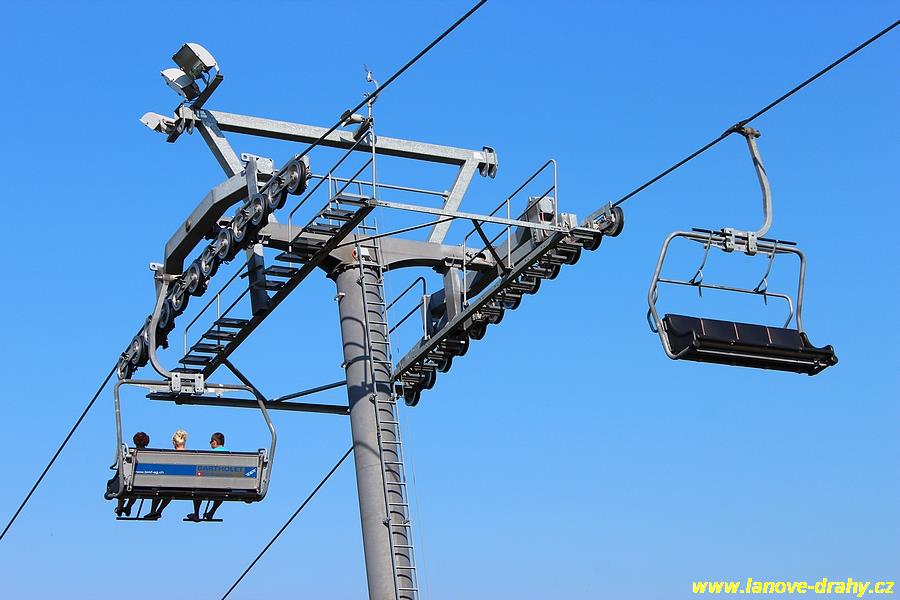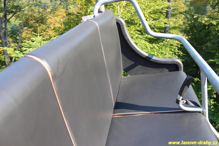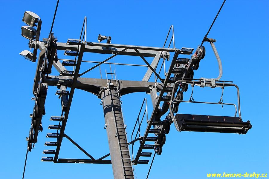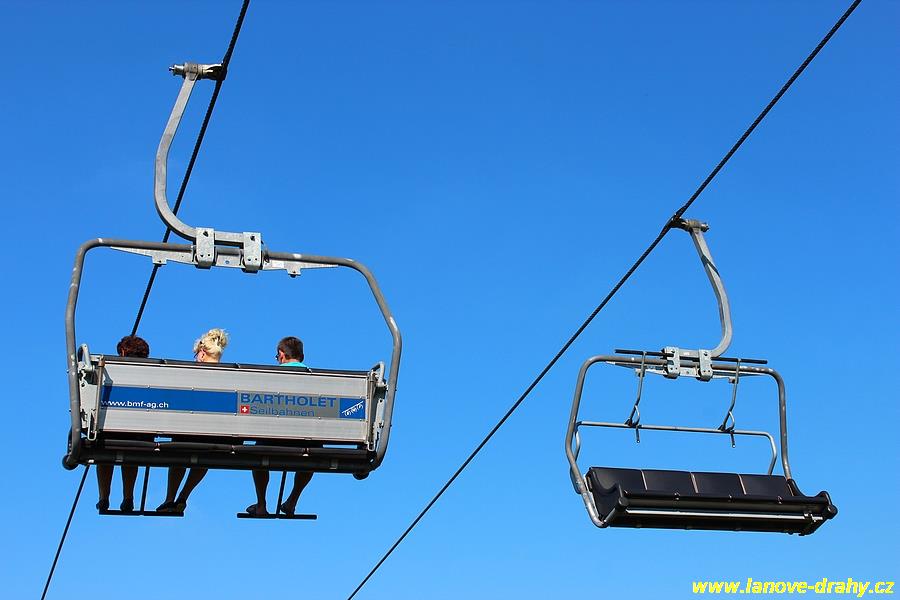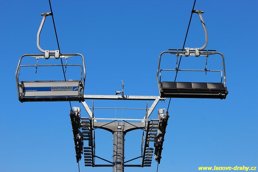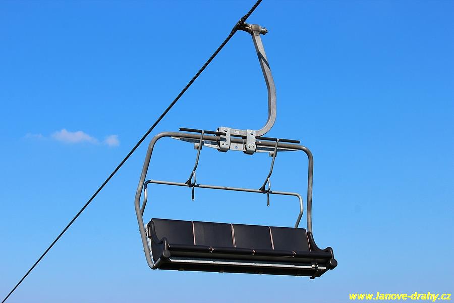 osobní visutá jednolanová dráha oběžného systému s pevným uchycením čtyřmístných sedaček a rozběhovým pásem |