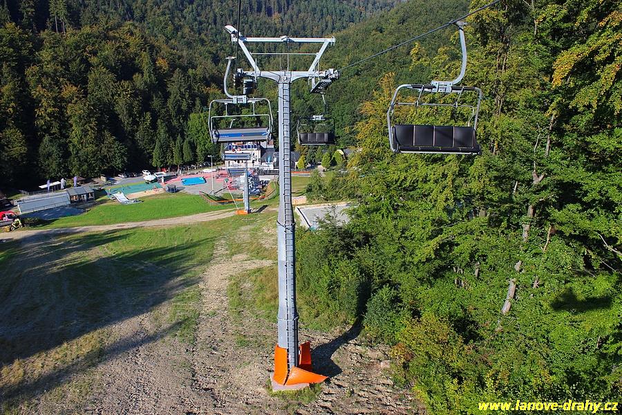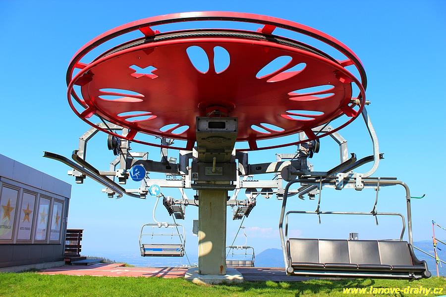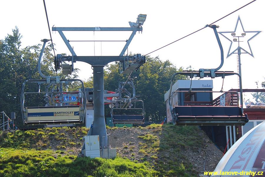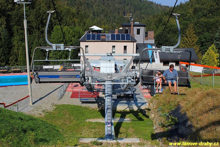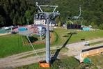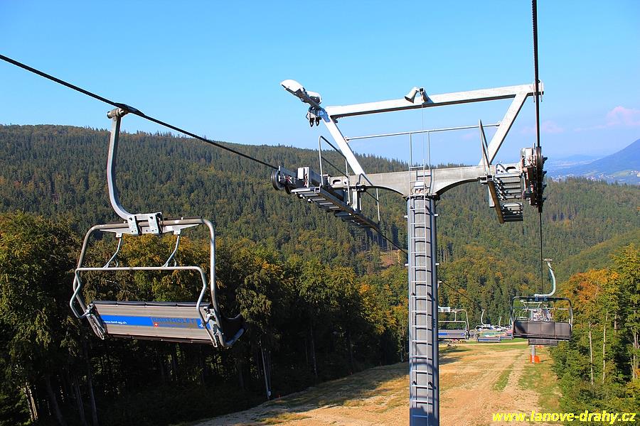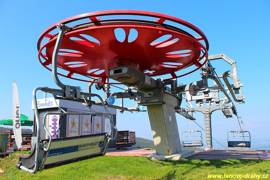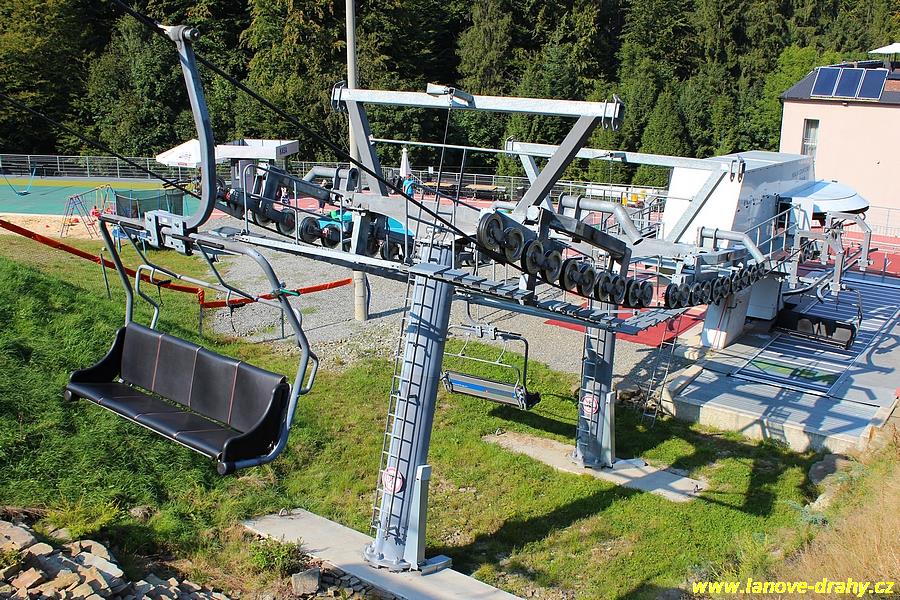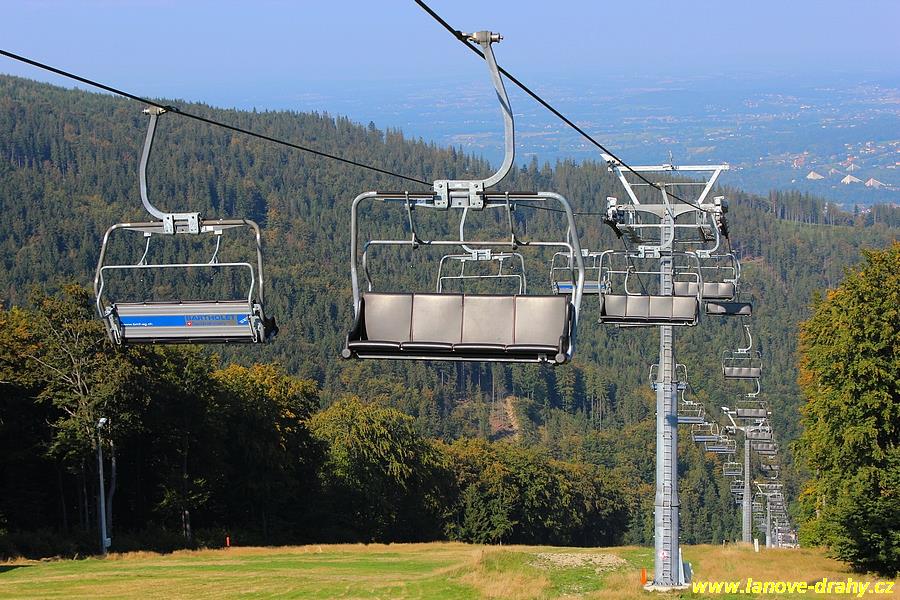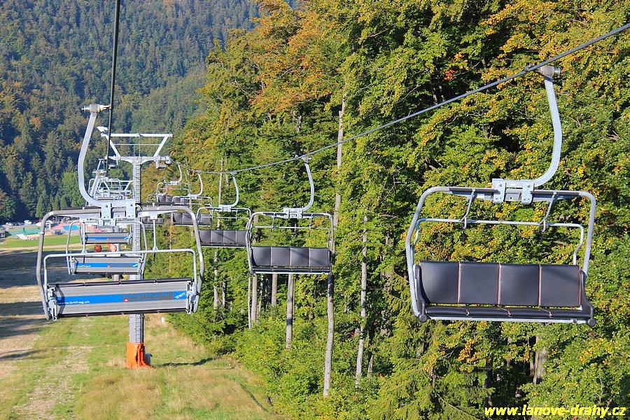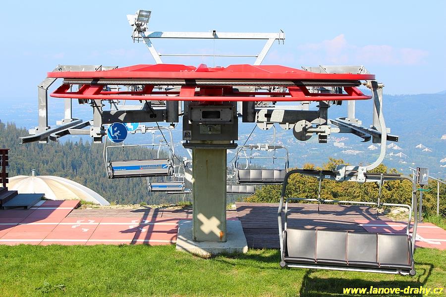 osobní visutá jednolanová dráha oběžného systému s pevným uchycením čtyřmístných sedaček a rozběhovým pásem |