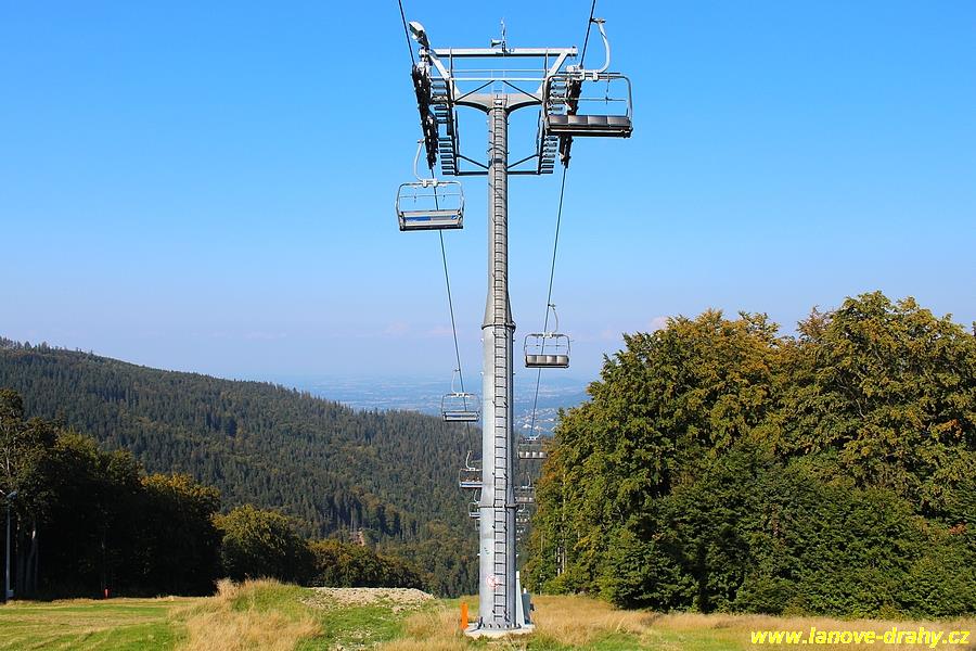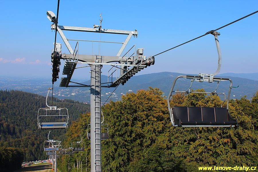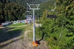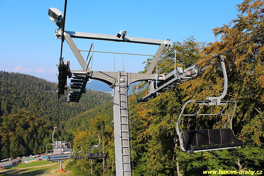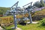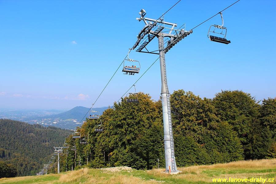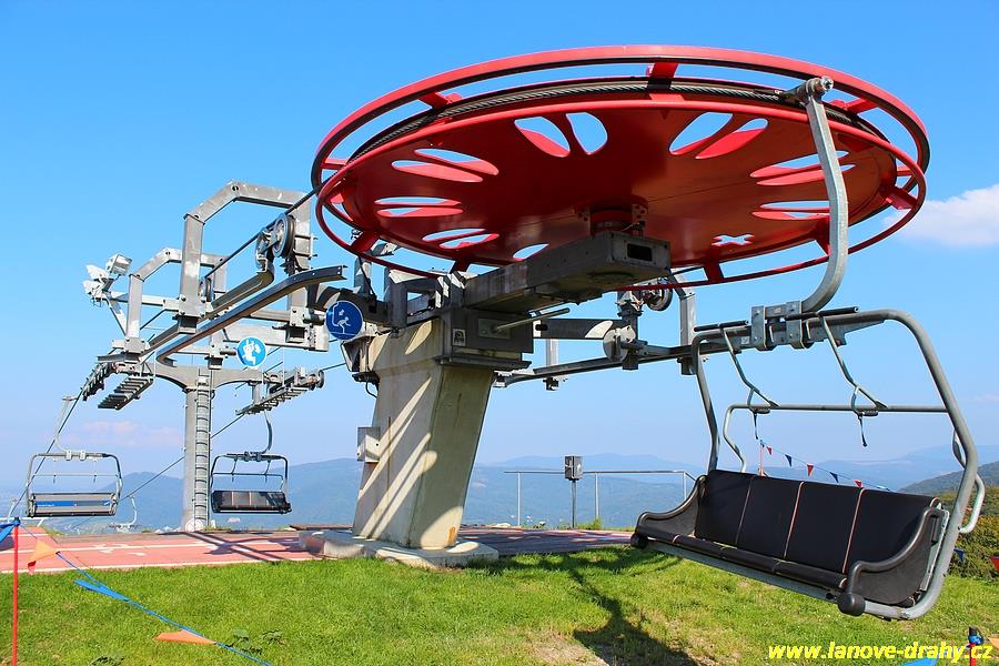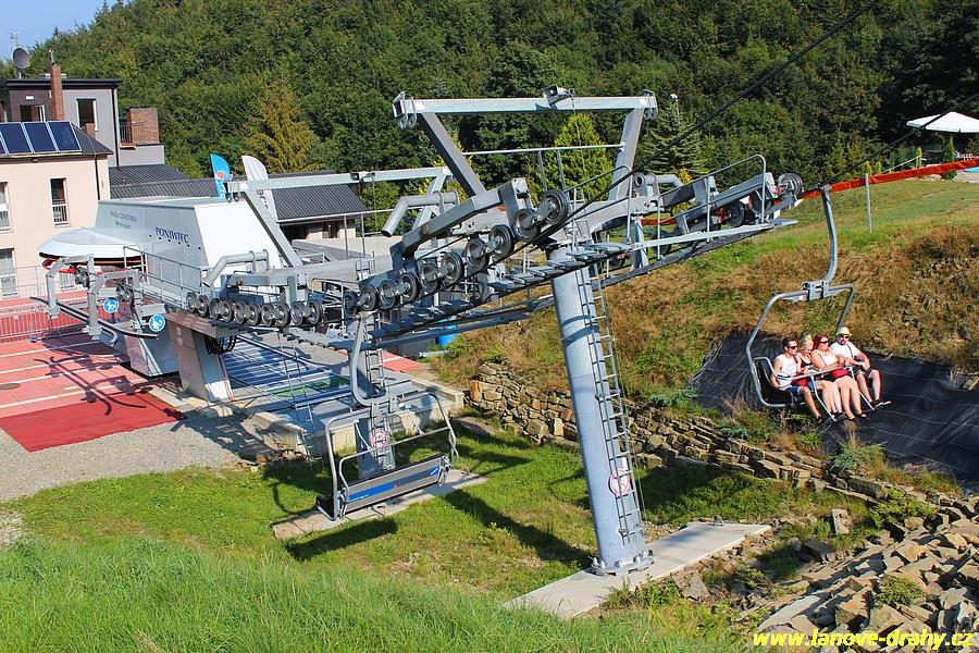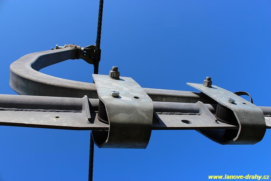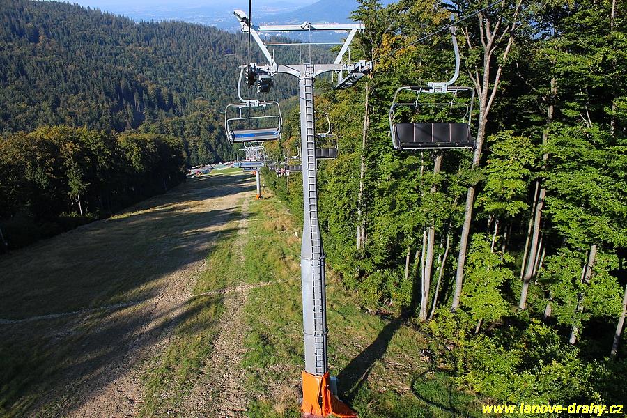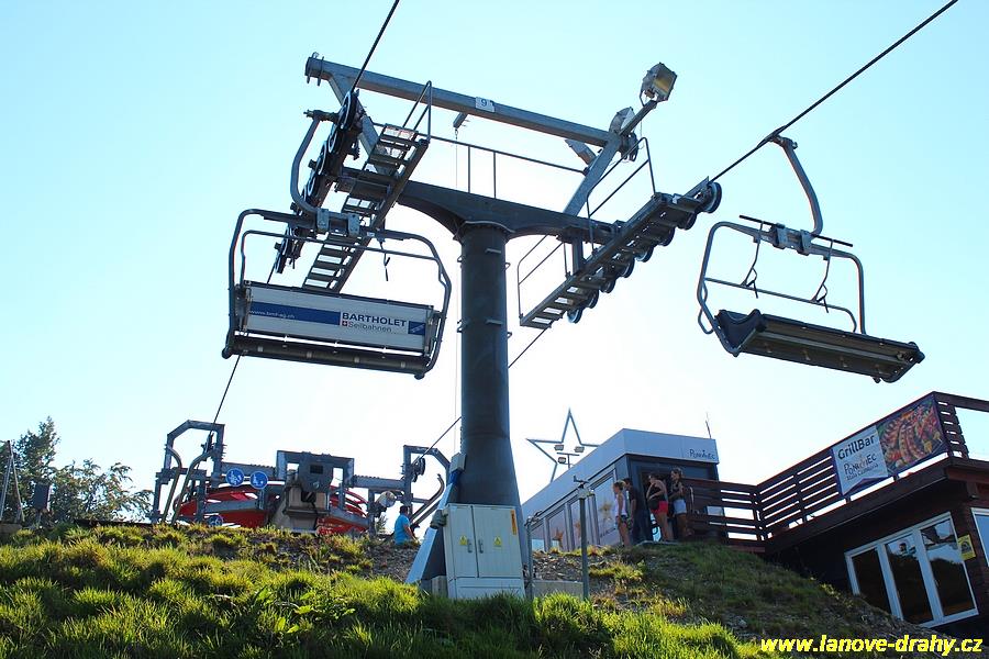 osobní visutá jednolanová dráha oběžného systému s pevným uchycením čtyřmístných sedaček a rozběhovým pásem |