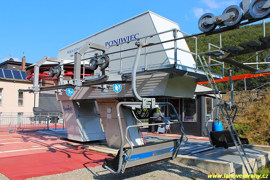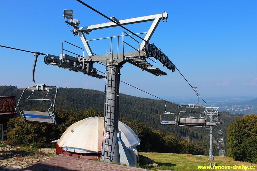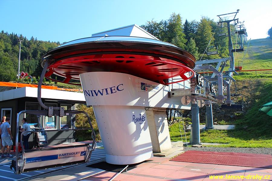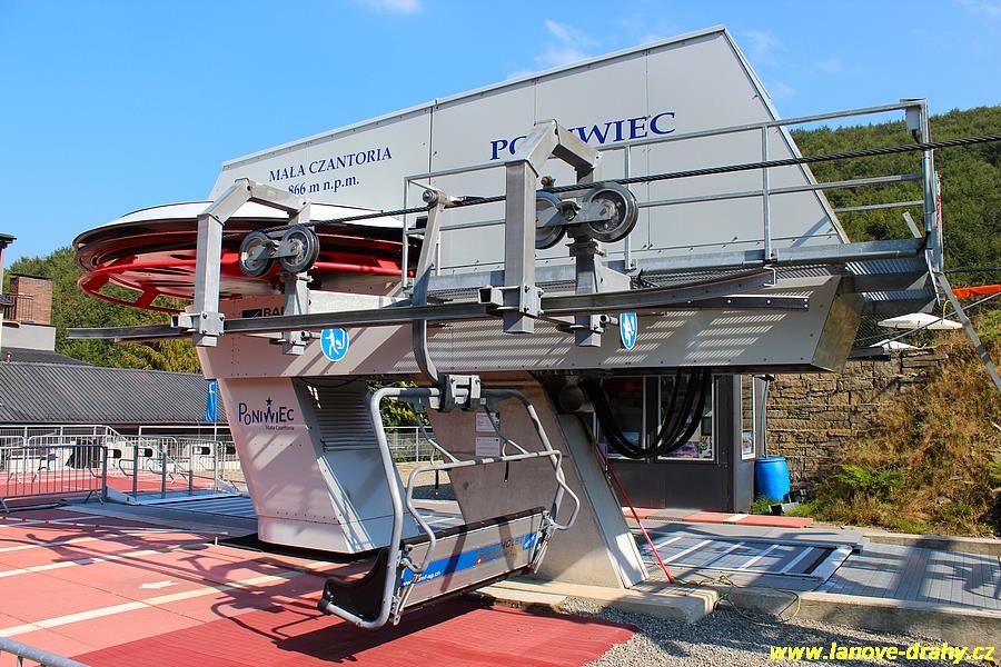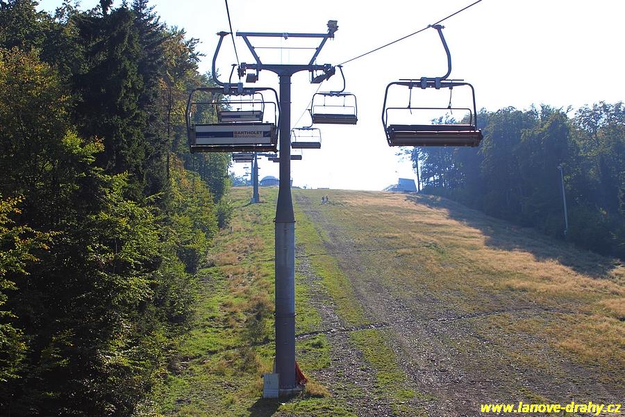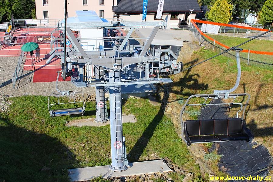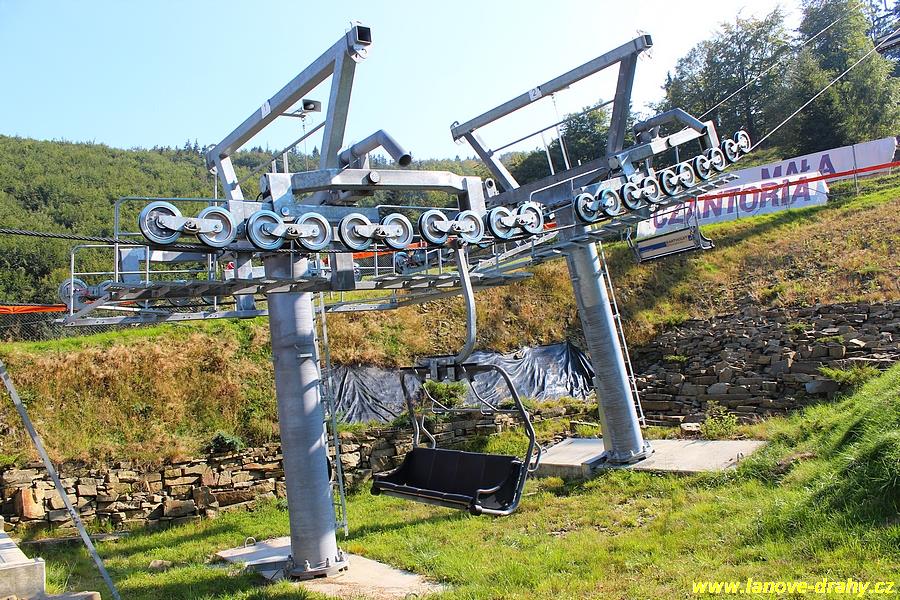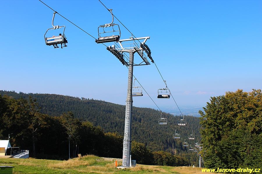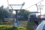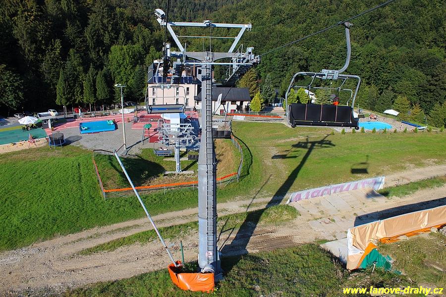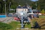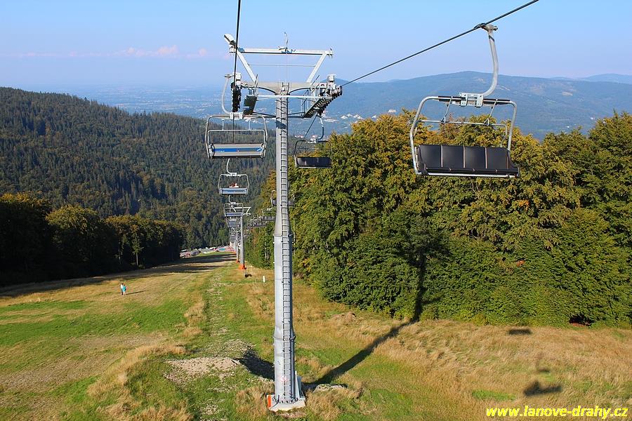 osobní visutá jednolanová dráha oběžného systému s pevným uchycením čtyřmístných sedaček a rozběhovým pásem |