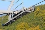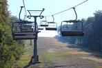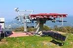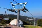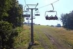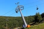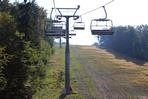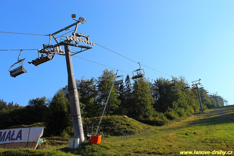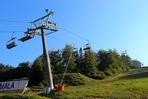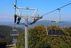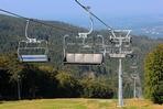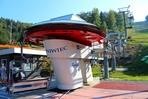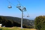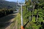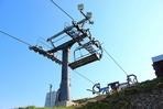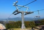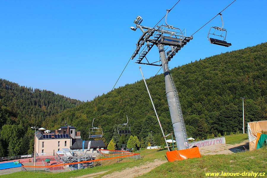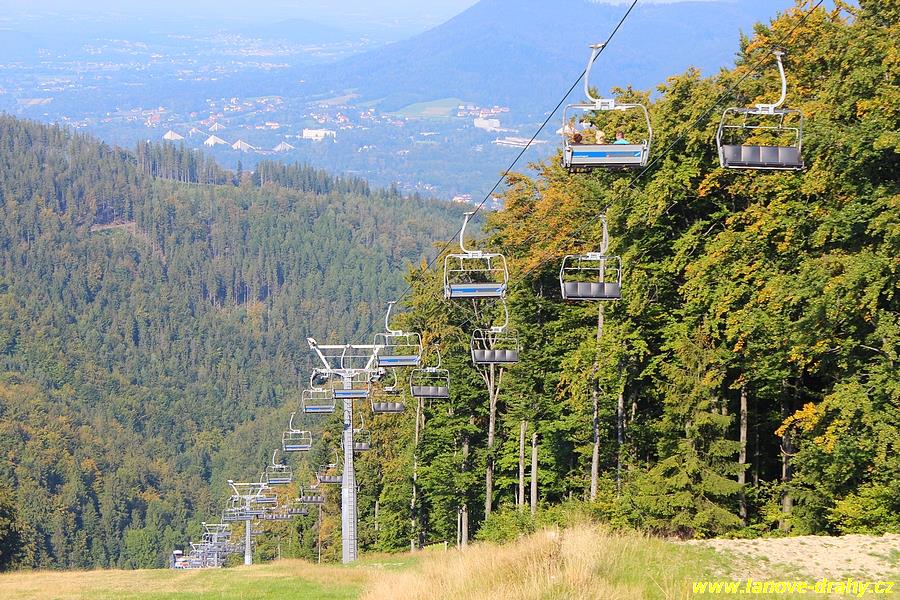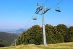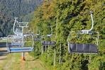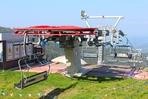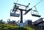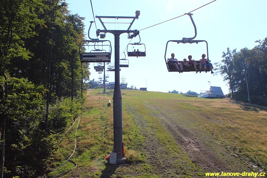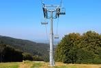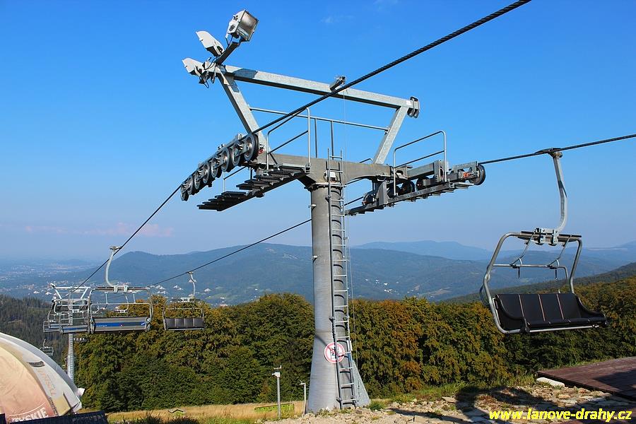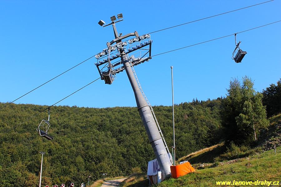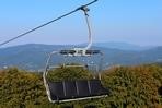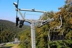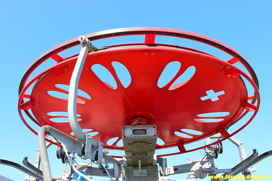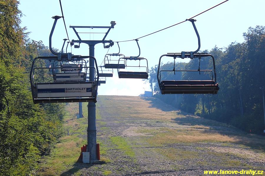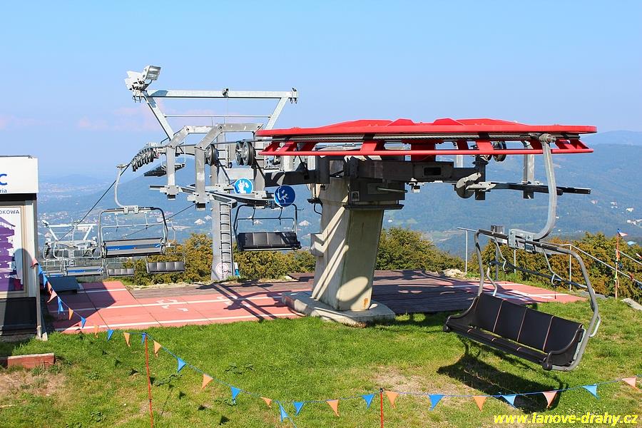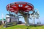 osobní visutá jednolanová dráha oběžného systému s pevným uchycením čtyřmístných sedaček a rozběhovým pásem |