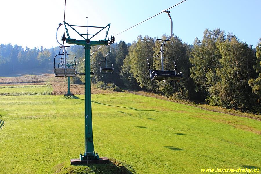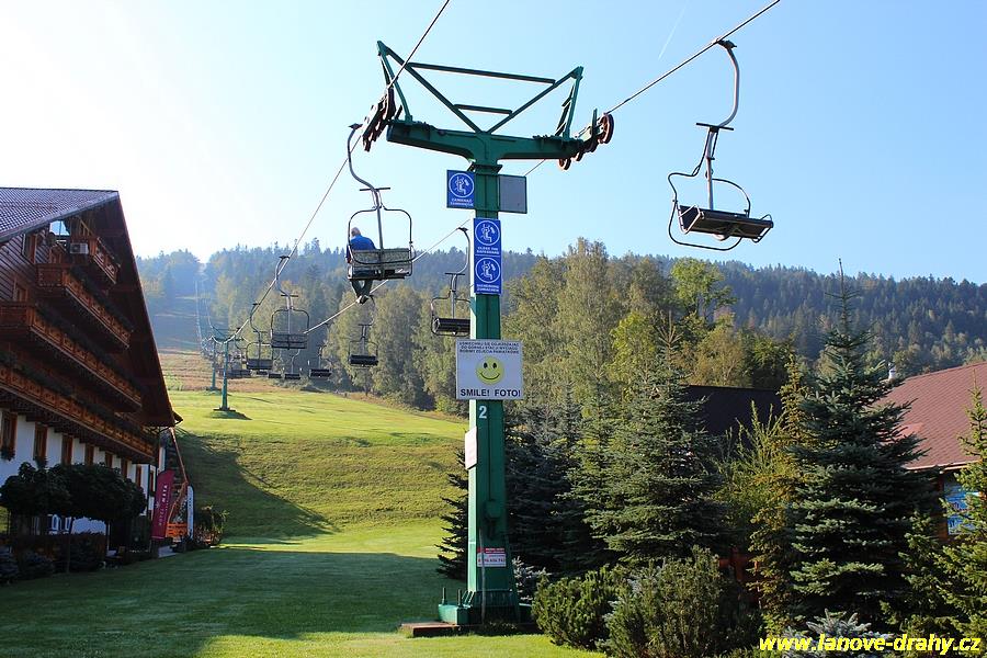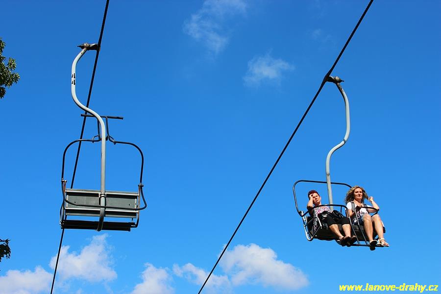 osobní visutá jednolanová dráha oběžného systému s pevným uchycením dvoumístných sedaček |