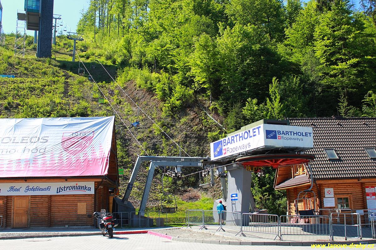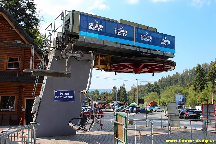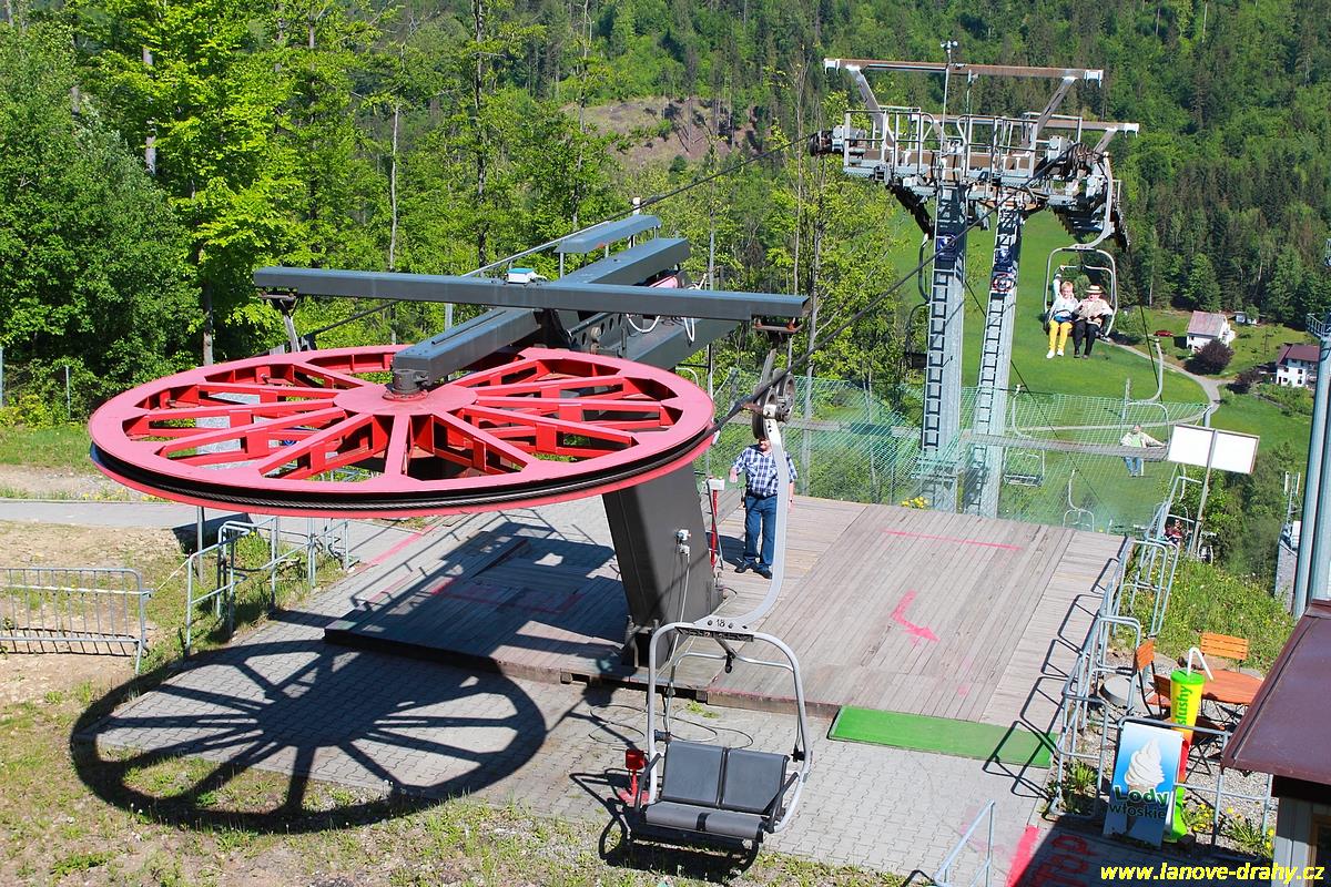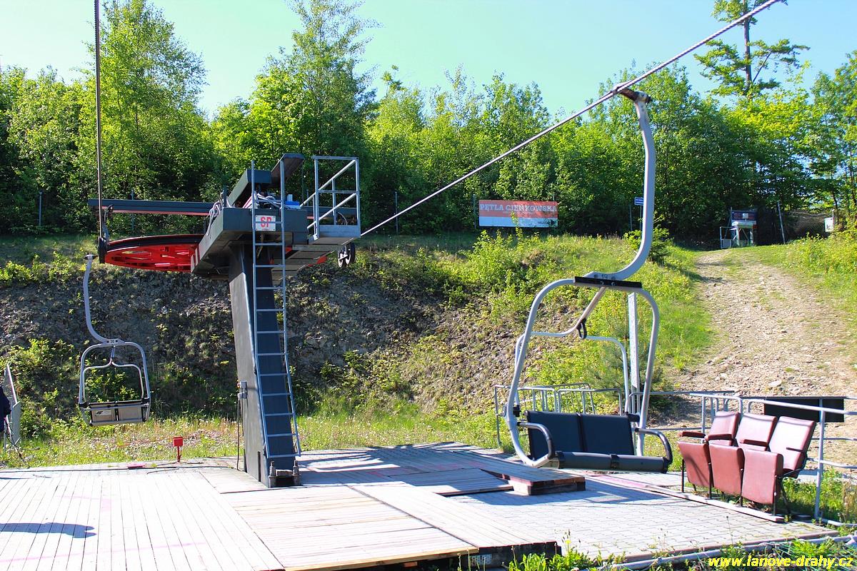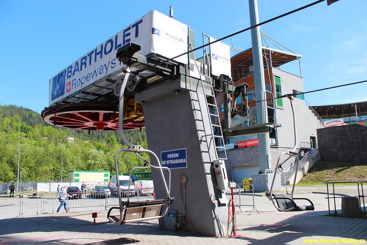 osobní visutá jednolanová dráha oběžného systému s pevným uchycením dvoumístných sedaček |