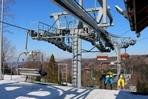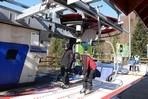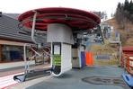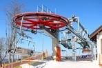 osobní visutá jednolanová dráha oběžného systému s pevným uchycením čtyřmístných sedaček a rozběhovým pásem |