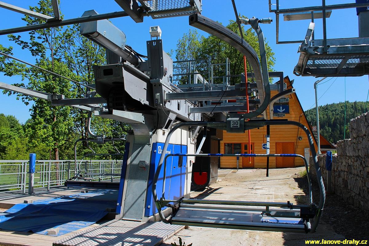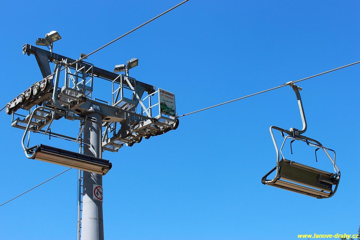 osobní visutá jednolanová dráha oběžného systému s pevným uchycením čtyřmístných sedaček a rozběhovým pásem |