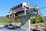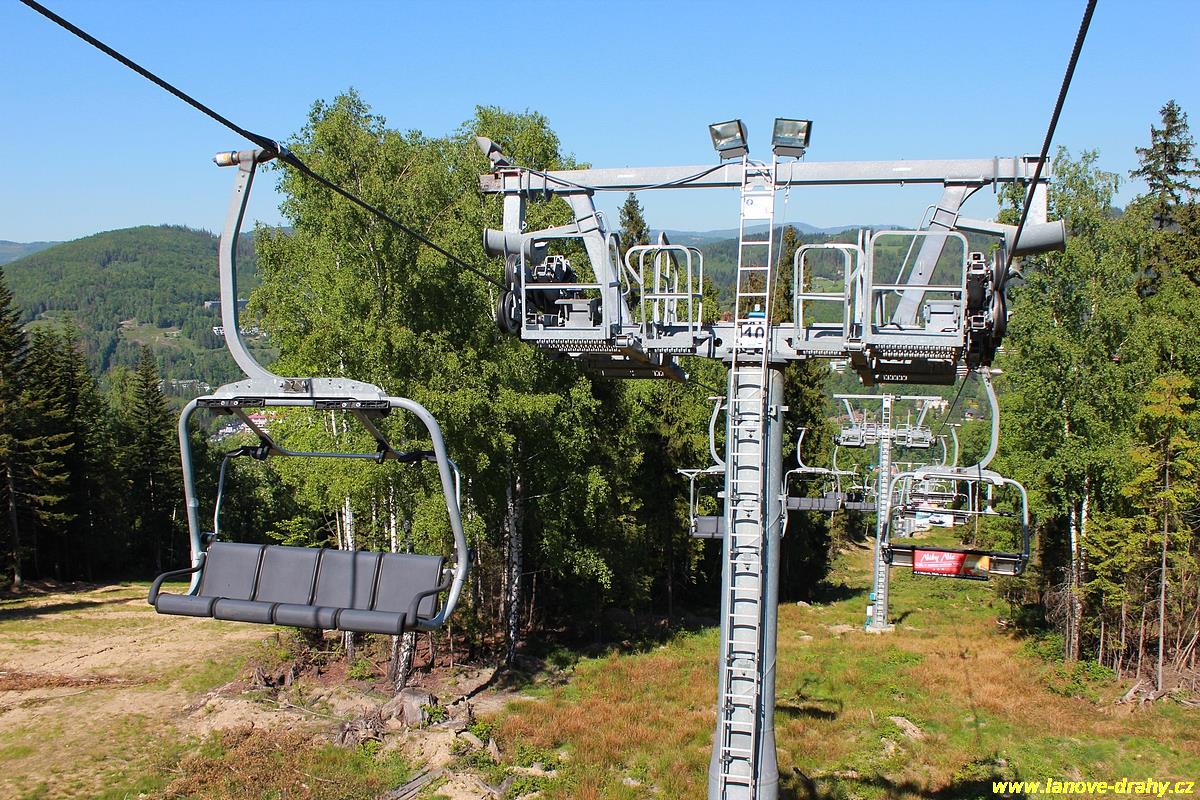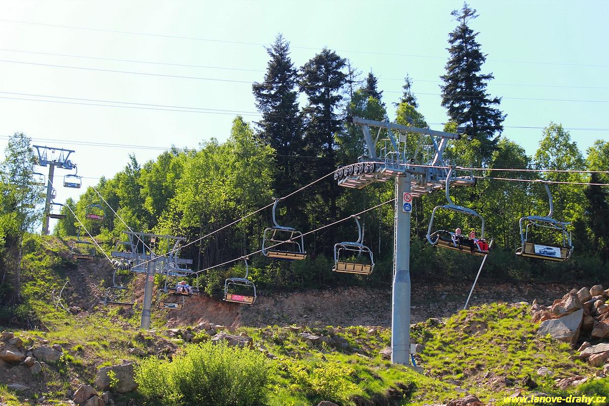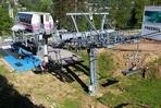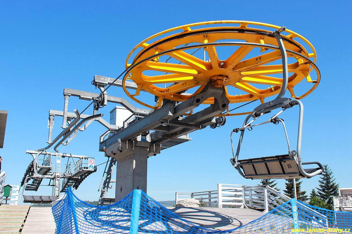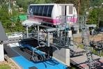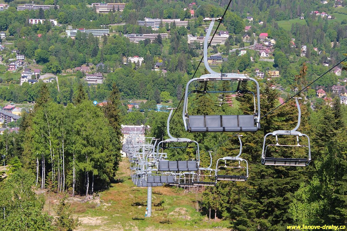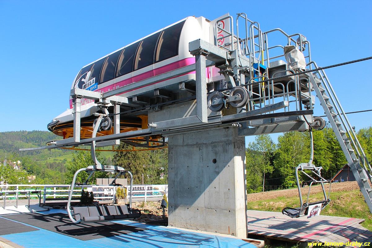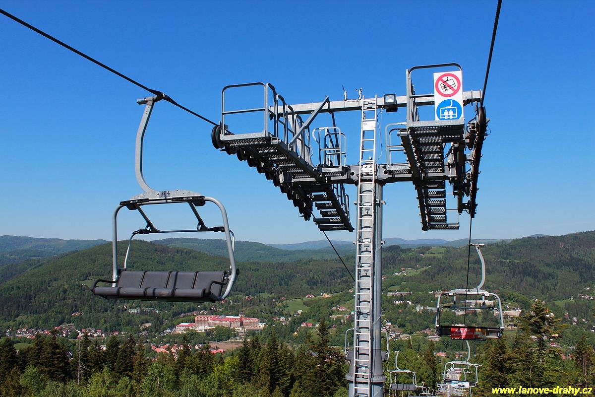 osobní visutá jednolanová dráha oběžného systému s pevným uchycením čtyřmístných sedaček a rozběhovým pásem |