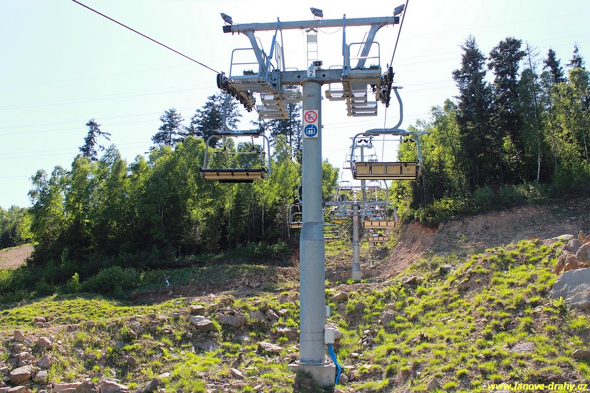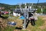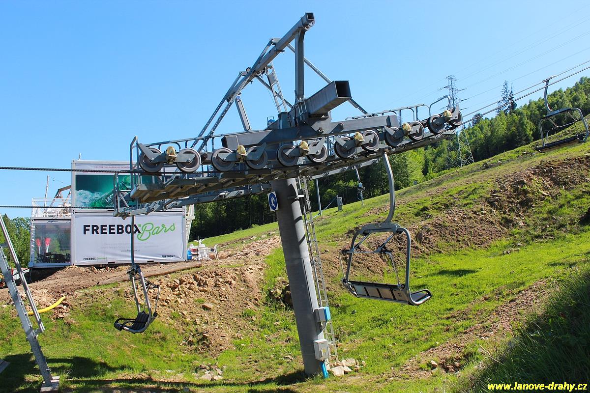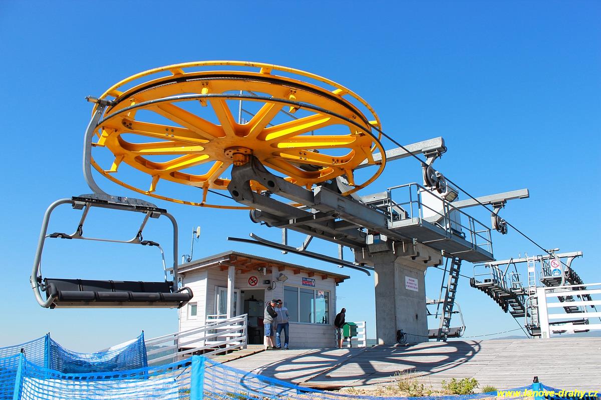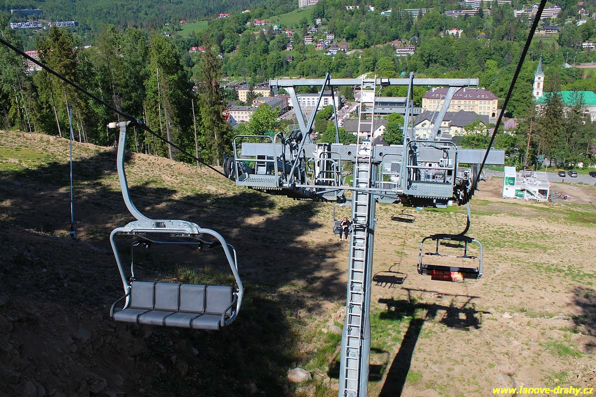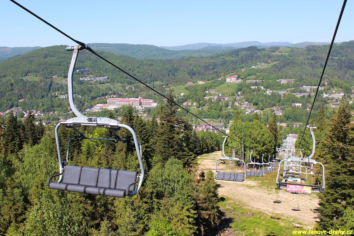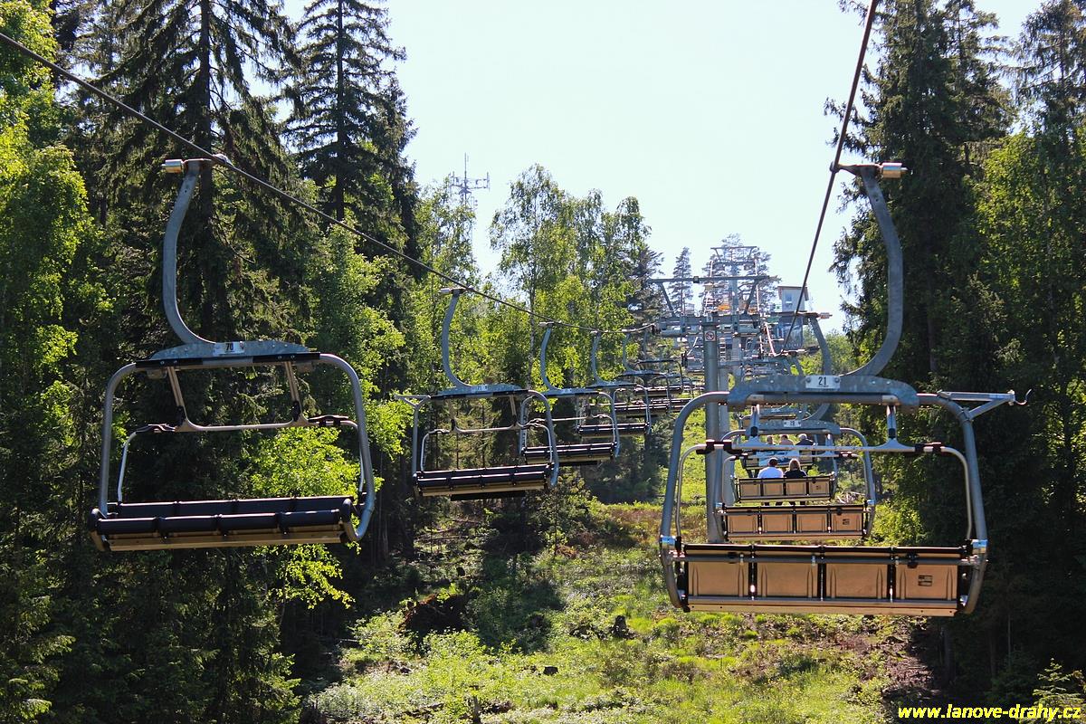 osobní visutá jednolanová dráha oběžného systému s pevným uchycením čtyřmístných sedaček a rozběhovým pásem |