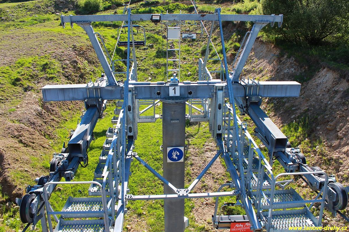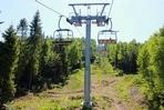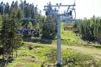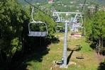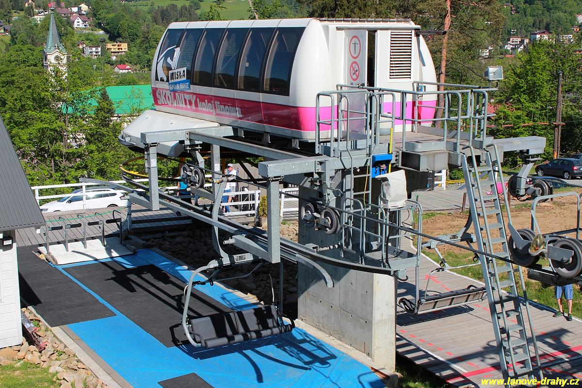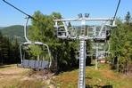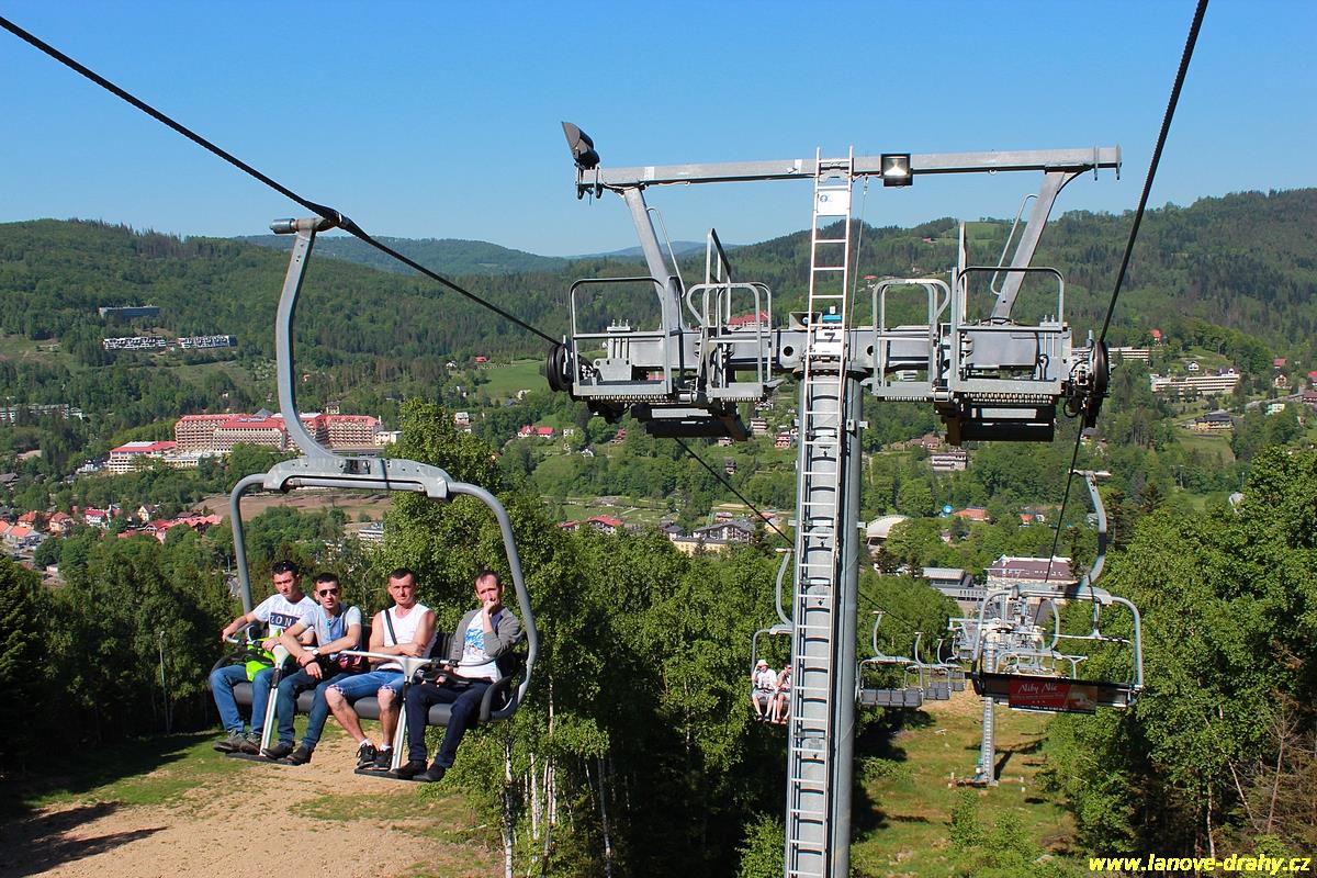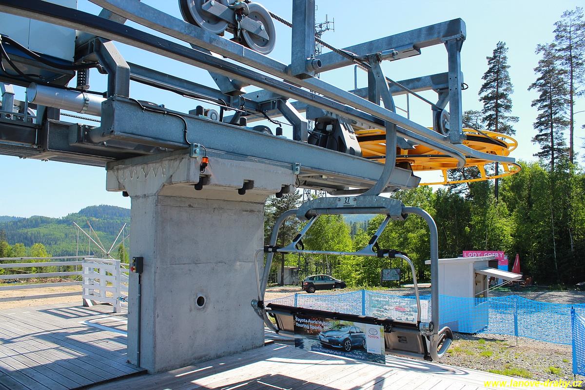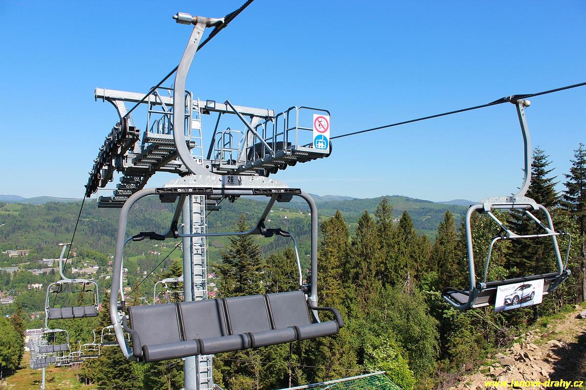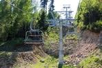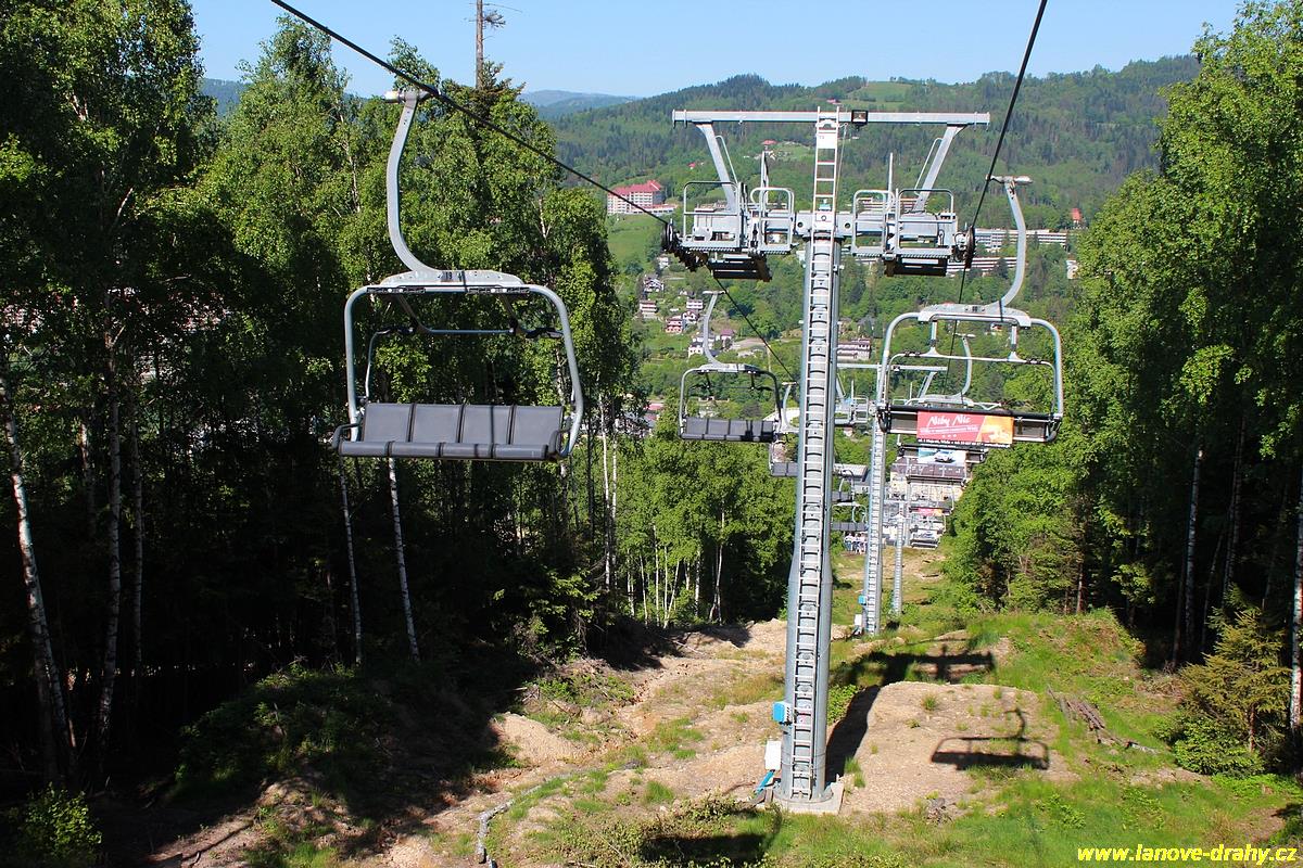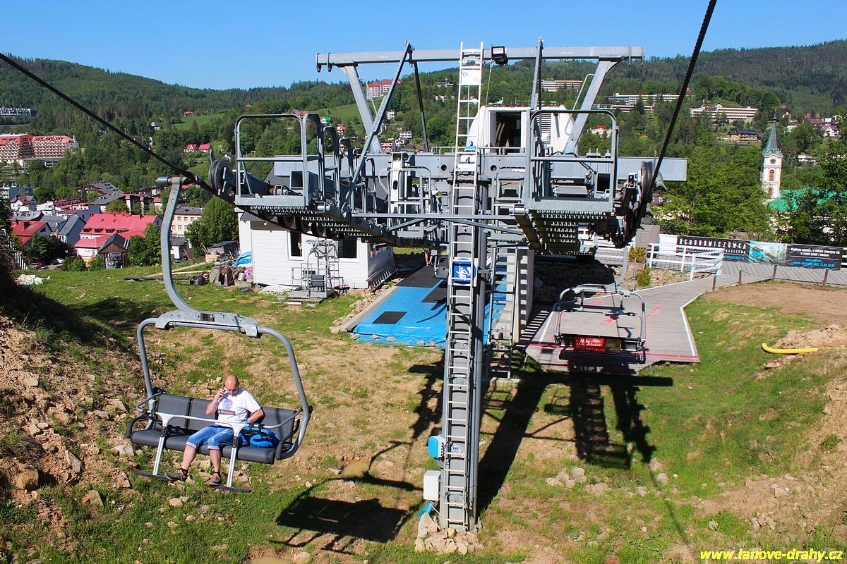 osobní visutá jednolanová dráha oběžného systému s pevným uchycením čtyřmístných sedaček a rozběhovým pásem |