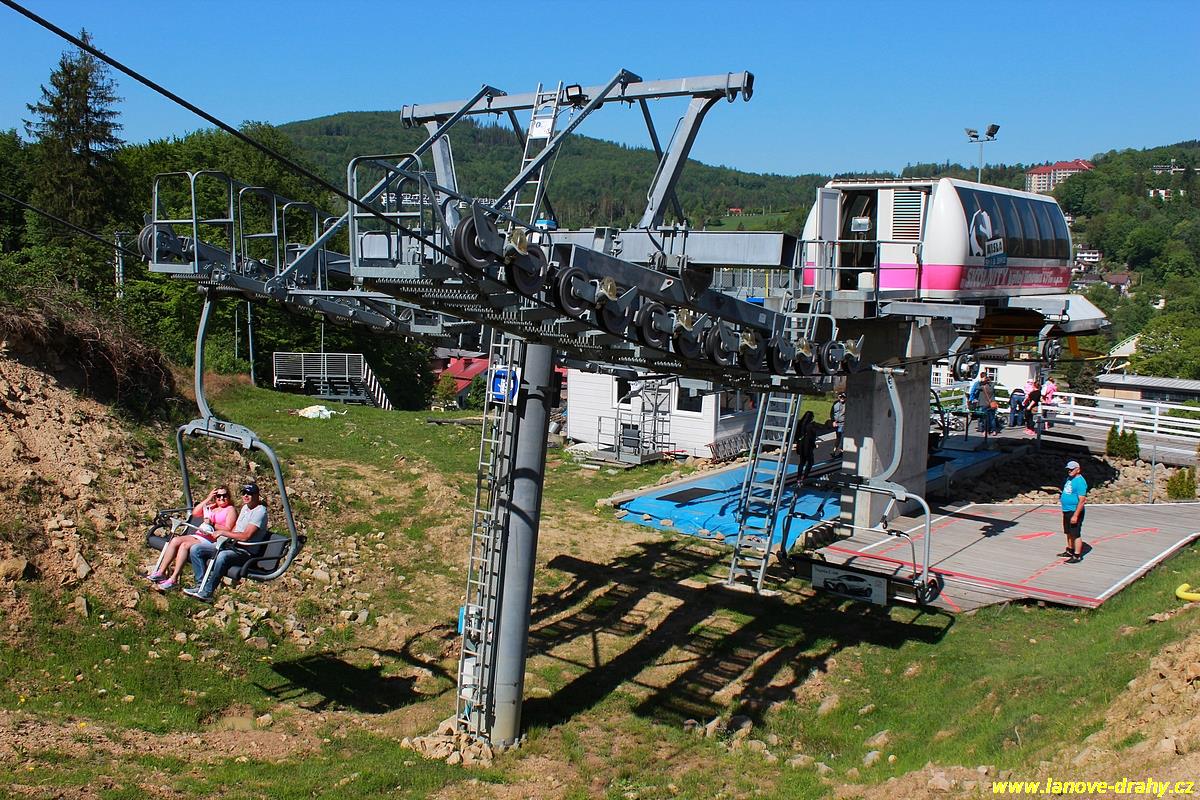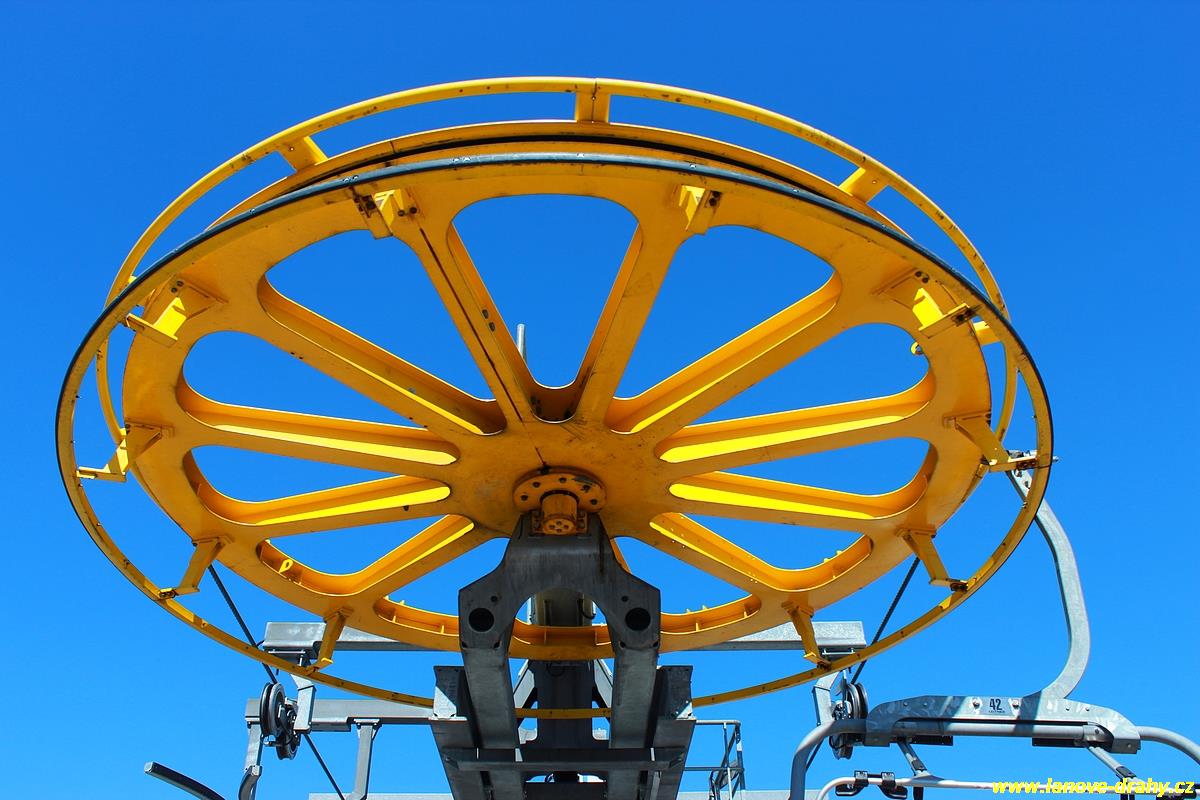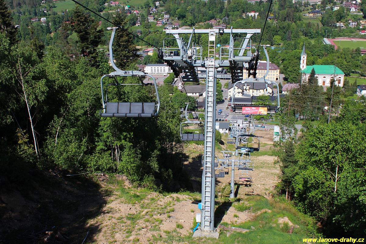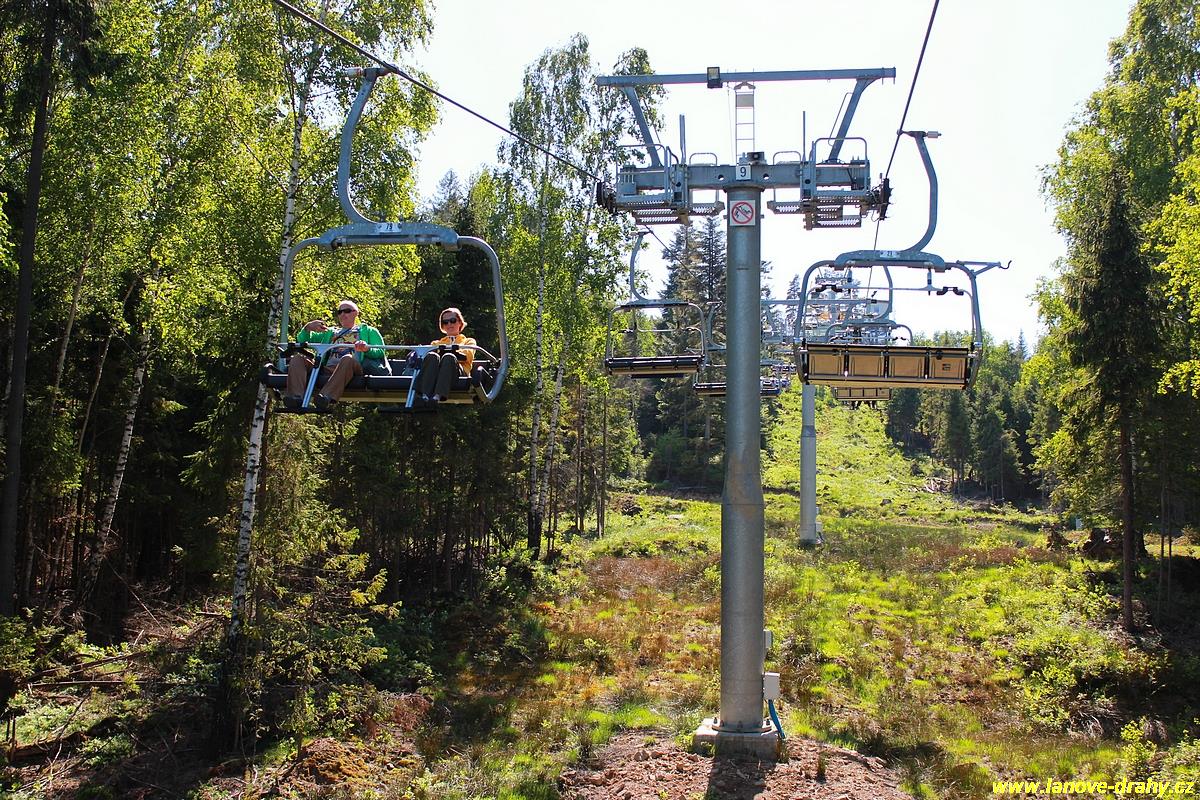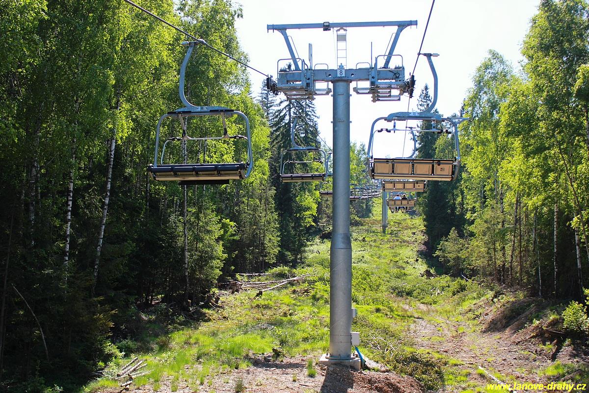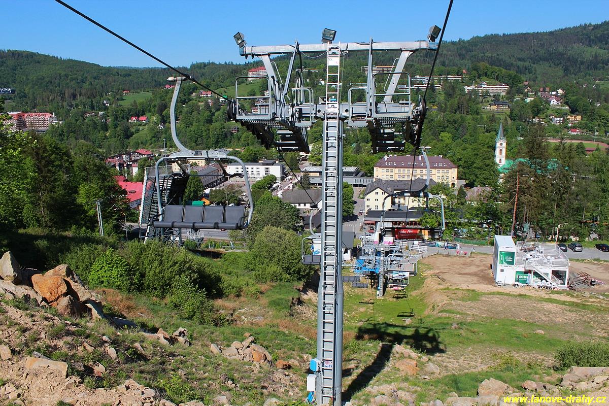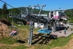osobní visutá jednolanová dráha oběžného systému s pevným uchycením čtyřmístných sedaček a rozběhovým pásem |