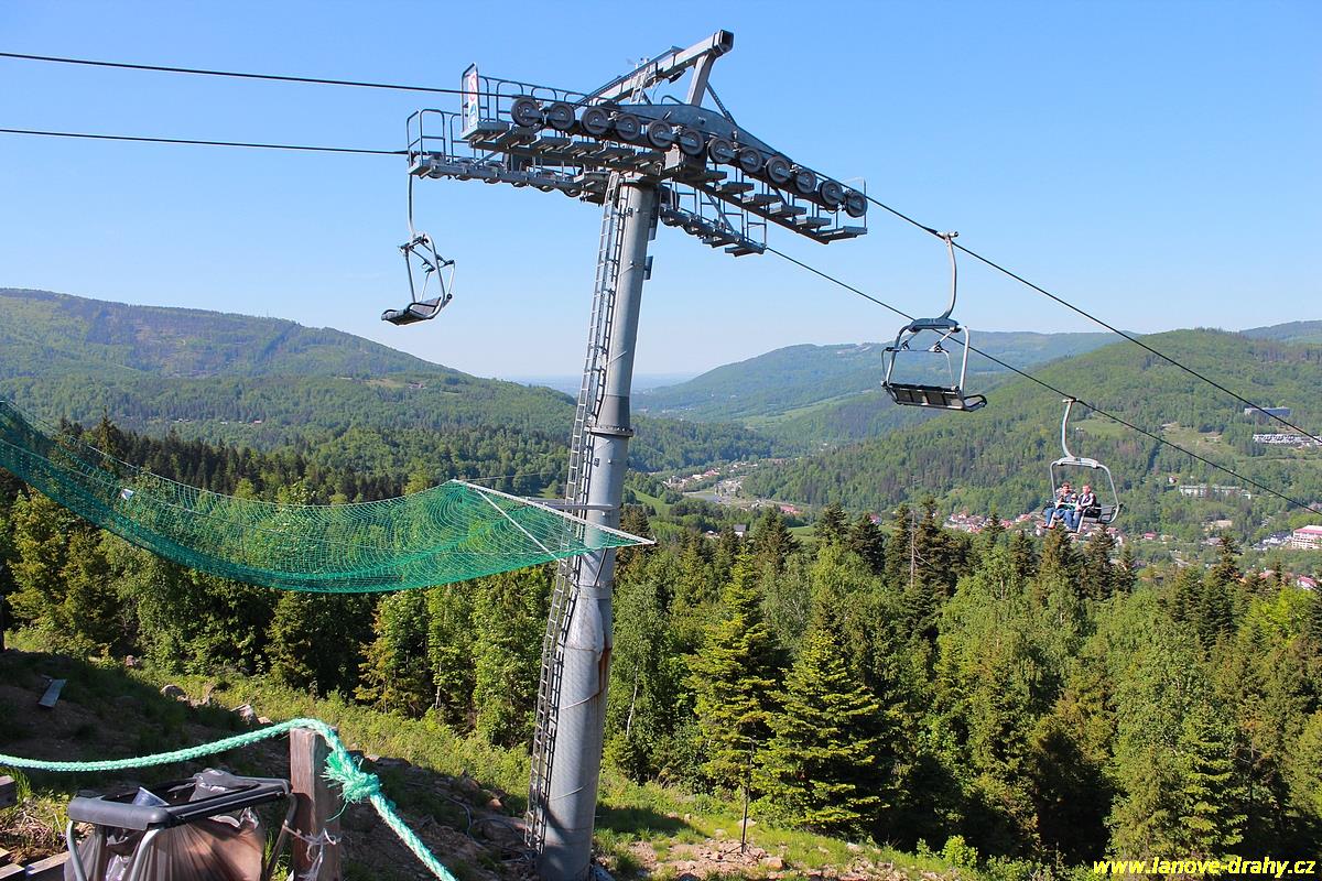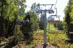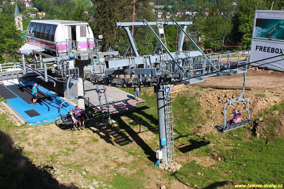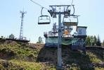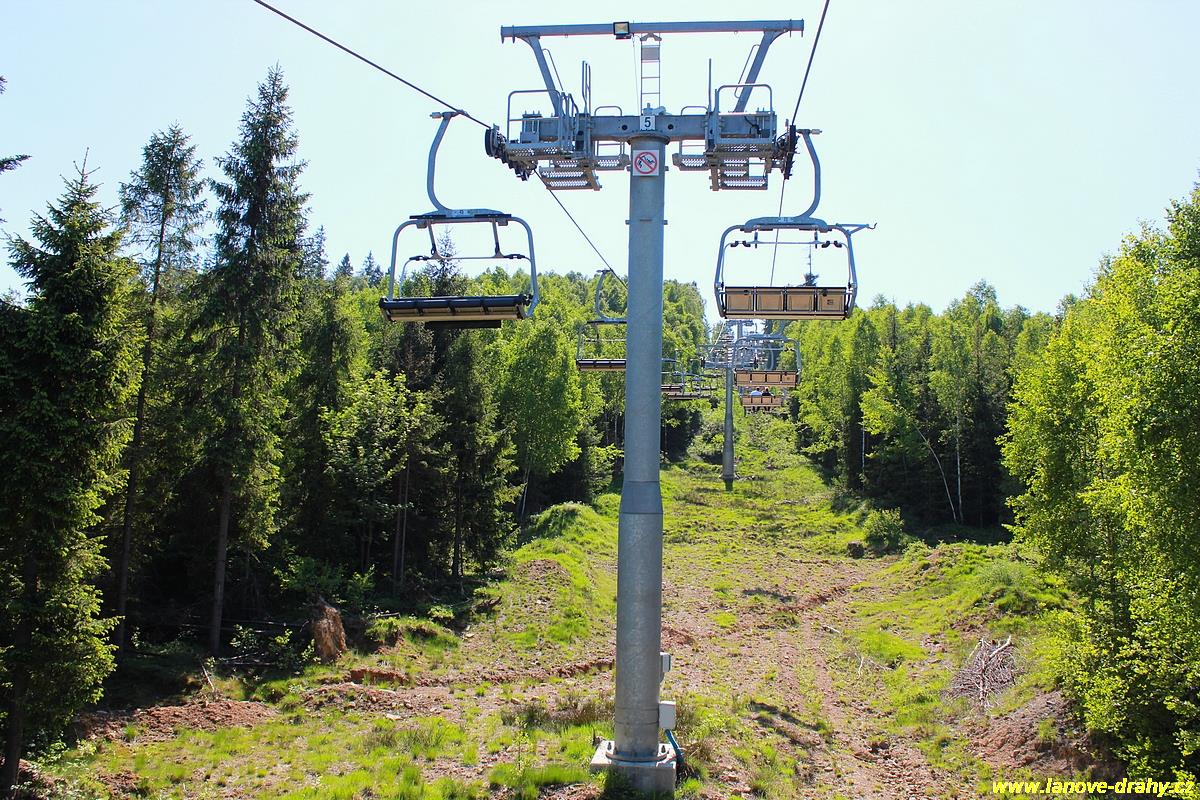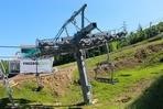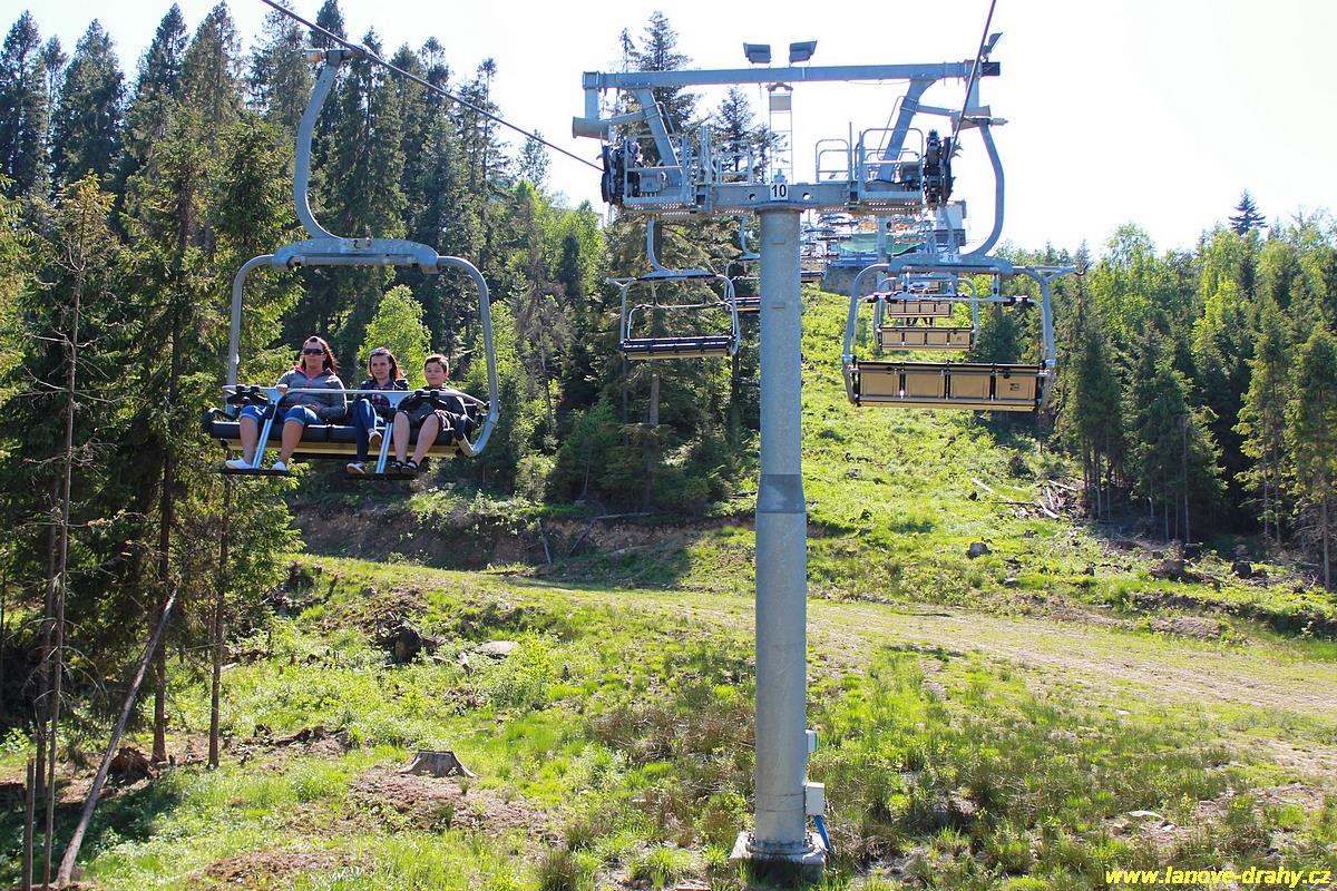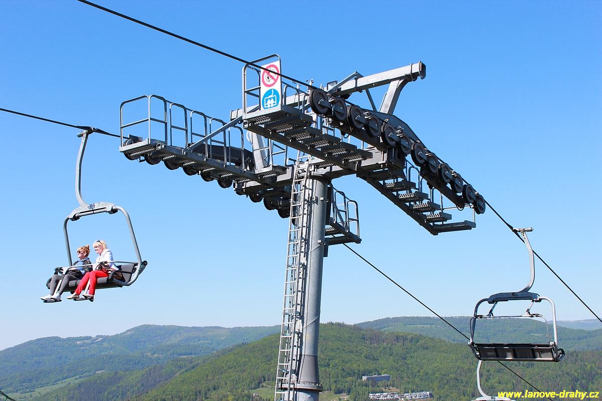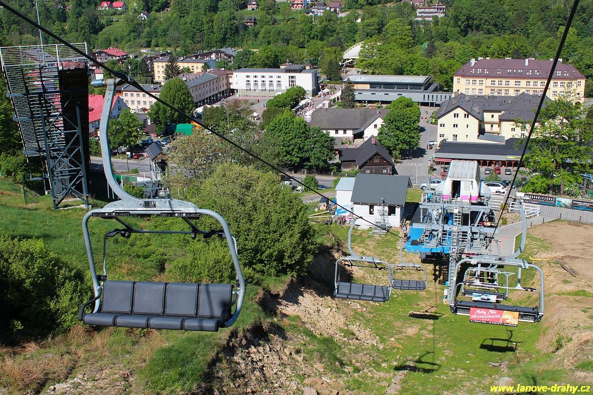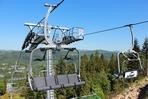 osobní visutá jednolanová dráha oběžného systému s pevným uchycením čtyřmístných sedaček a rozběhovým pásem |