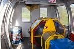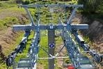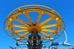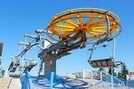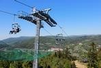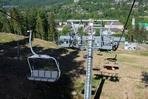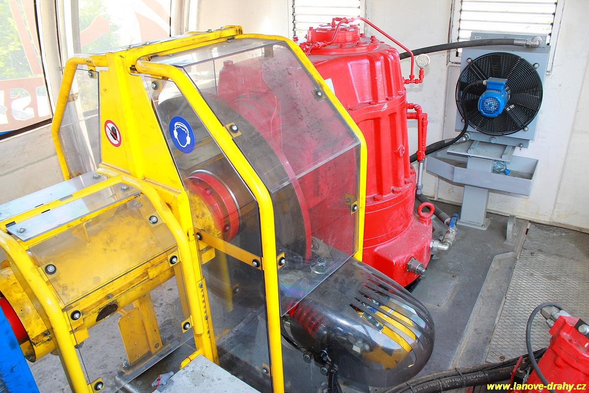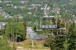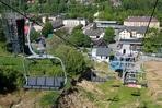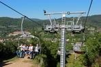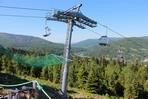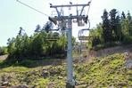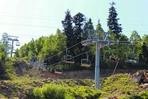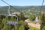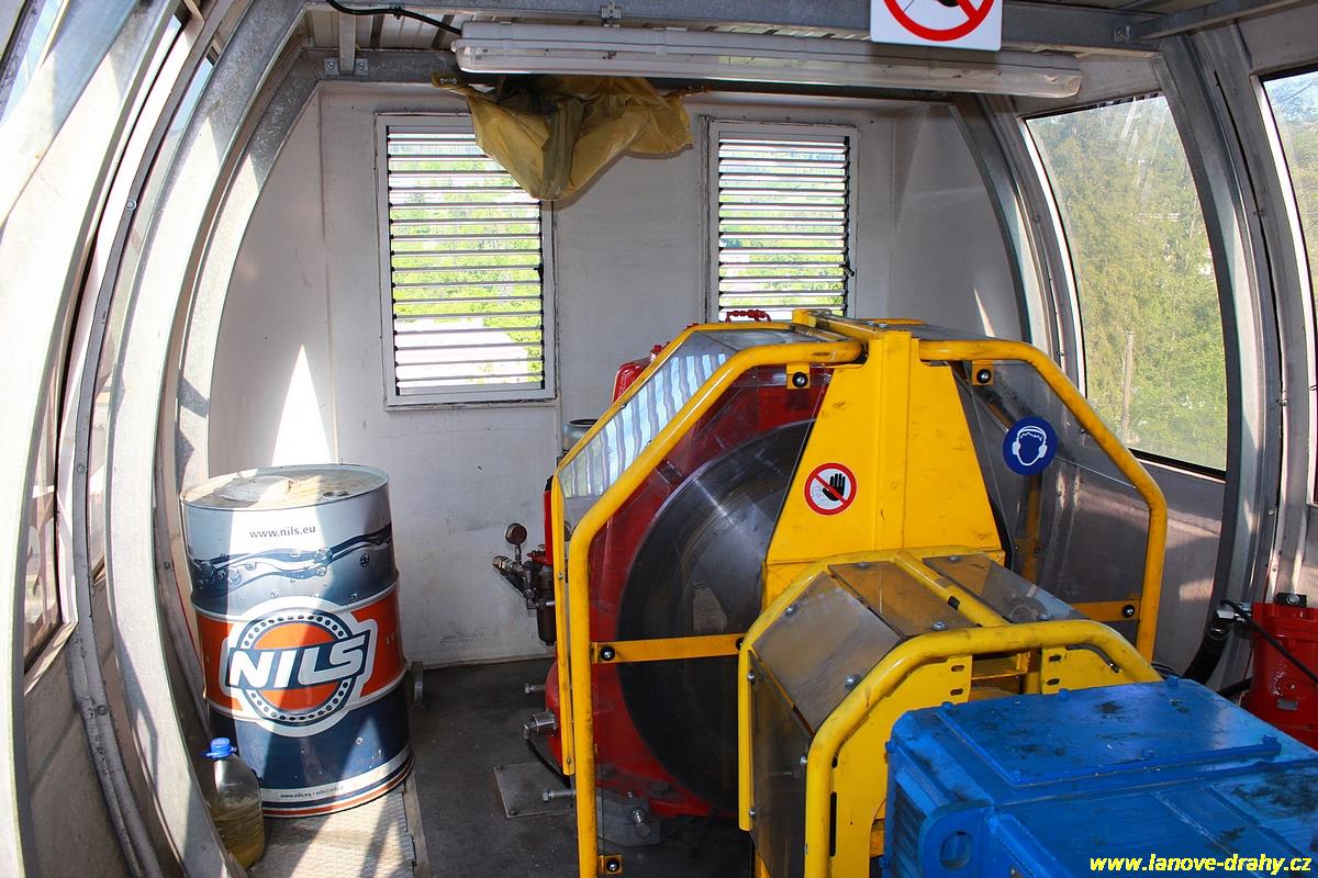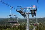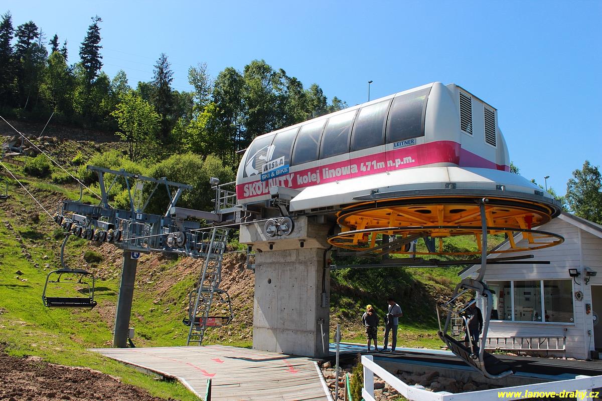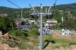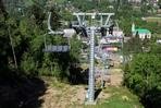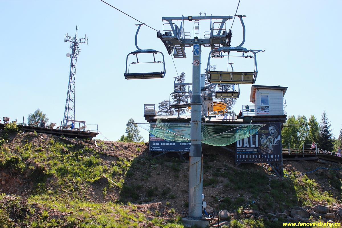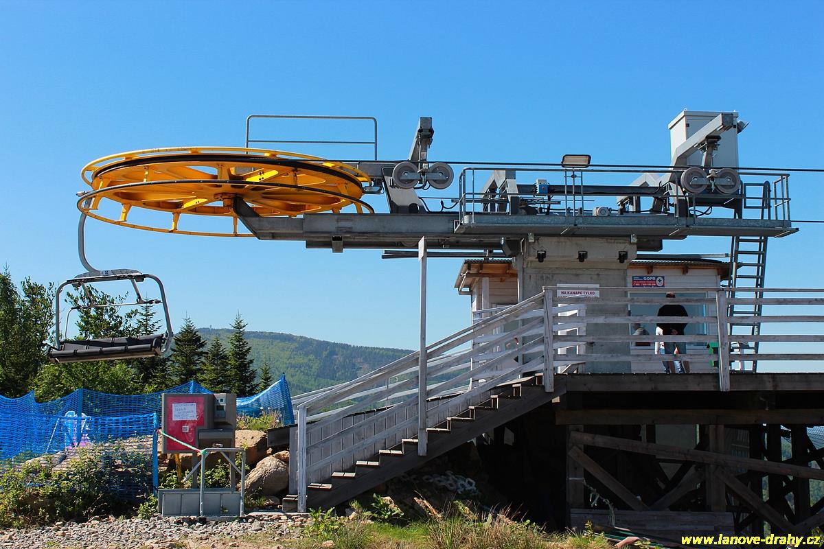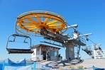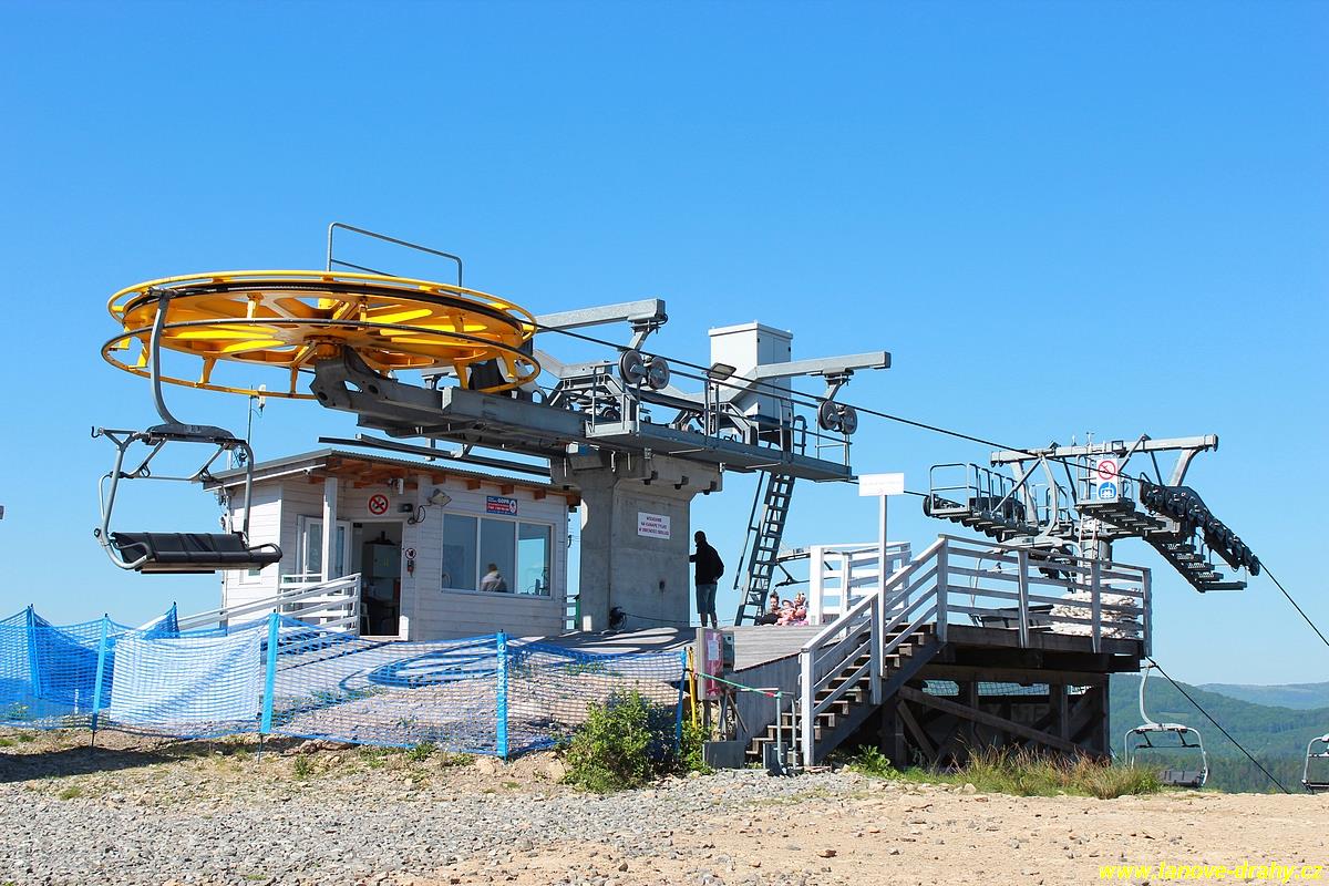 osobní visutá jednolanová dráha oběžného systému s pevným uchycením čtyřmístných sedaček a rozběhovým pásem |
