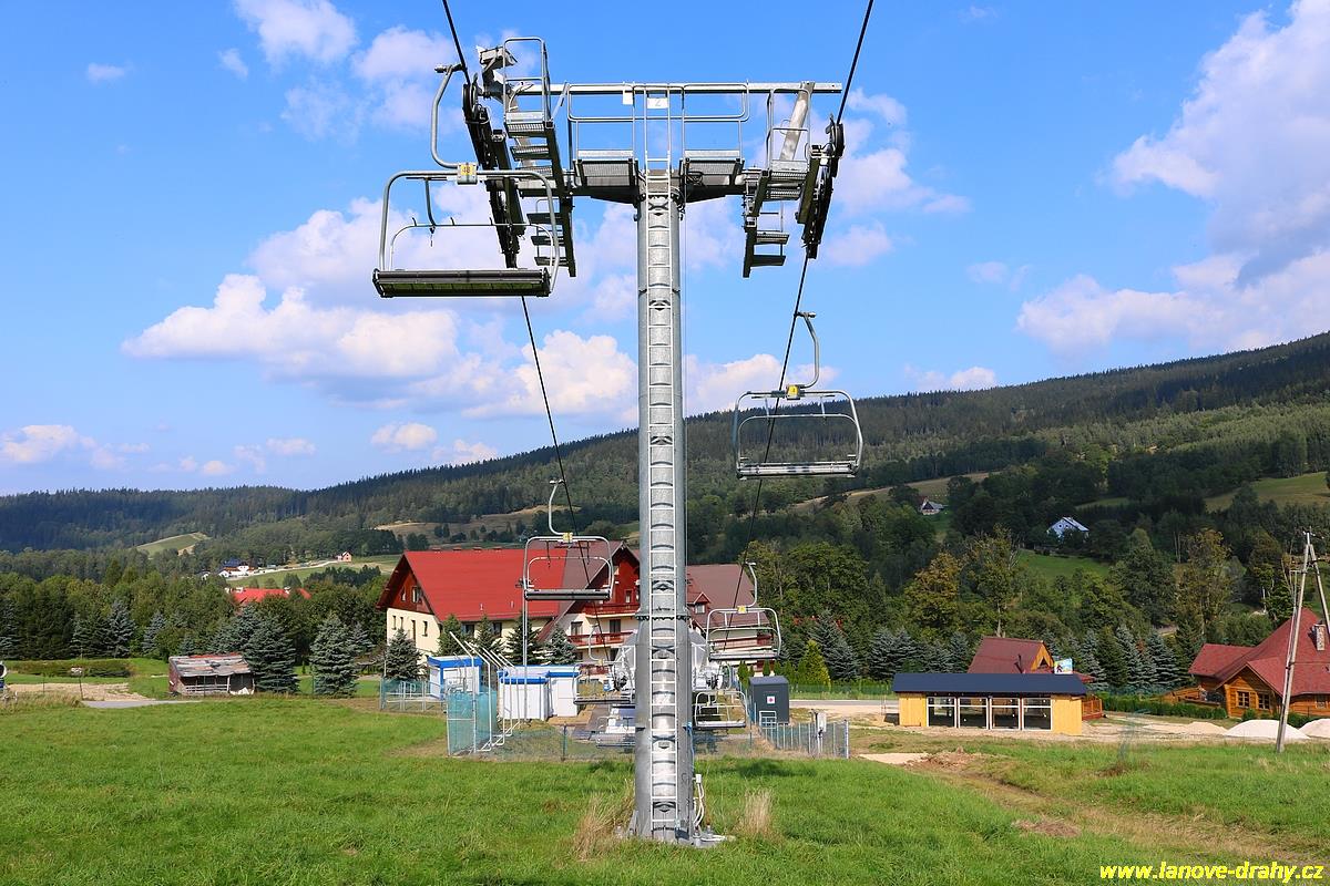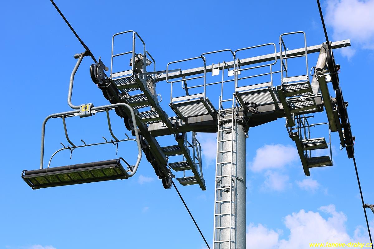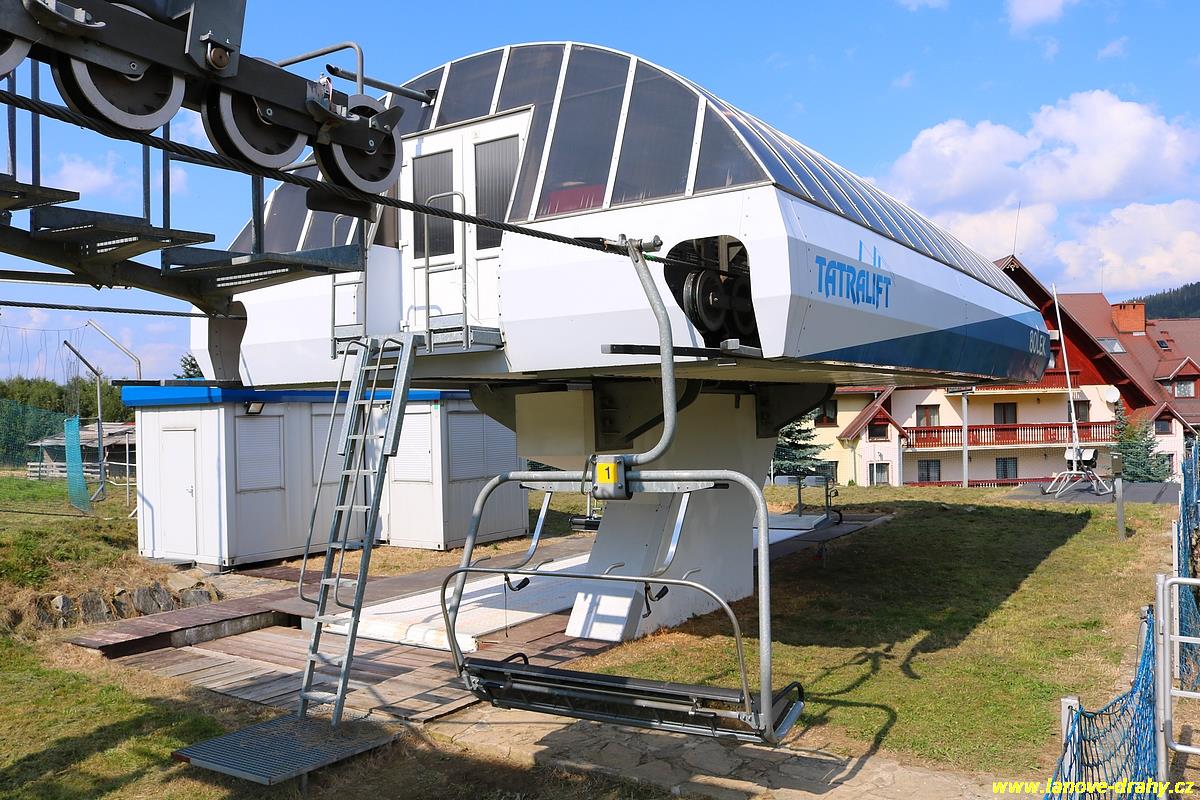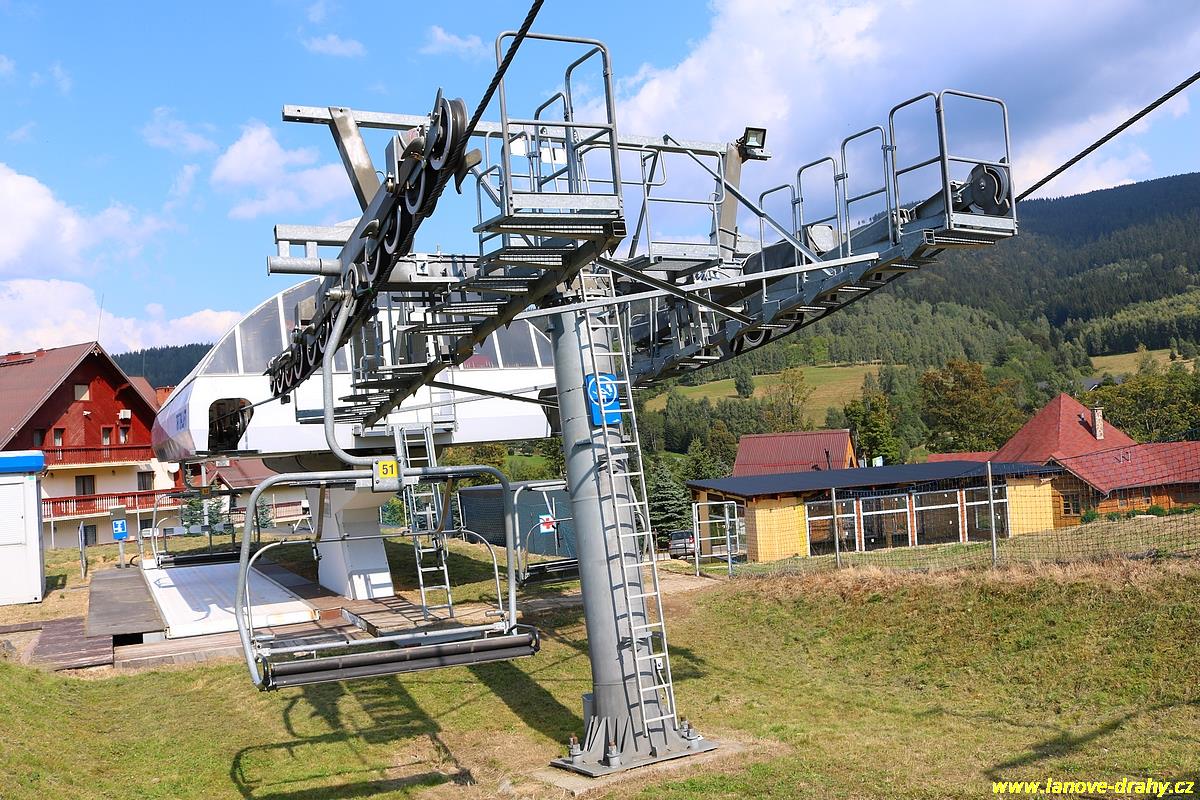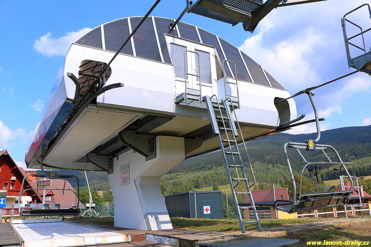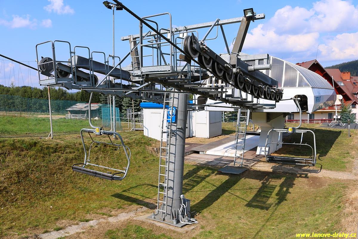 osobní visutá jednolanová dráha oběžného systému s pevným uchycením čtyřmístných sedaček a rozběhovým pásem |