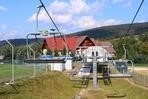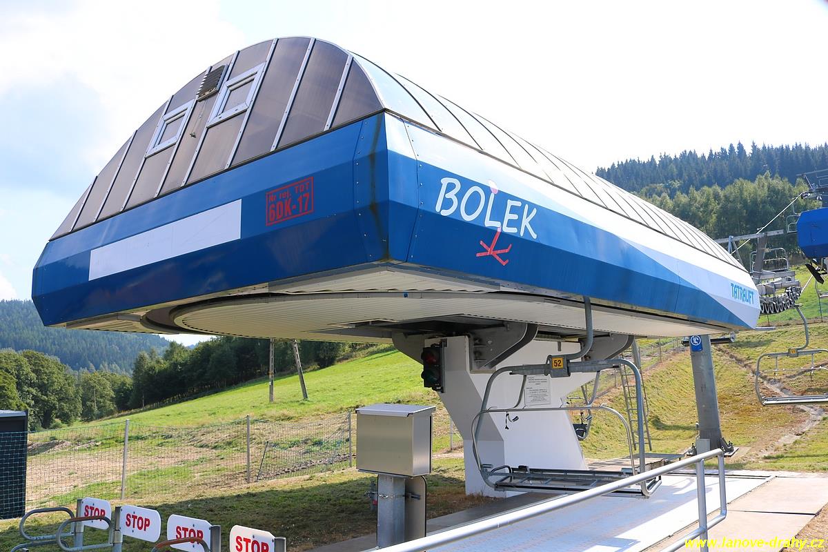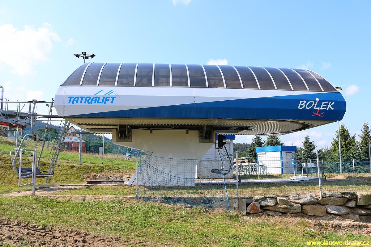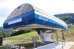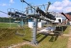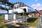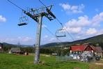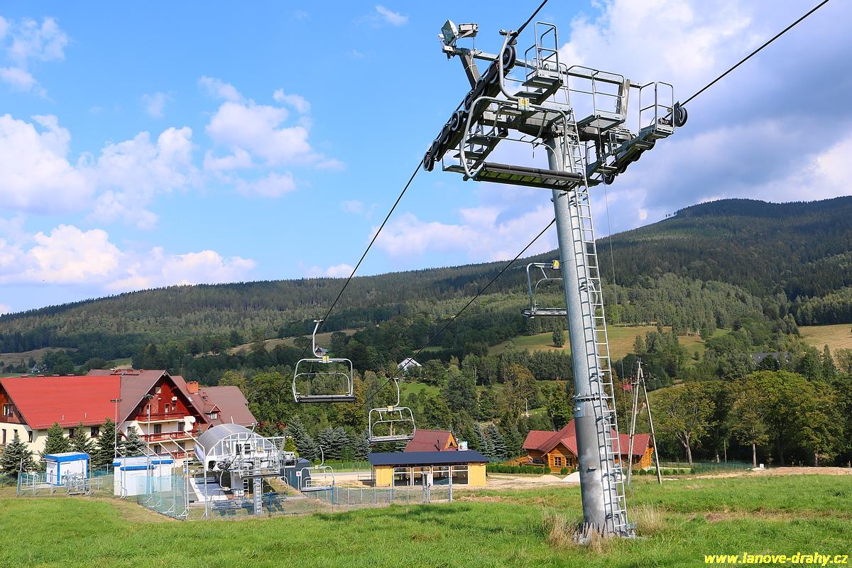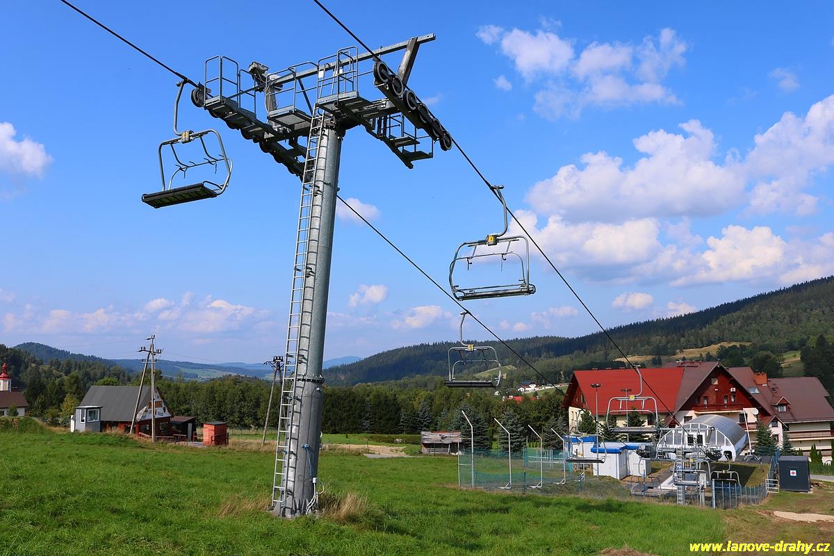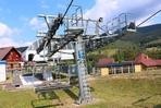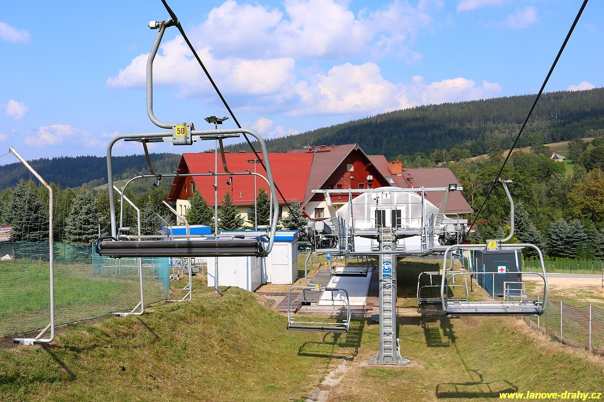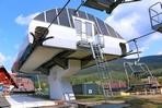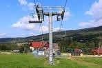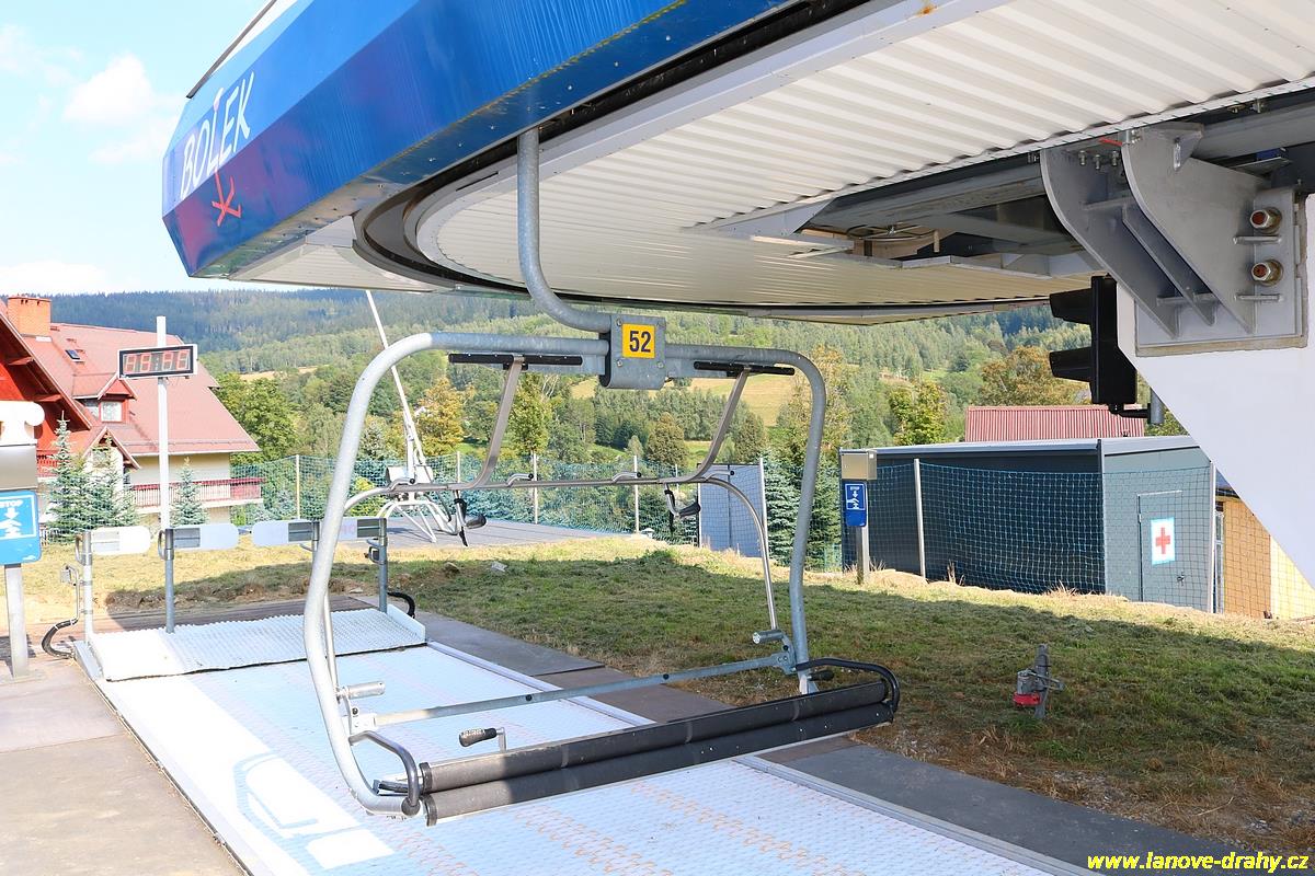 osobní visutá jednolanová dráha oběžného systému s pevným uchycením čtyřmístných sedaček a rozběhovým pásem |