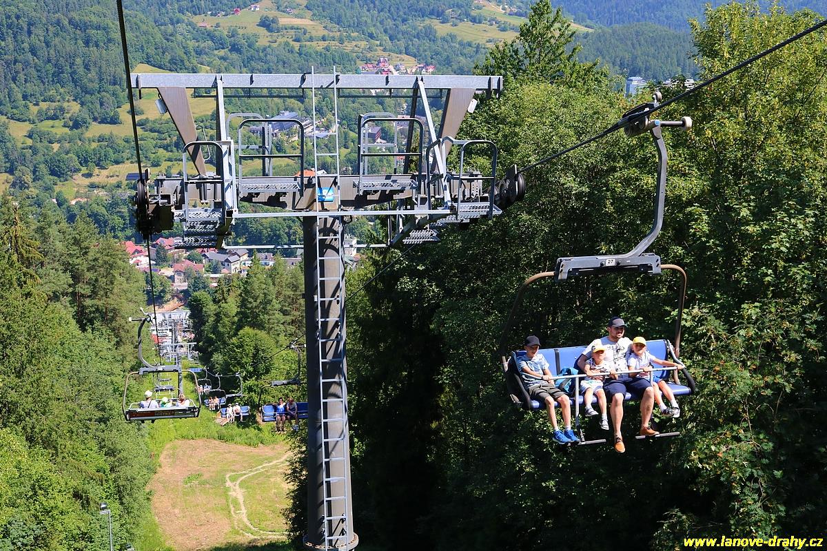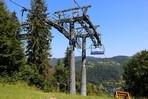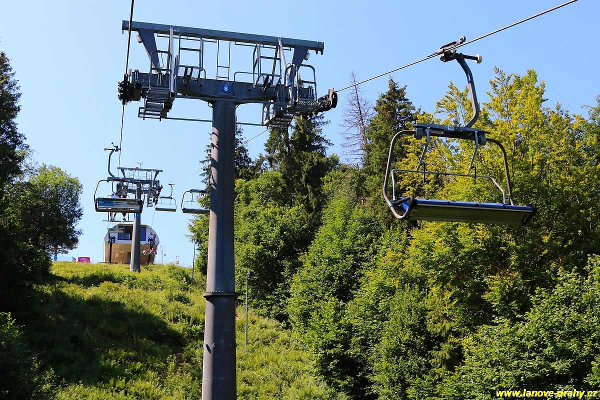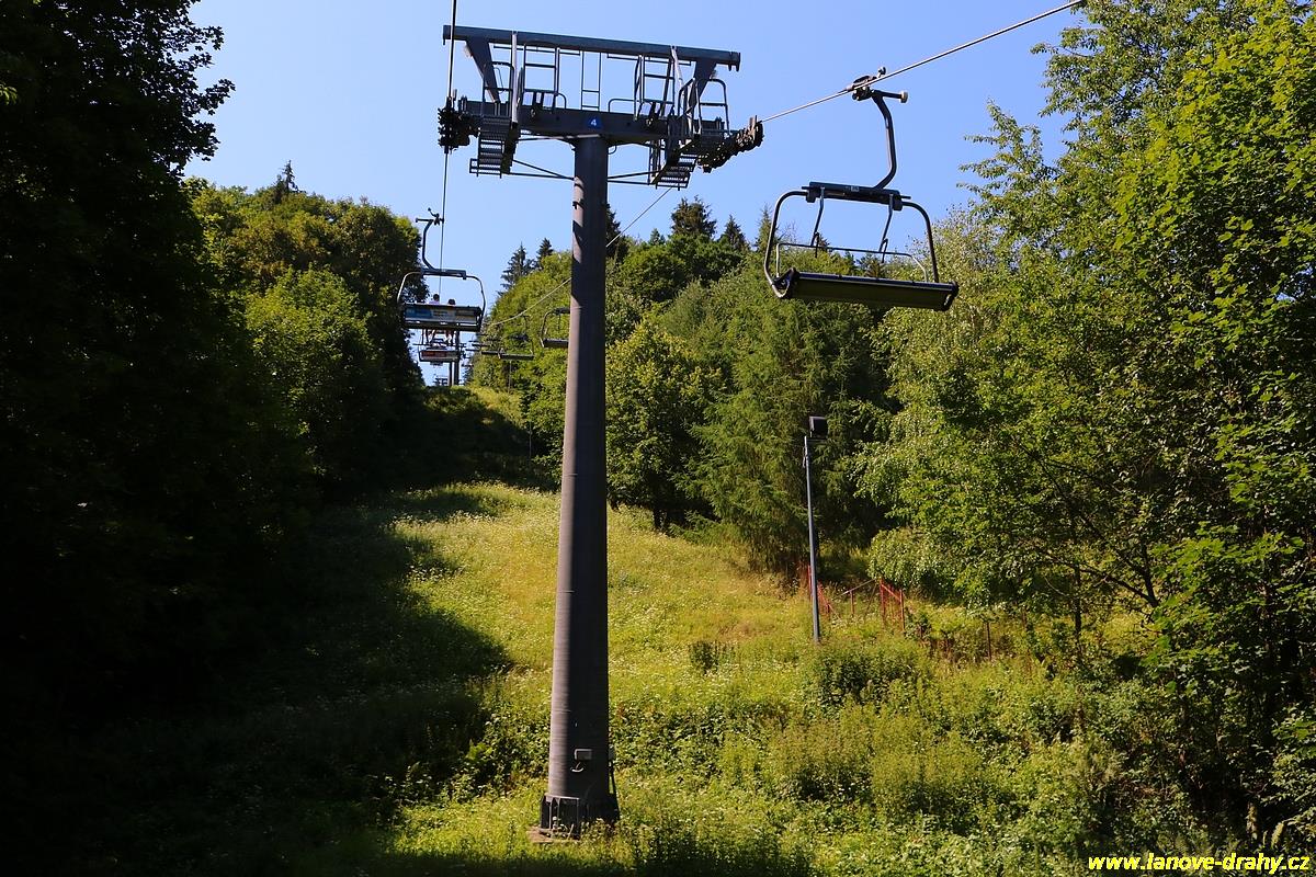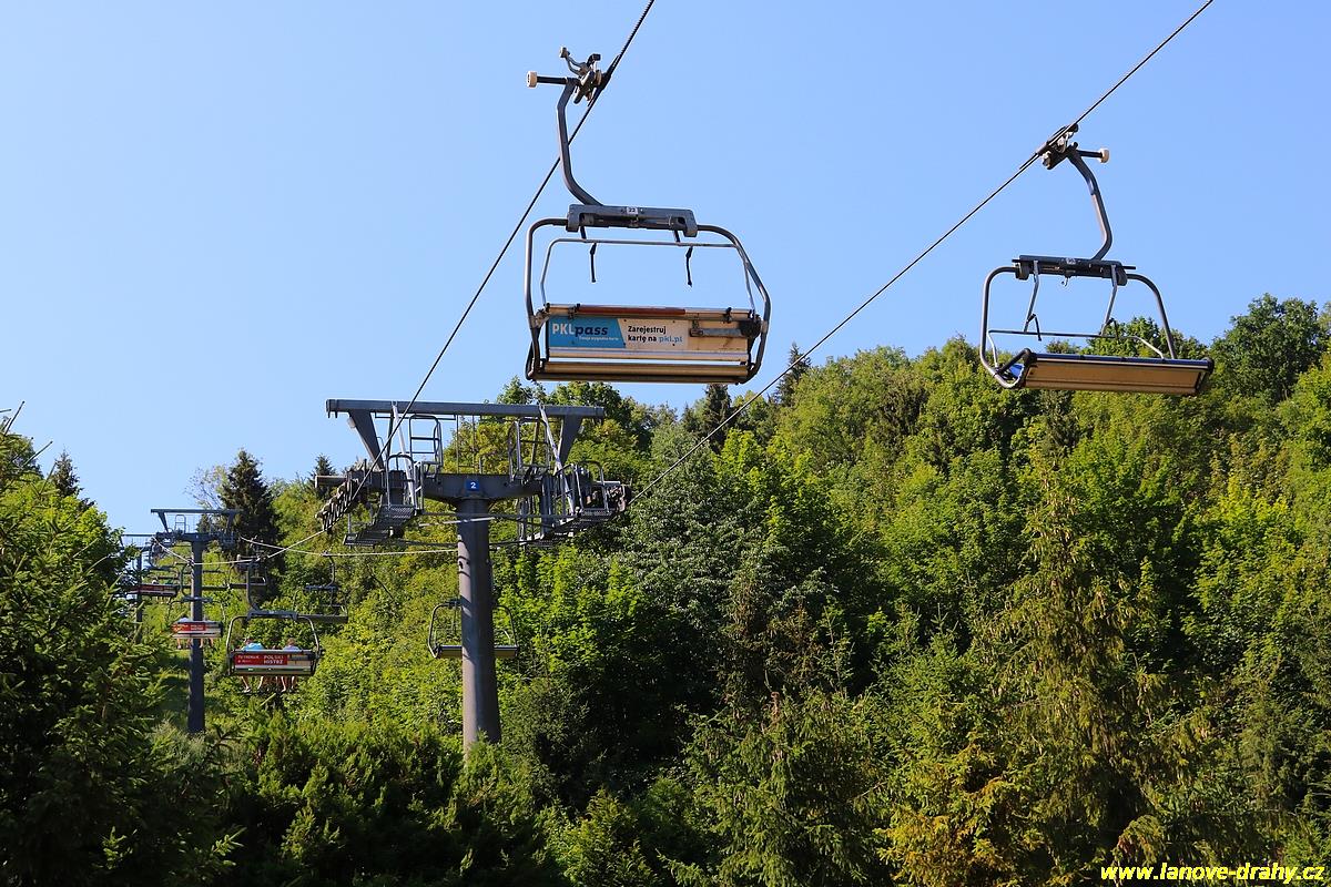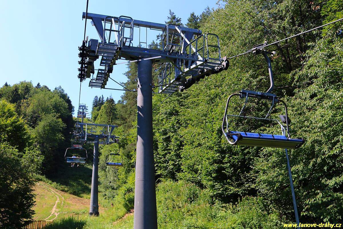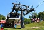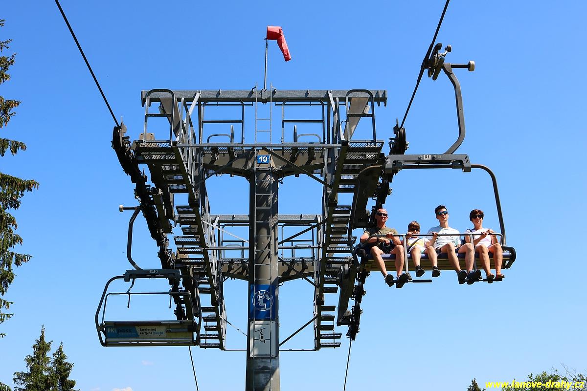 osobní visutá jednolanová dráha oběžného systému s odpojitelným uchycením čtyřmístných sedaček |
