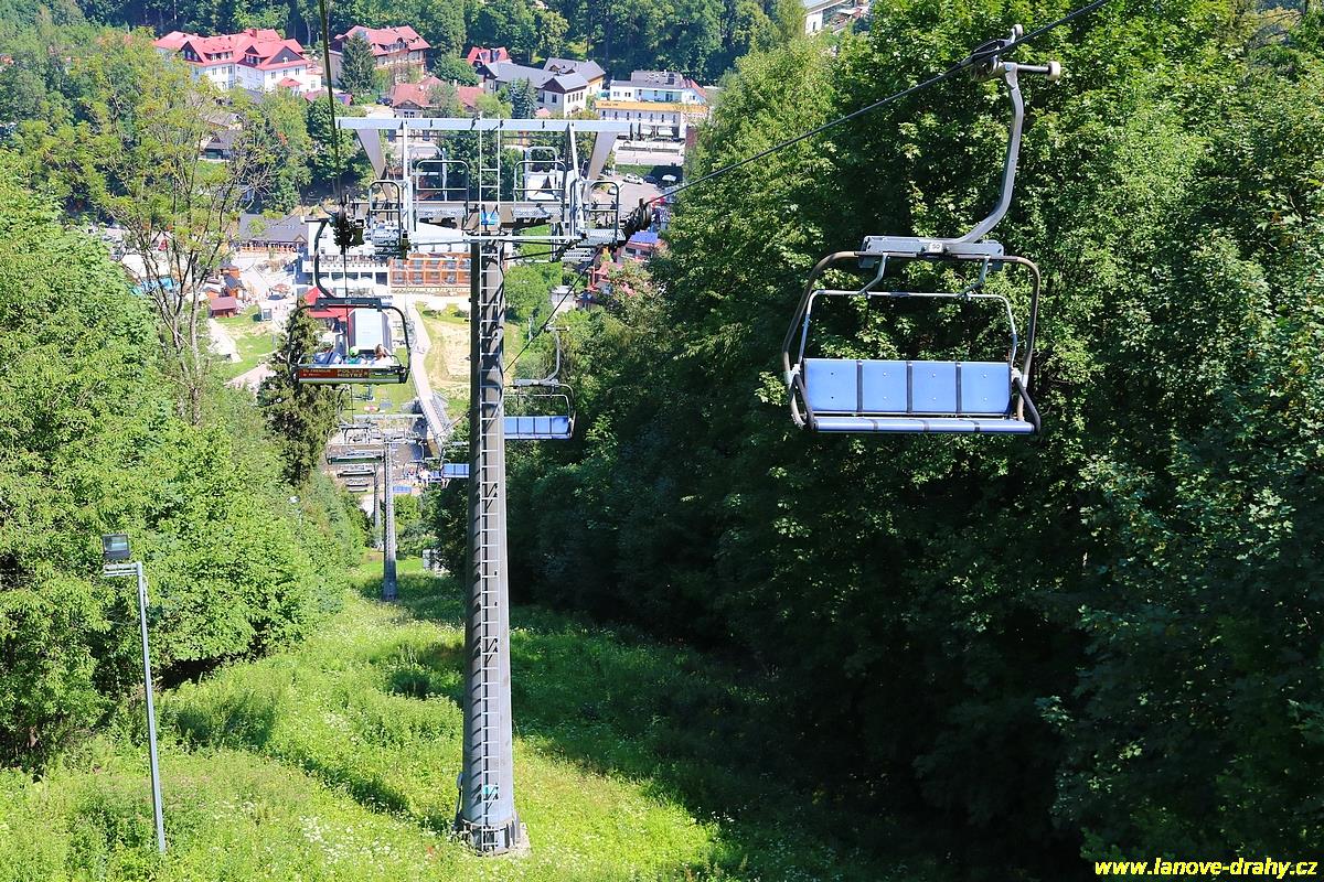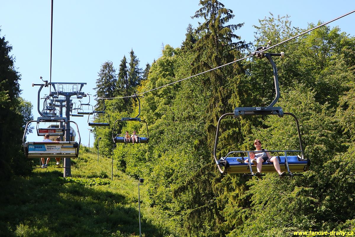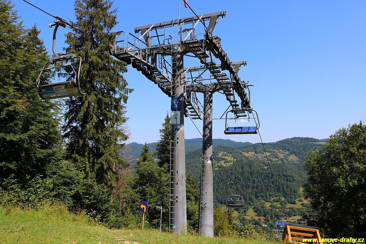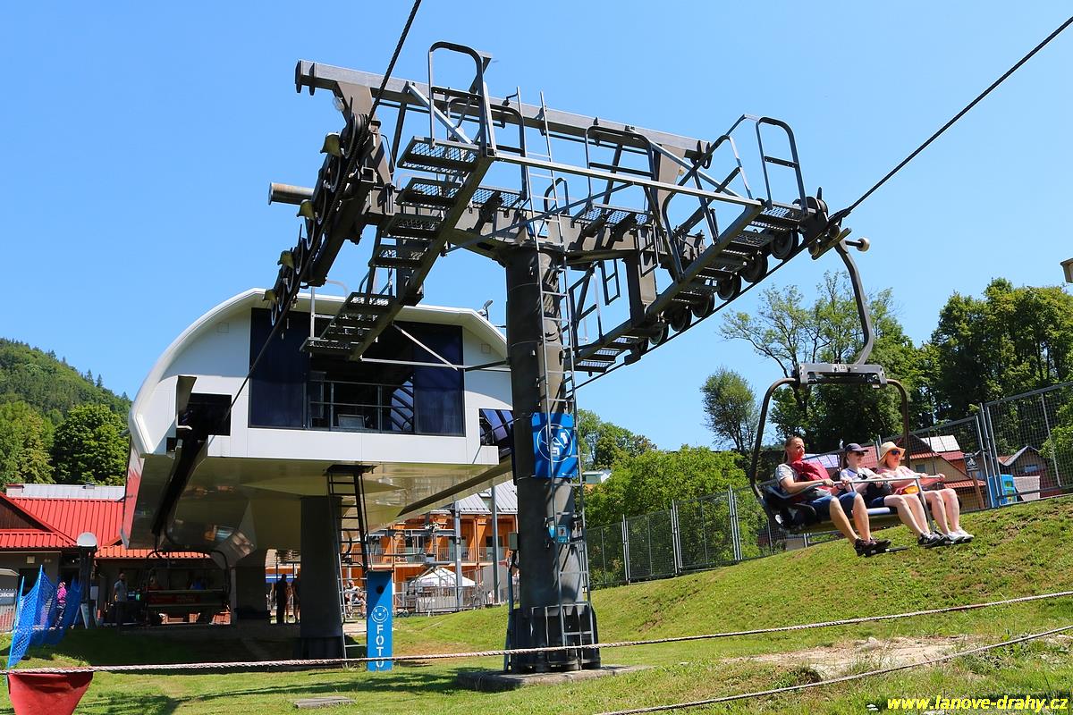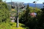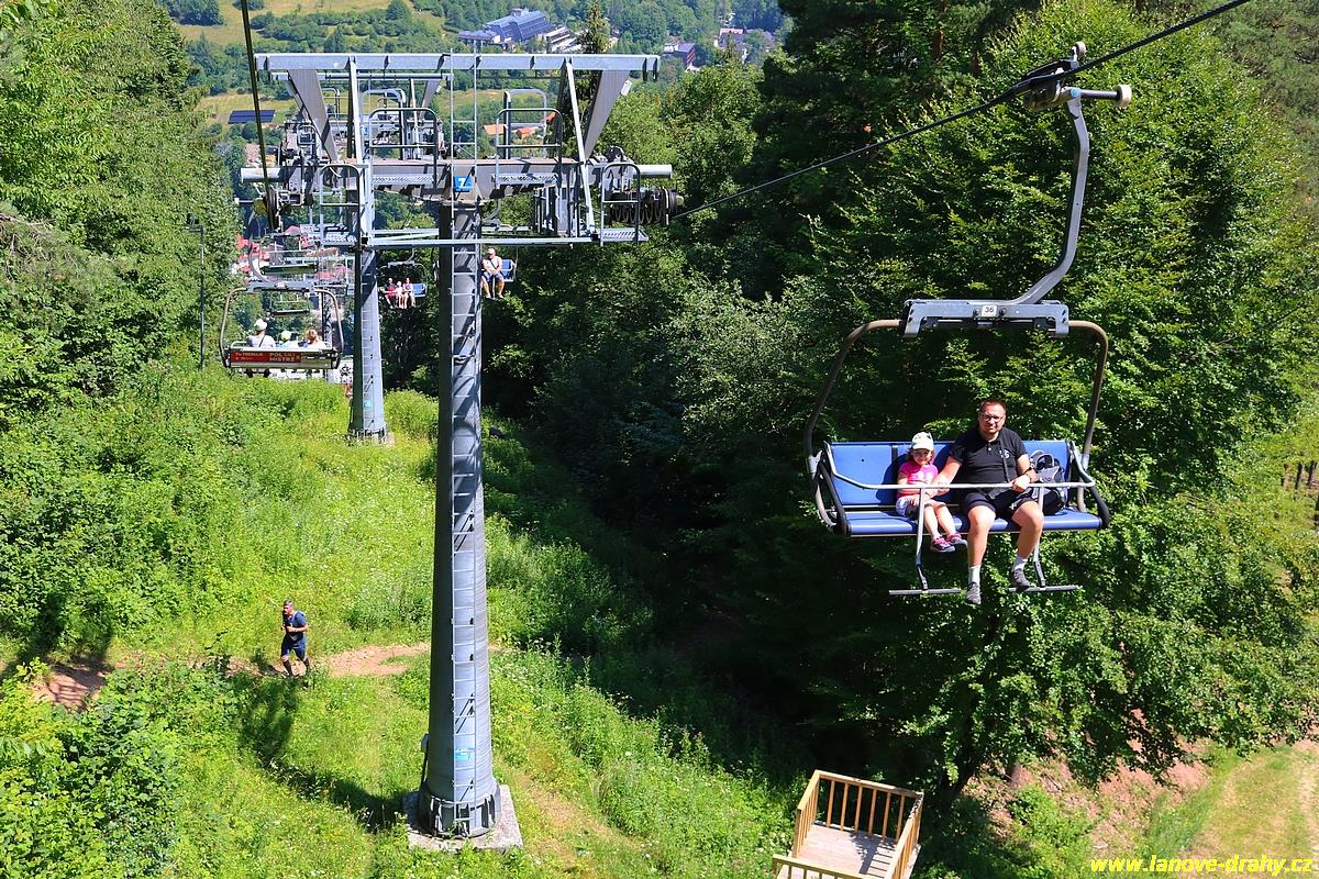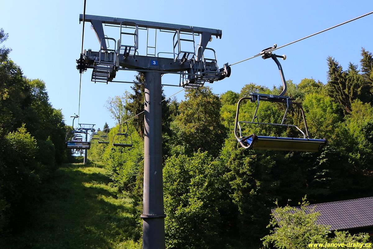 osobní visutá jednolanová dráha oběžného systému s odpojitelným uchycením čtyřmístných sedaček |