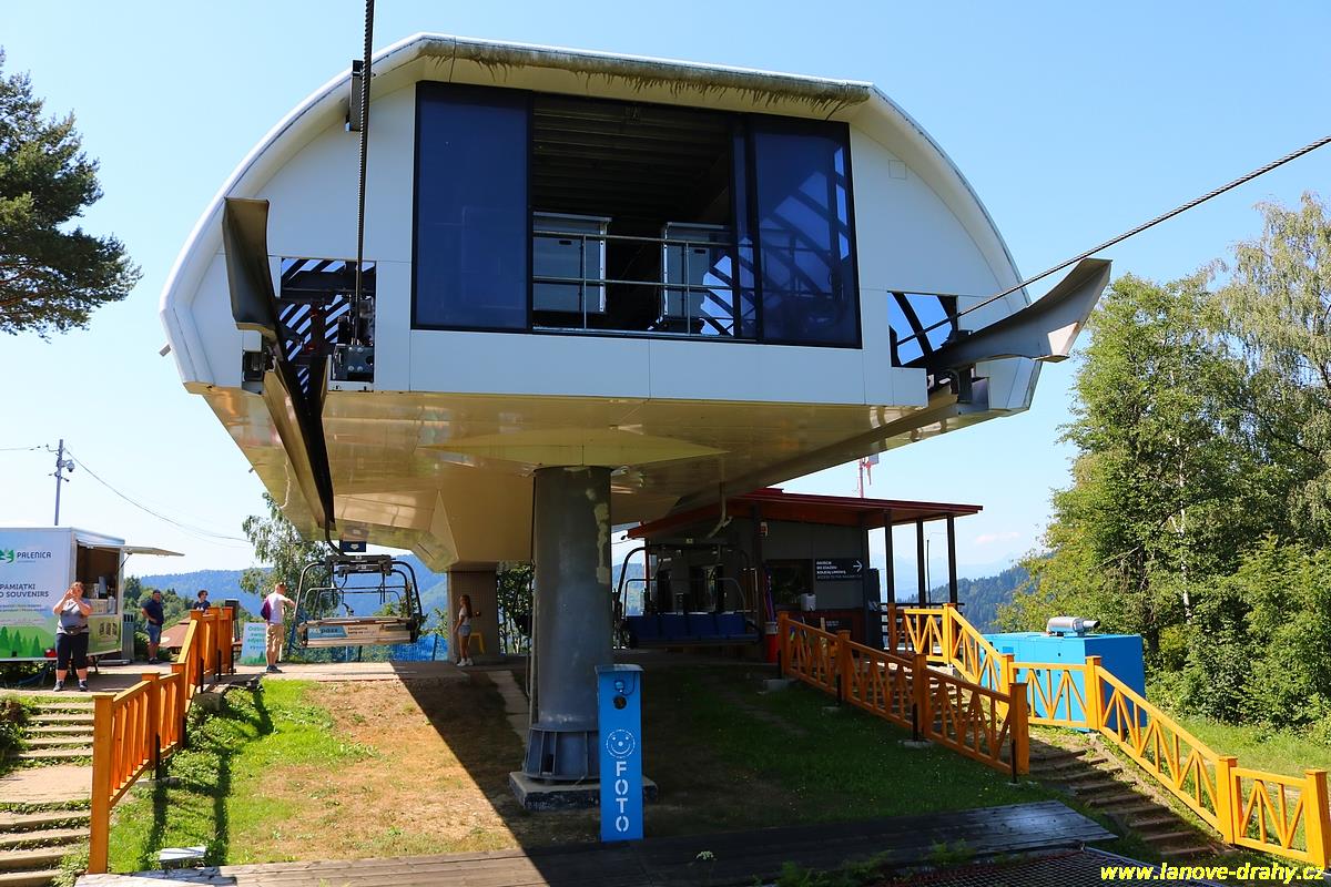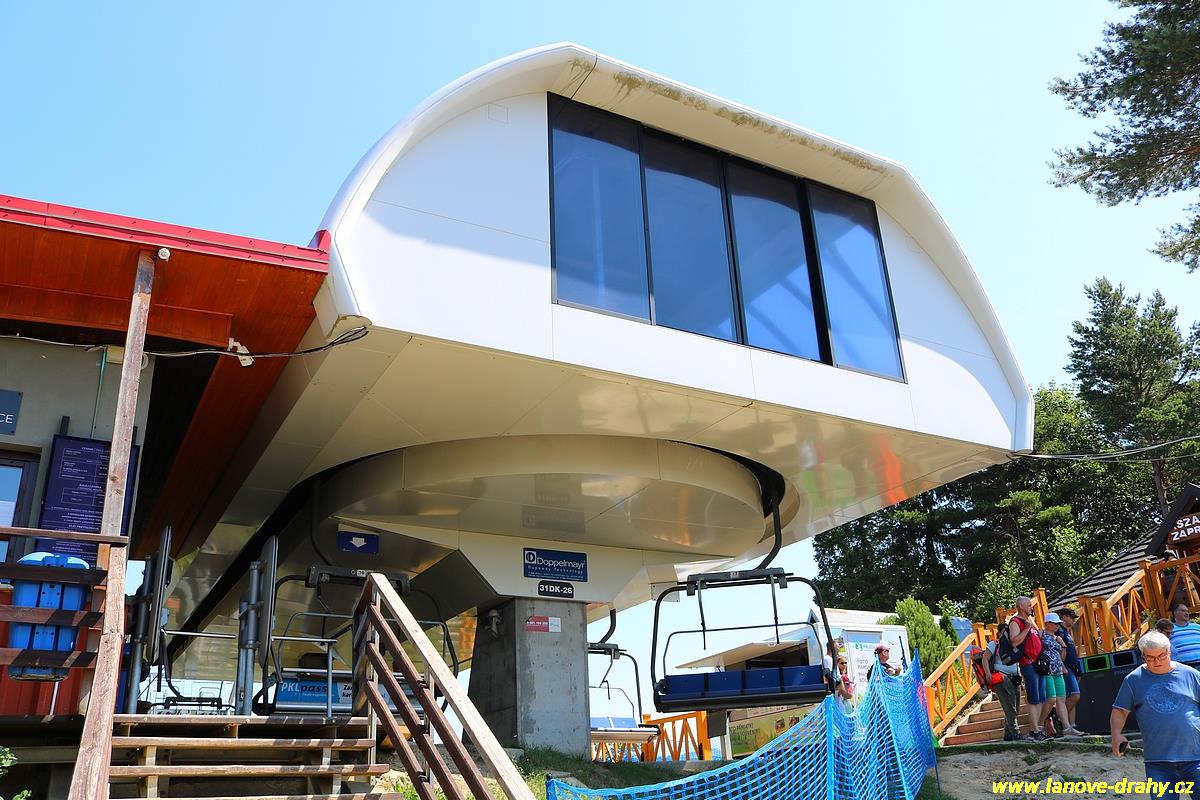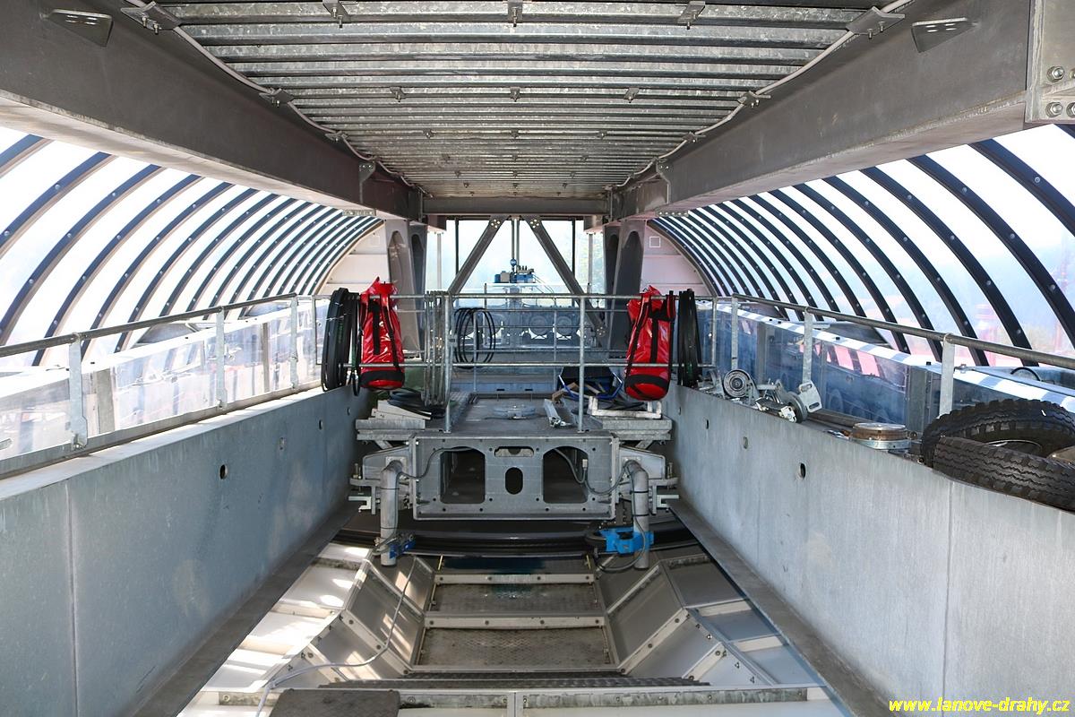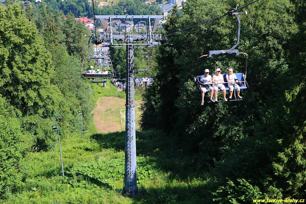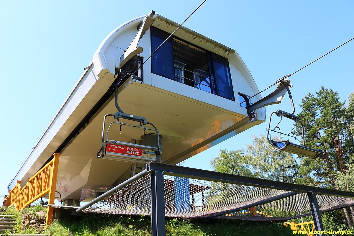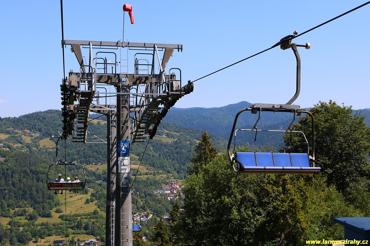 osobní visutá jednolanová dráha oběžného systému s odpojitelným uchycením čtyřmístných sedaček |