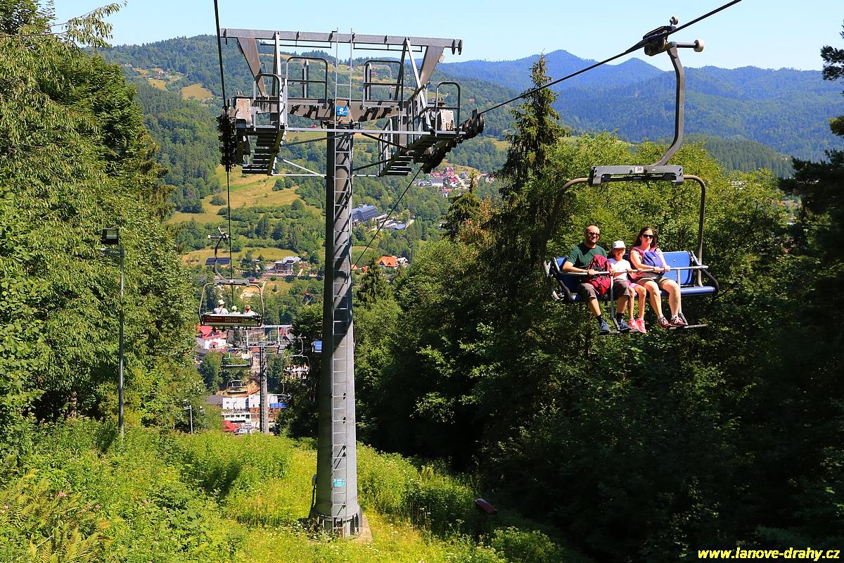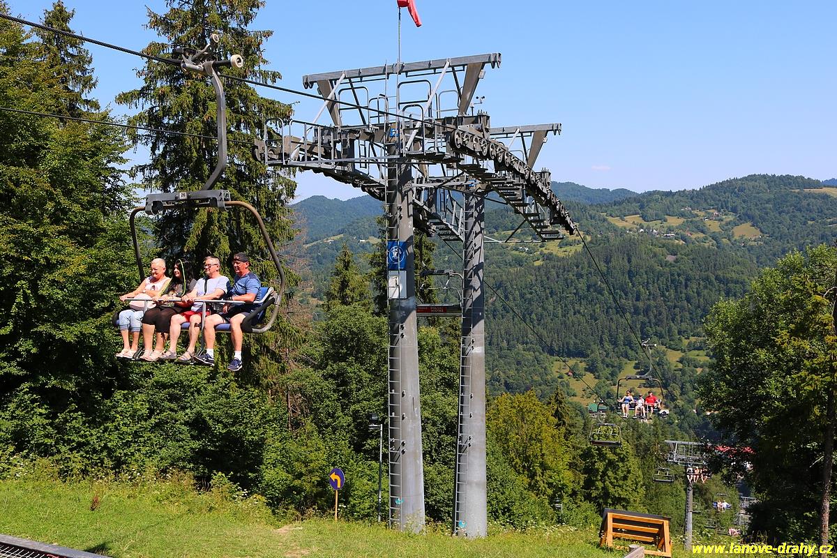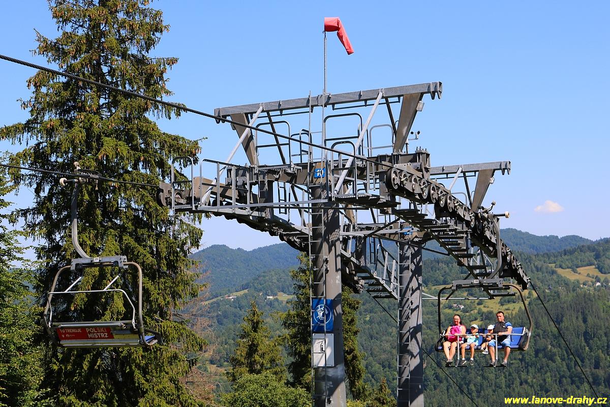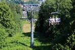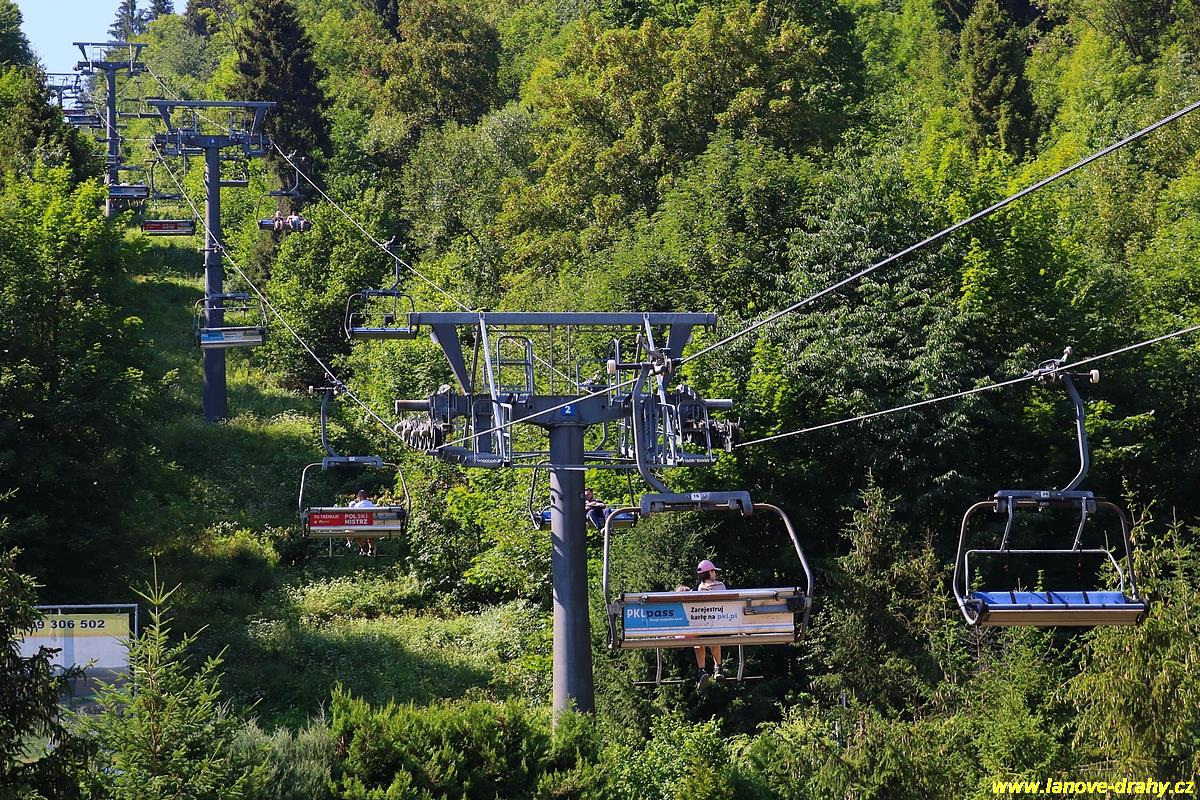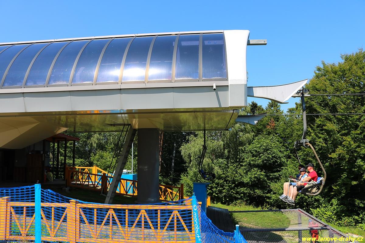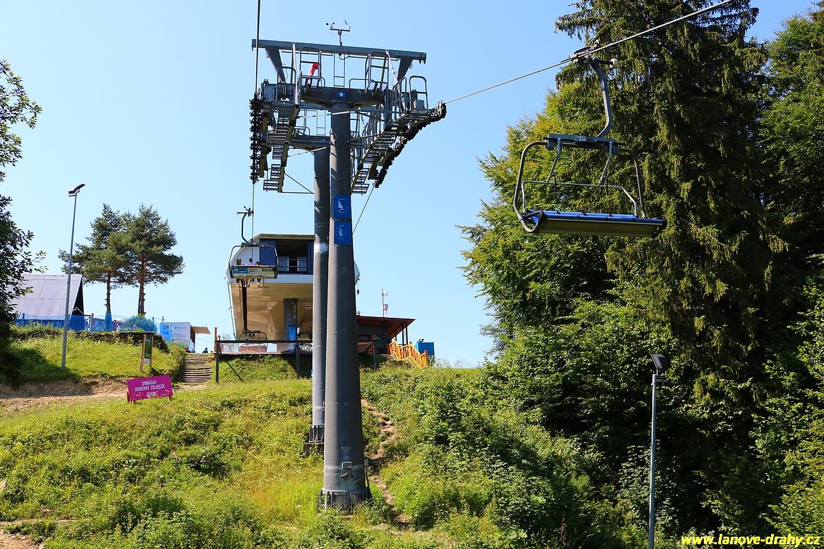 osobní visutá jednolanová dráha oběžného systému s odpojitelným uchycením čtyřmístných sedaček |