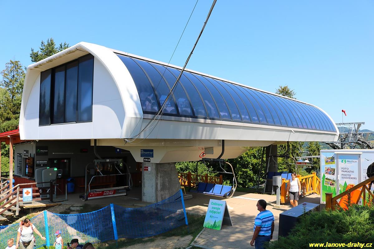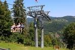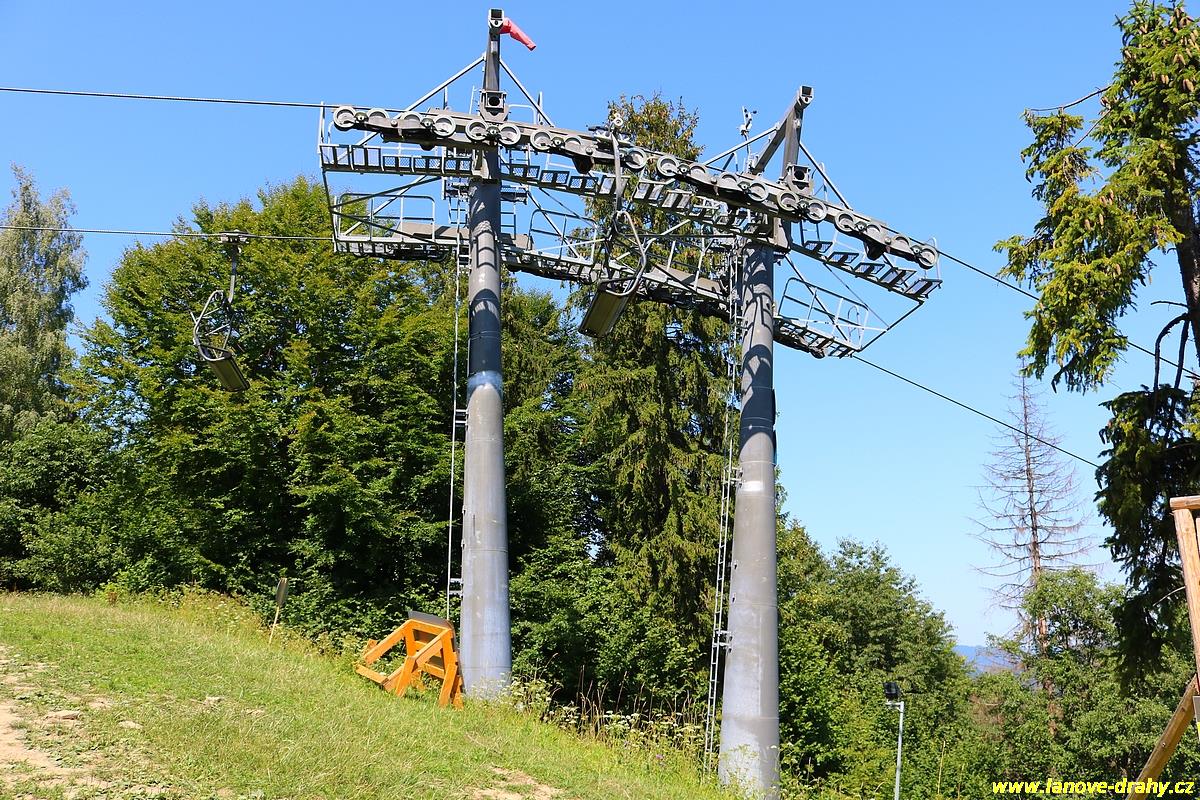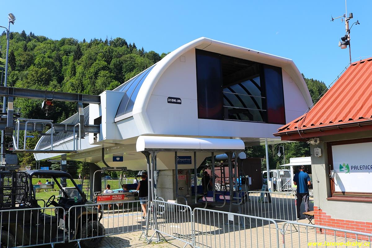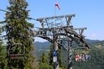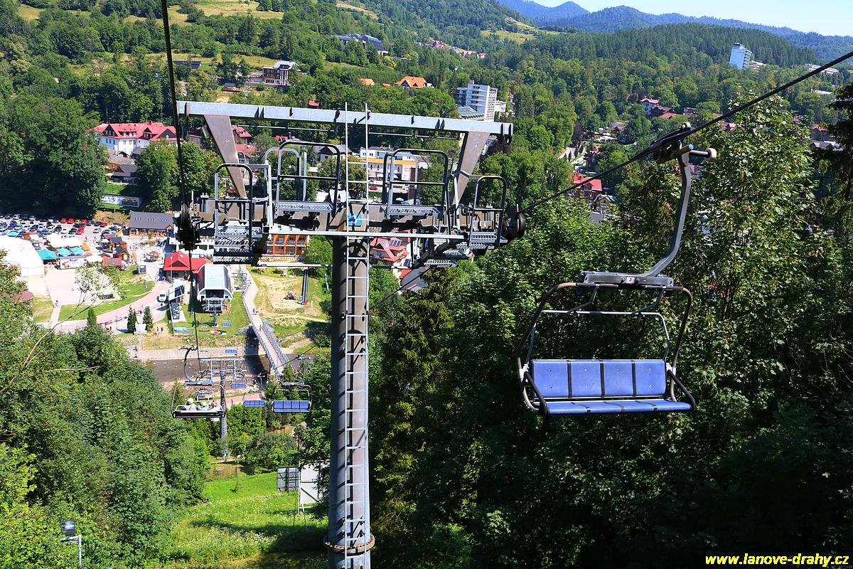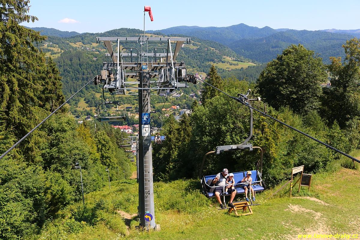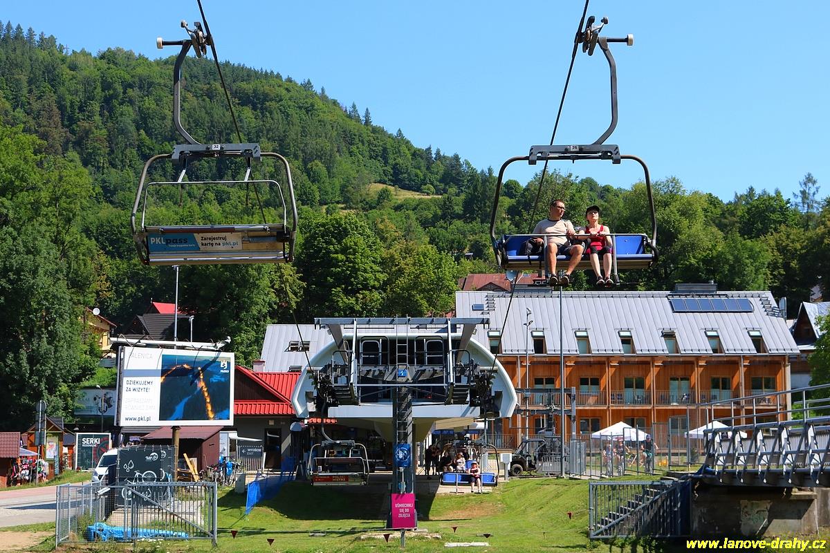 osobní visutá jednolanová dráha oběžného systému s odpojitelným uchycením čtyřmístných sedaček |