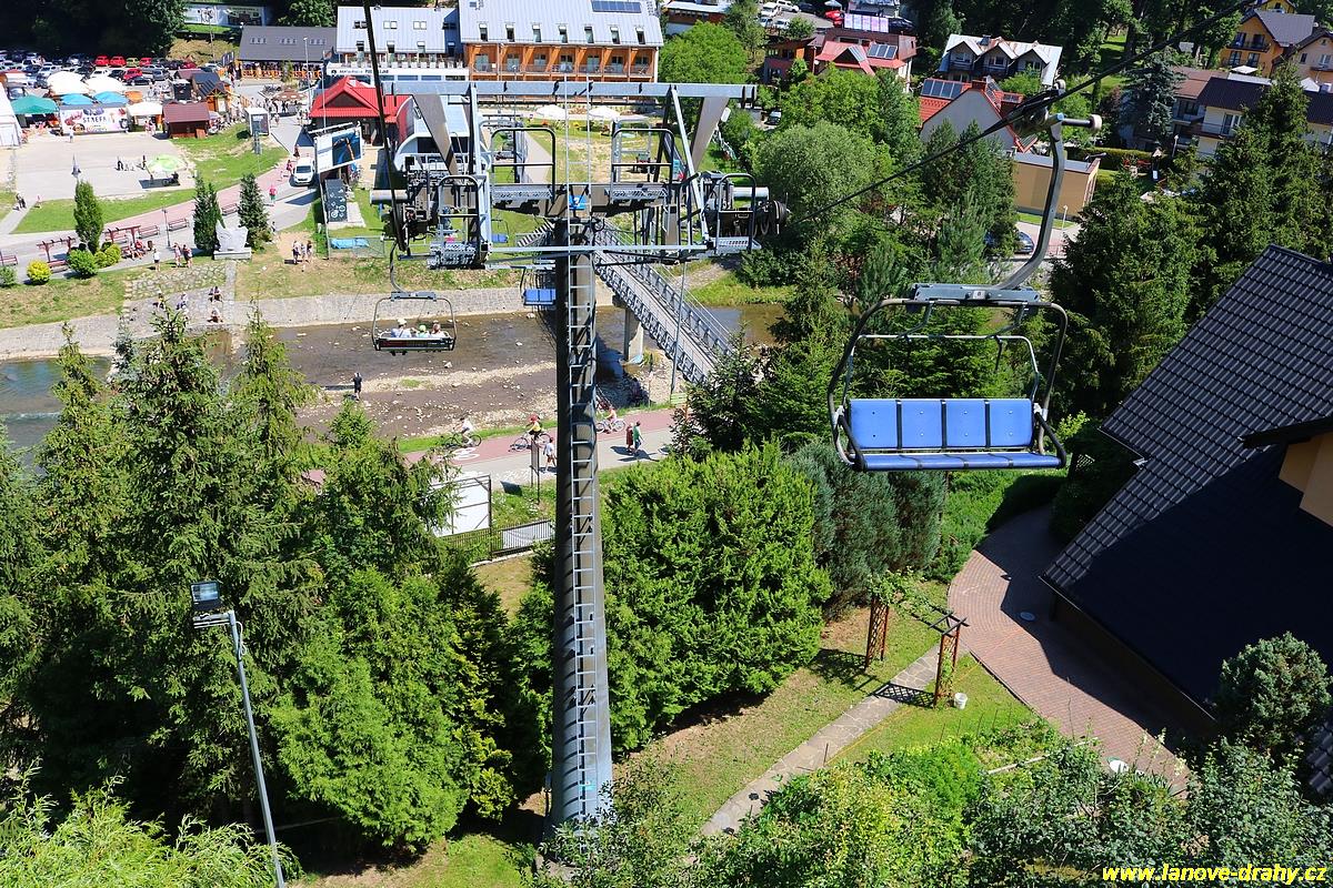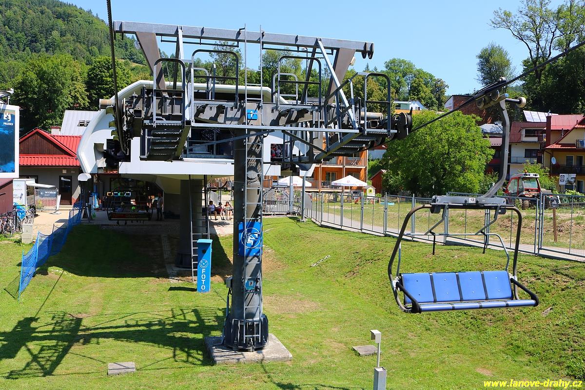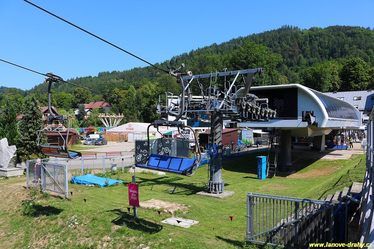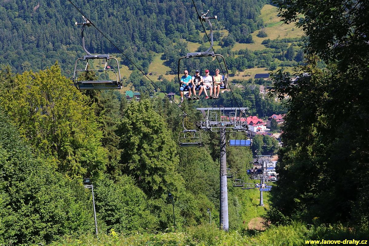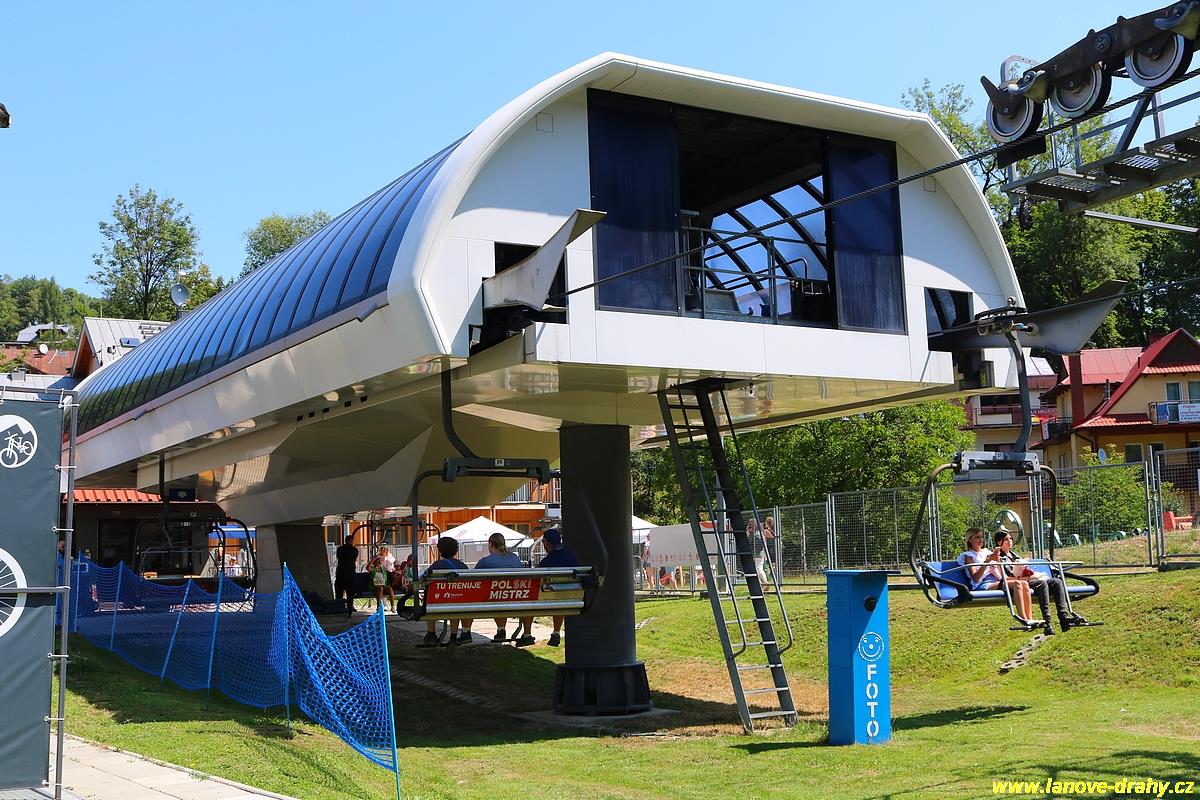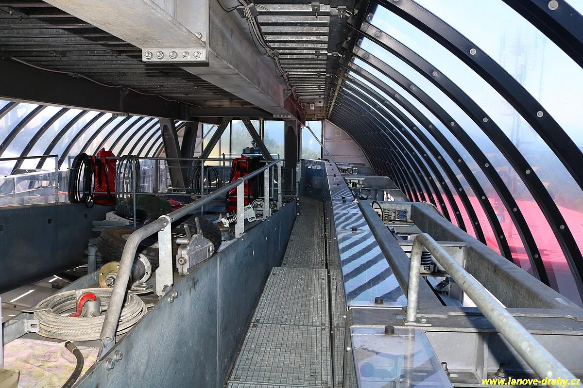 osobní visutá jednolanová dráha oběžného systému s odpojitelným uchycením čtyřmístných sedaček |