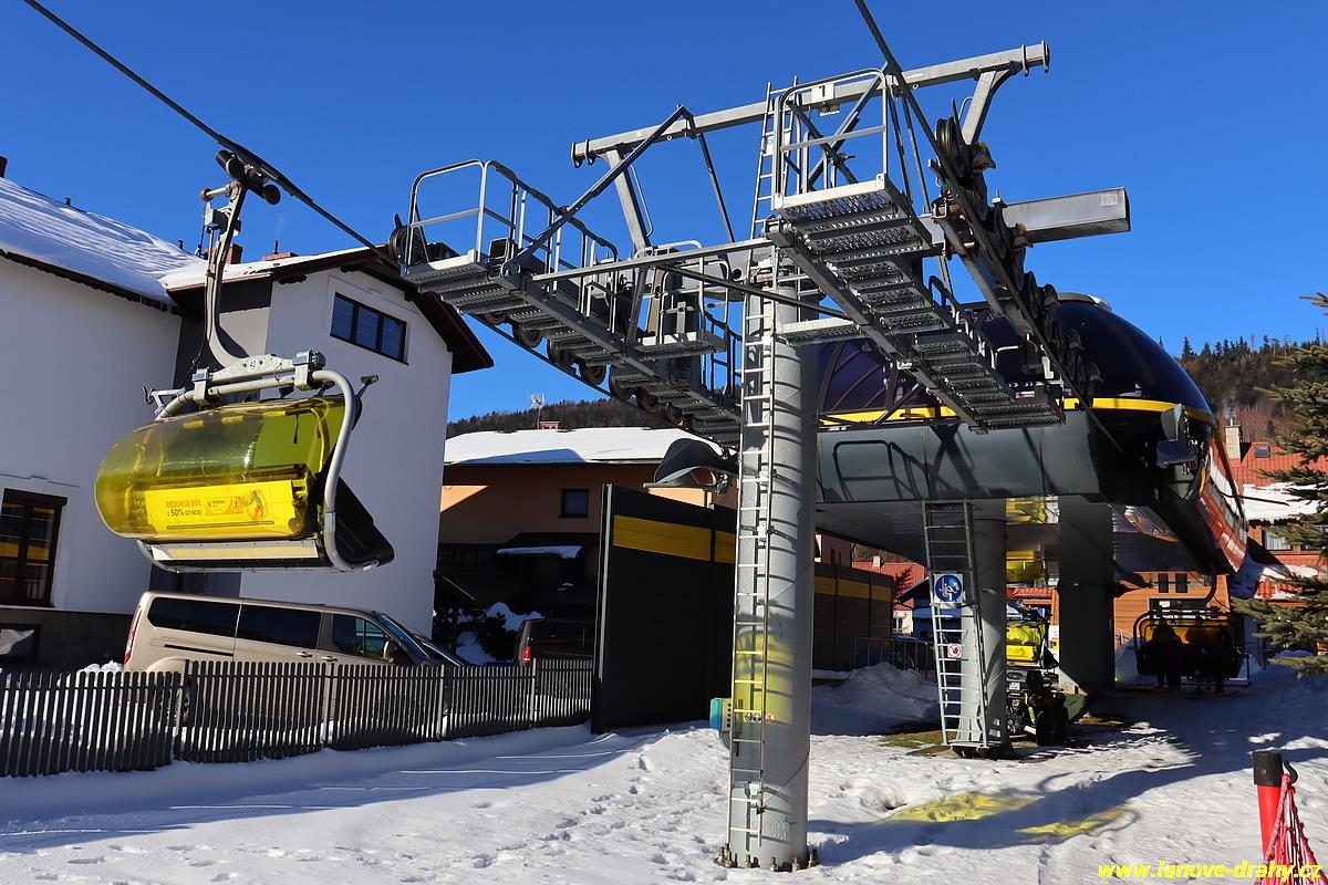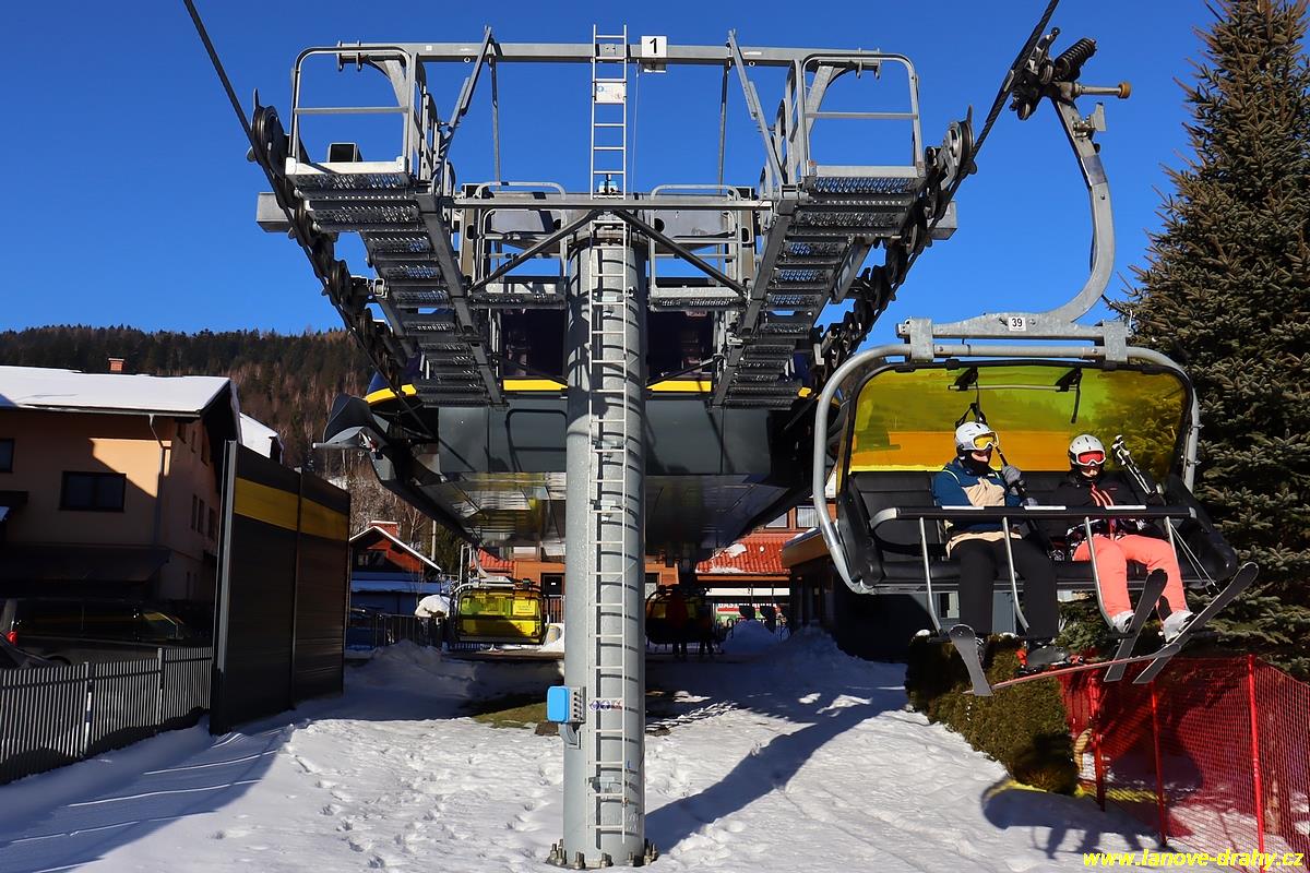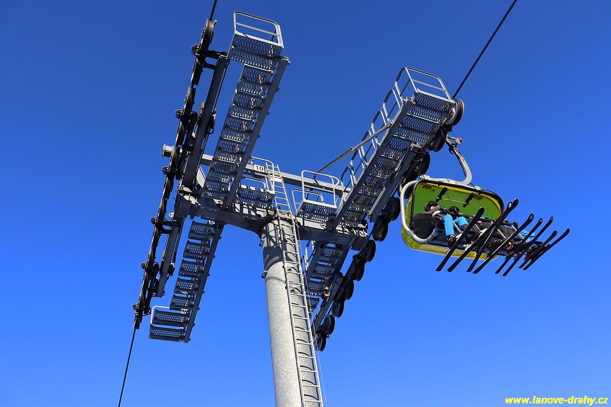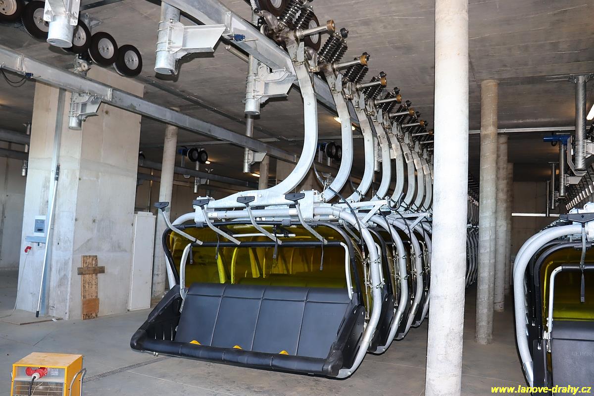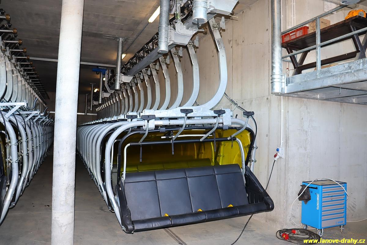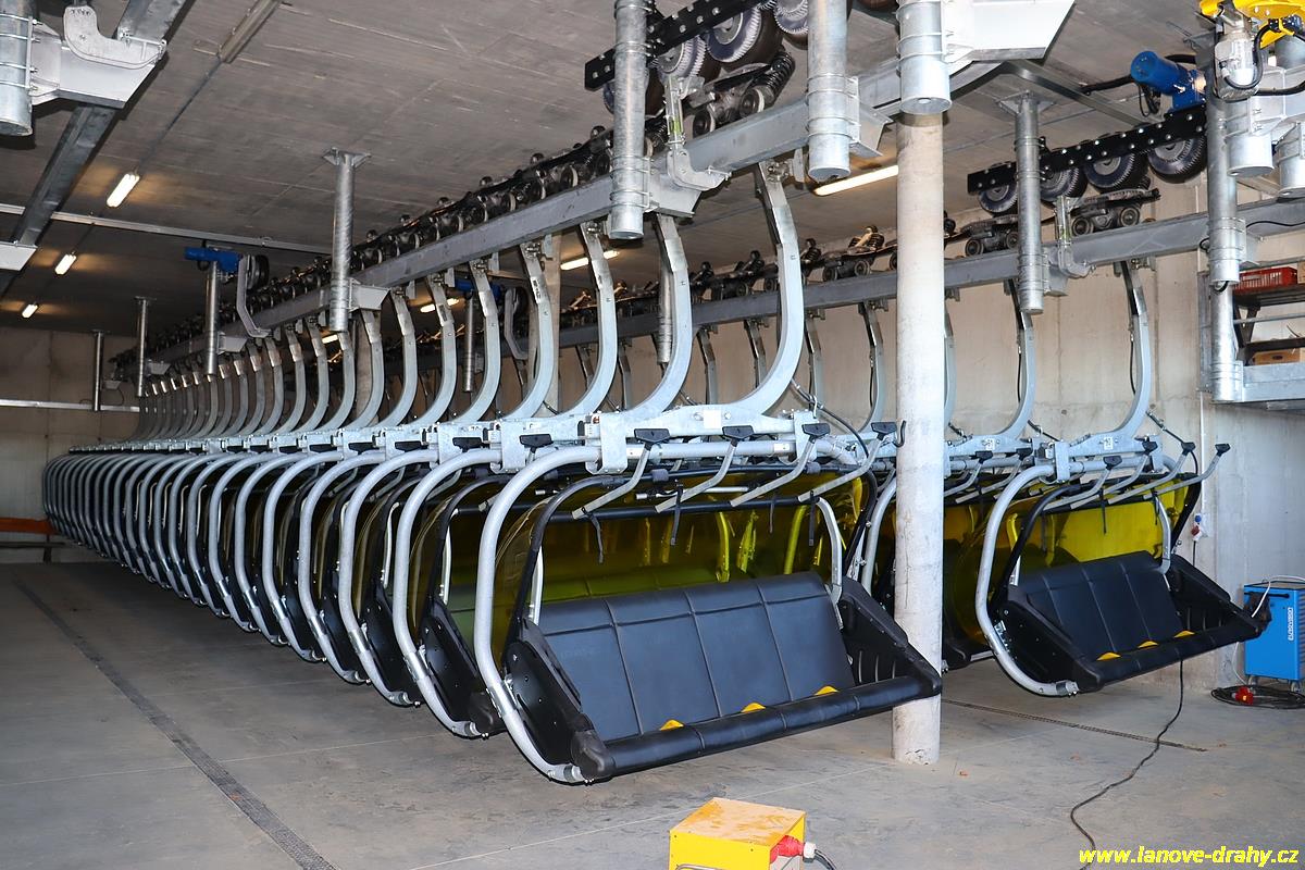 čtyřmístných sedaček se žlutými bublinami a s nástupním pásem |