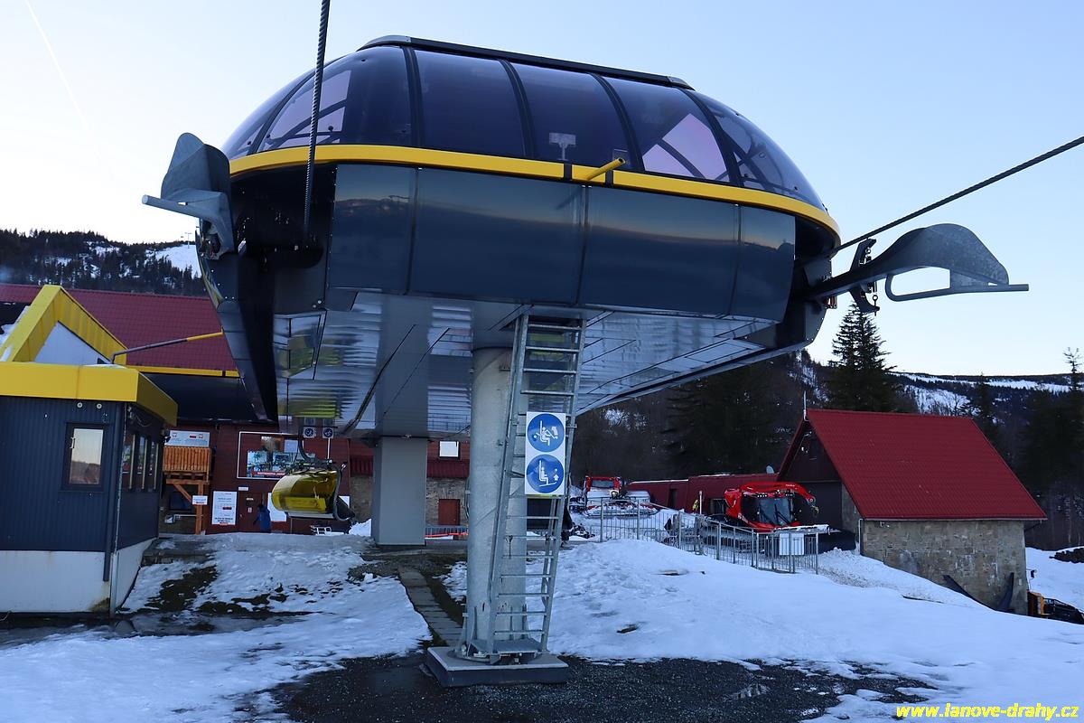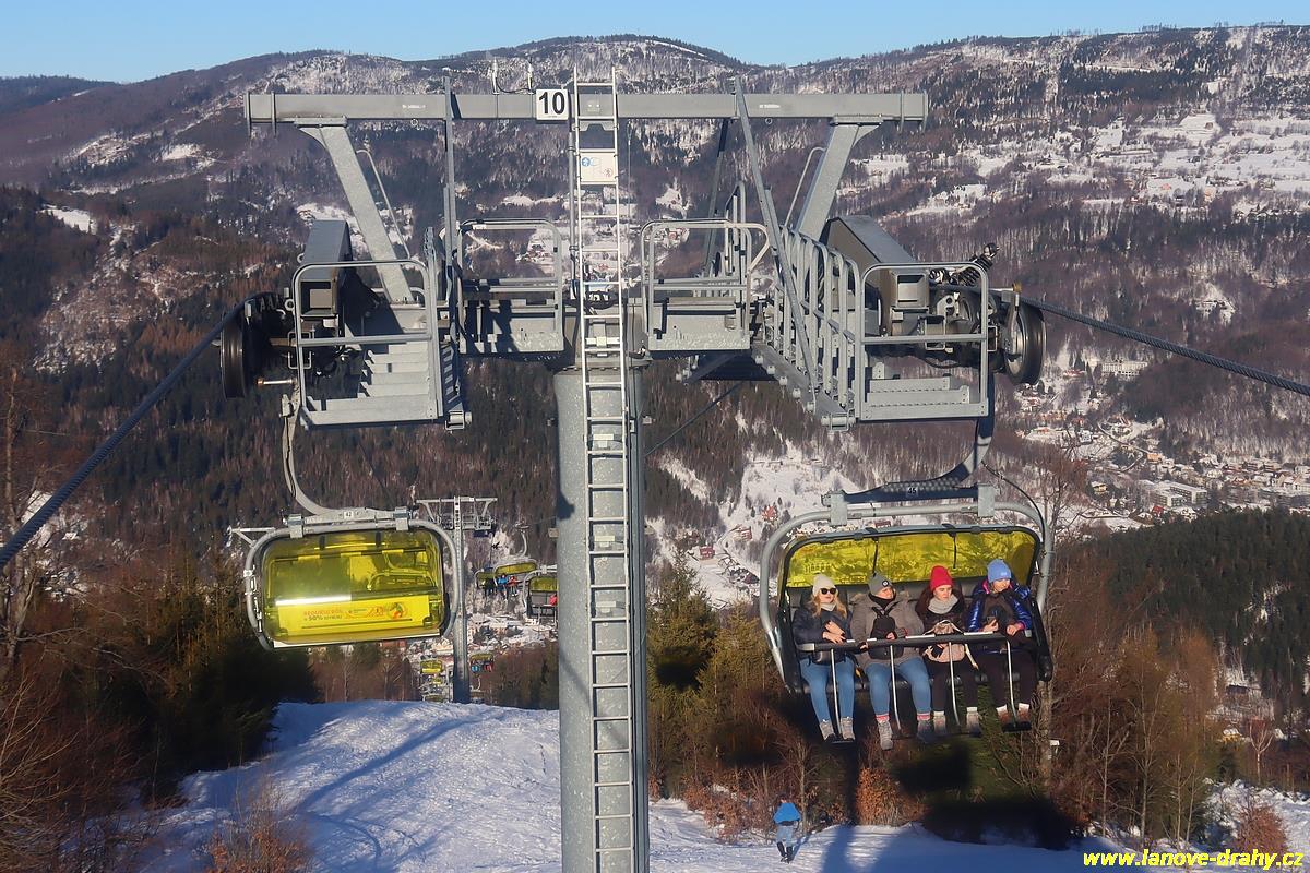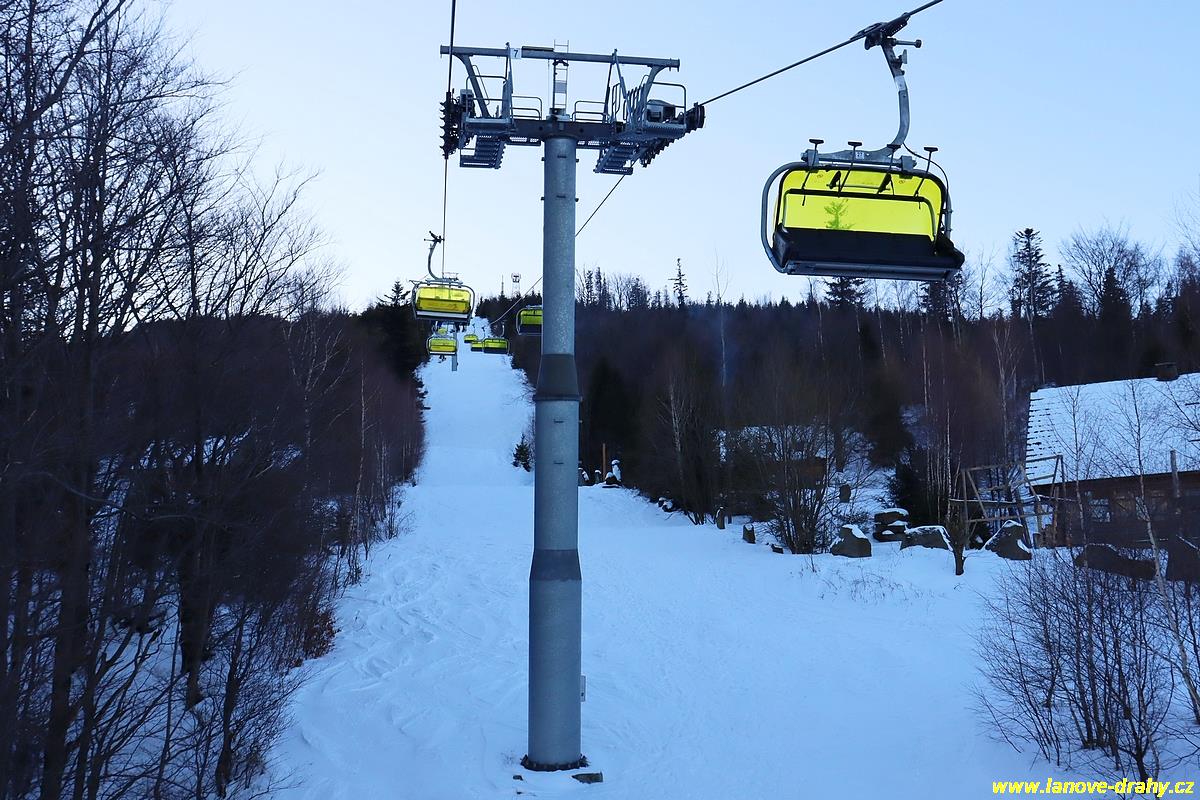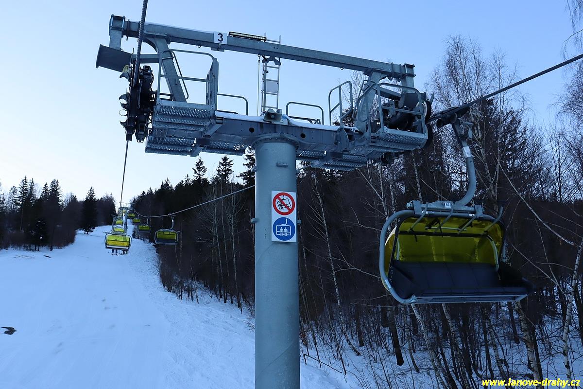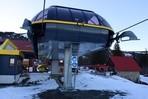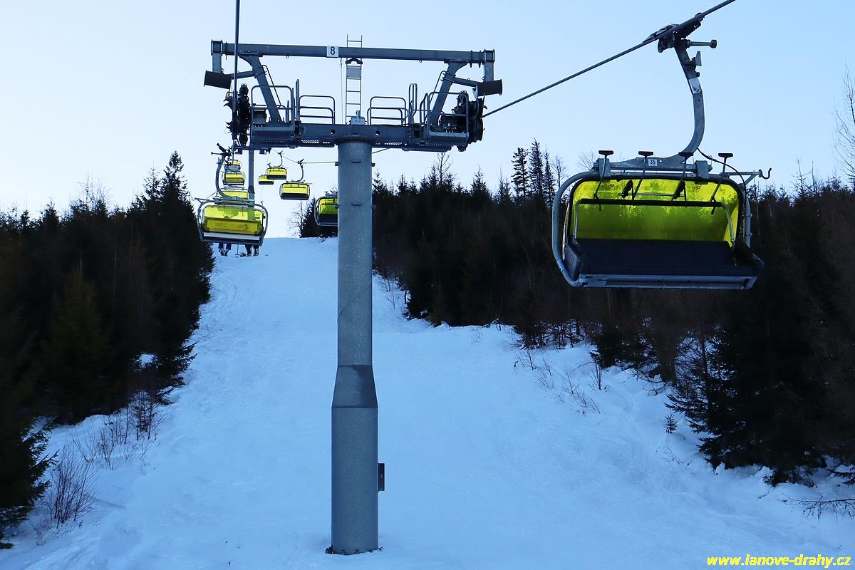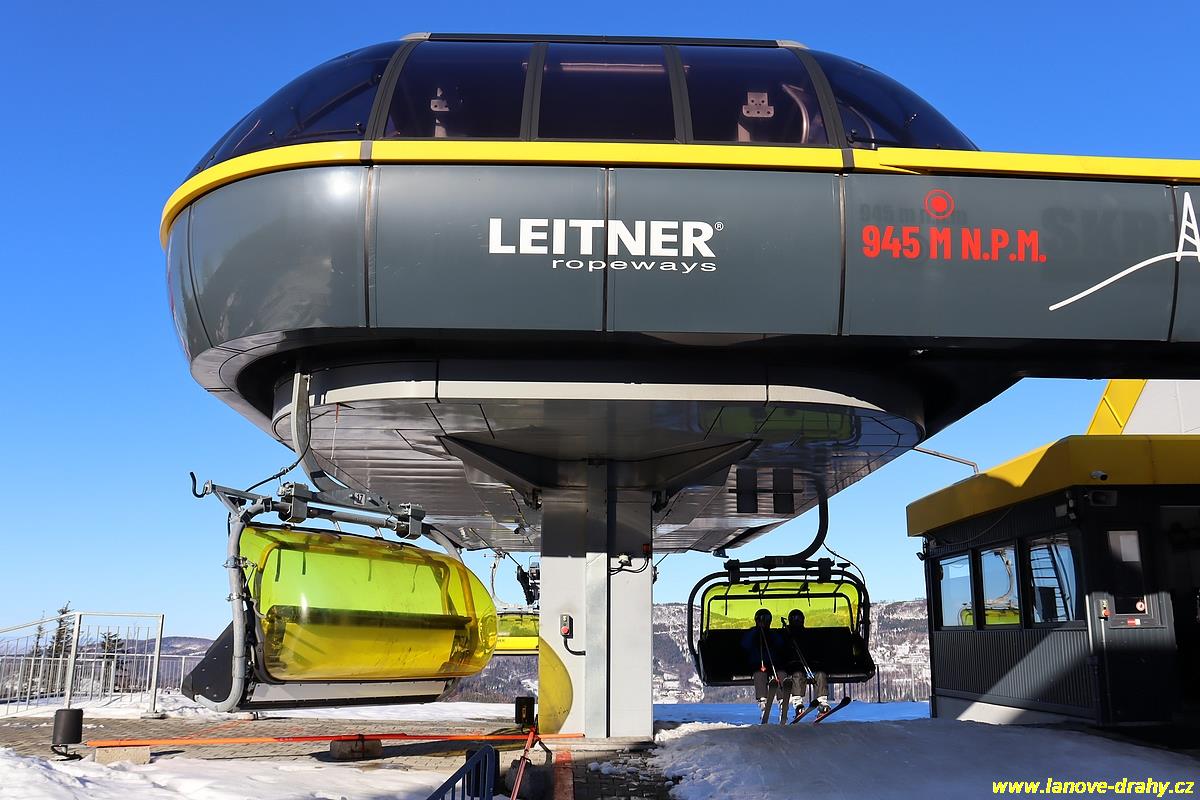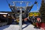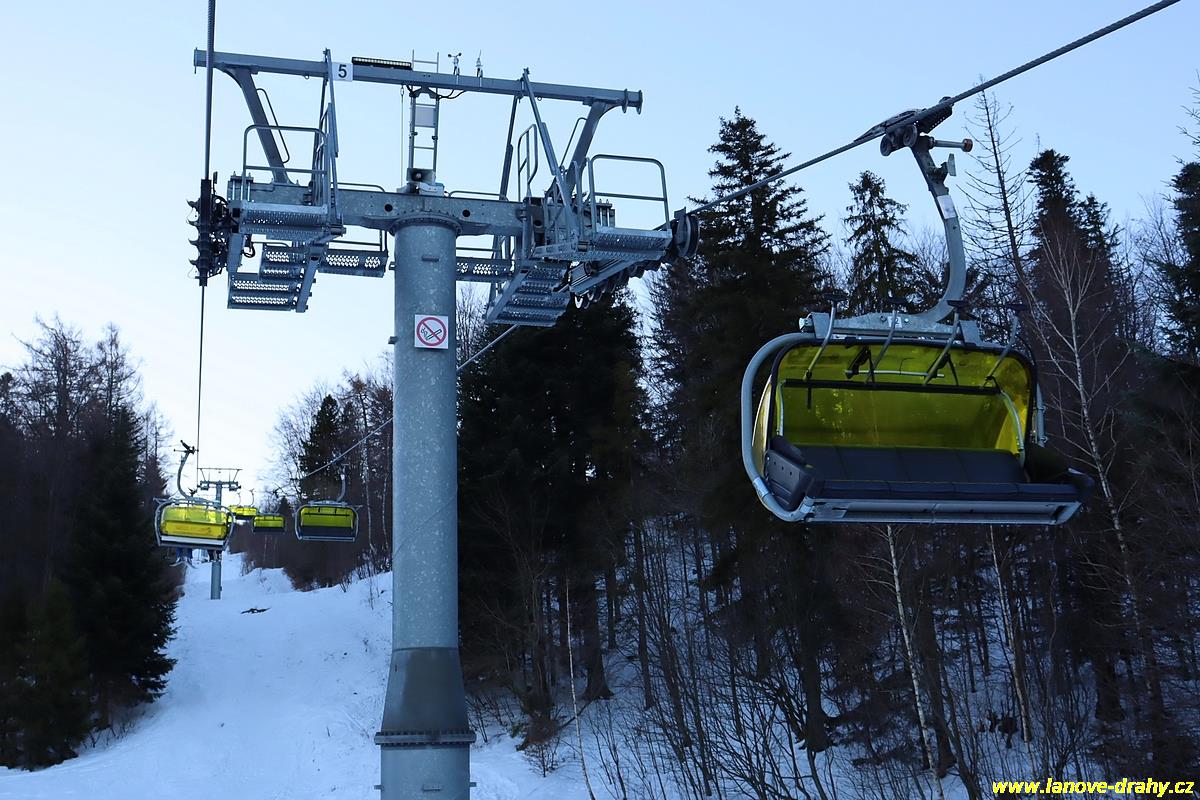 čtyřmístných sedaček se žlutými bublinami a s nástupním pásem |