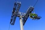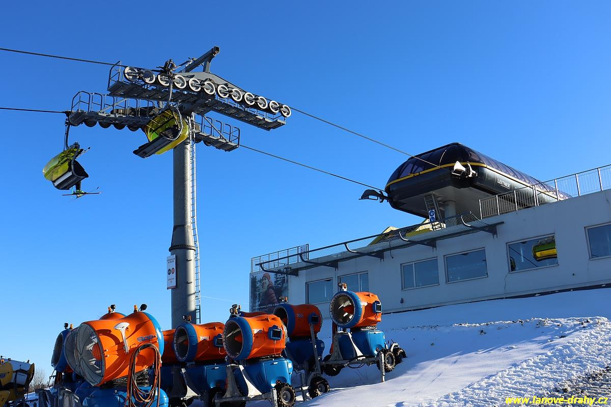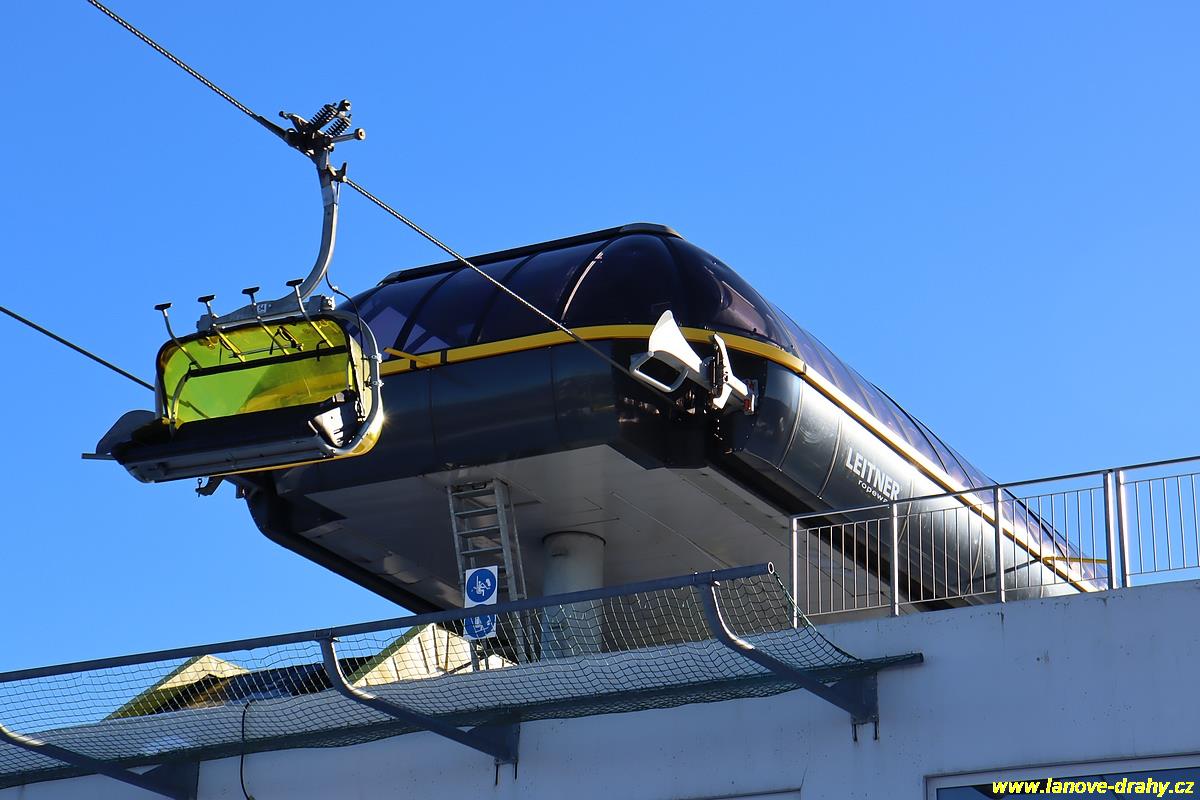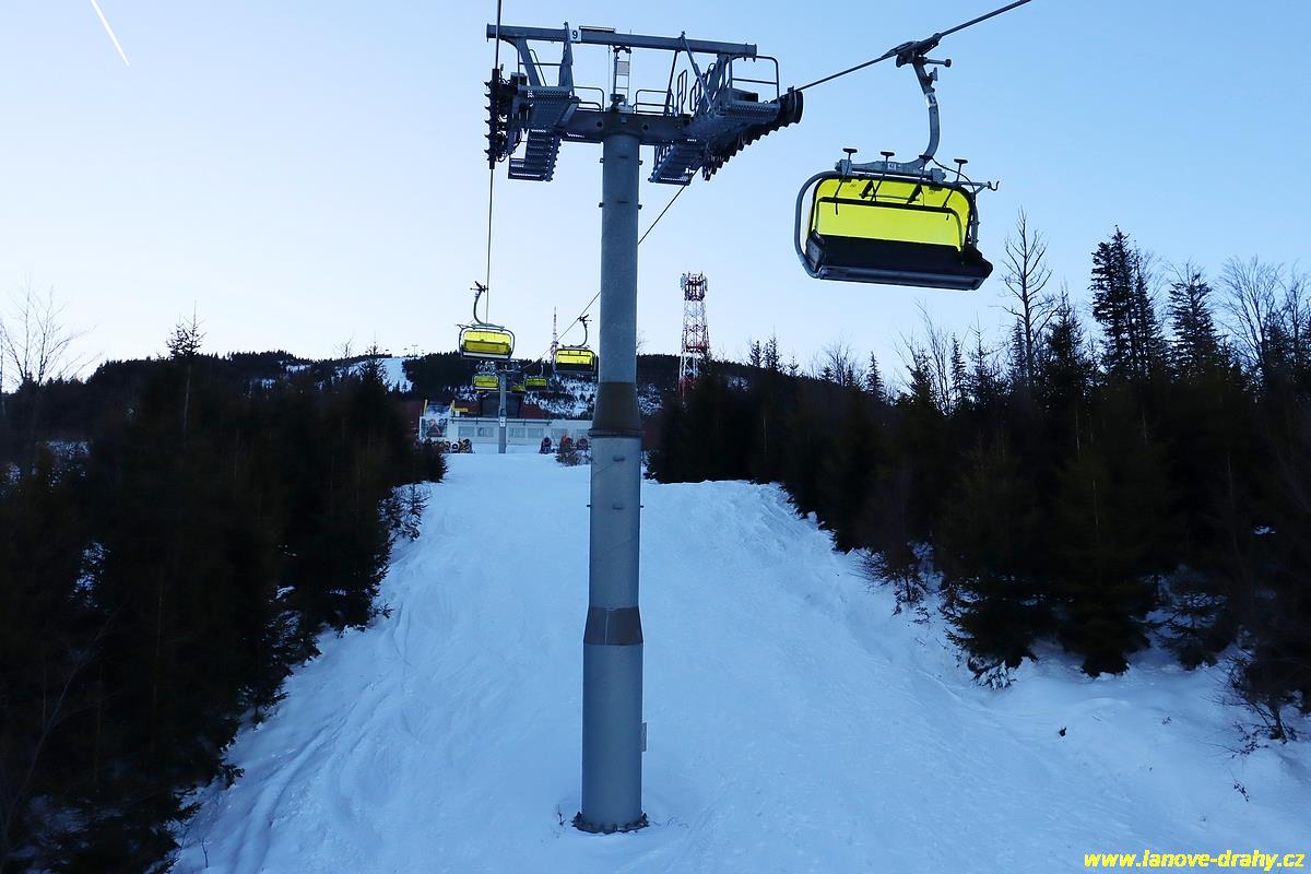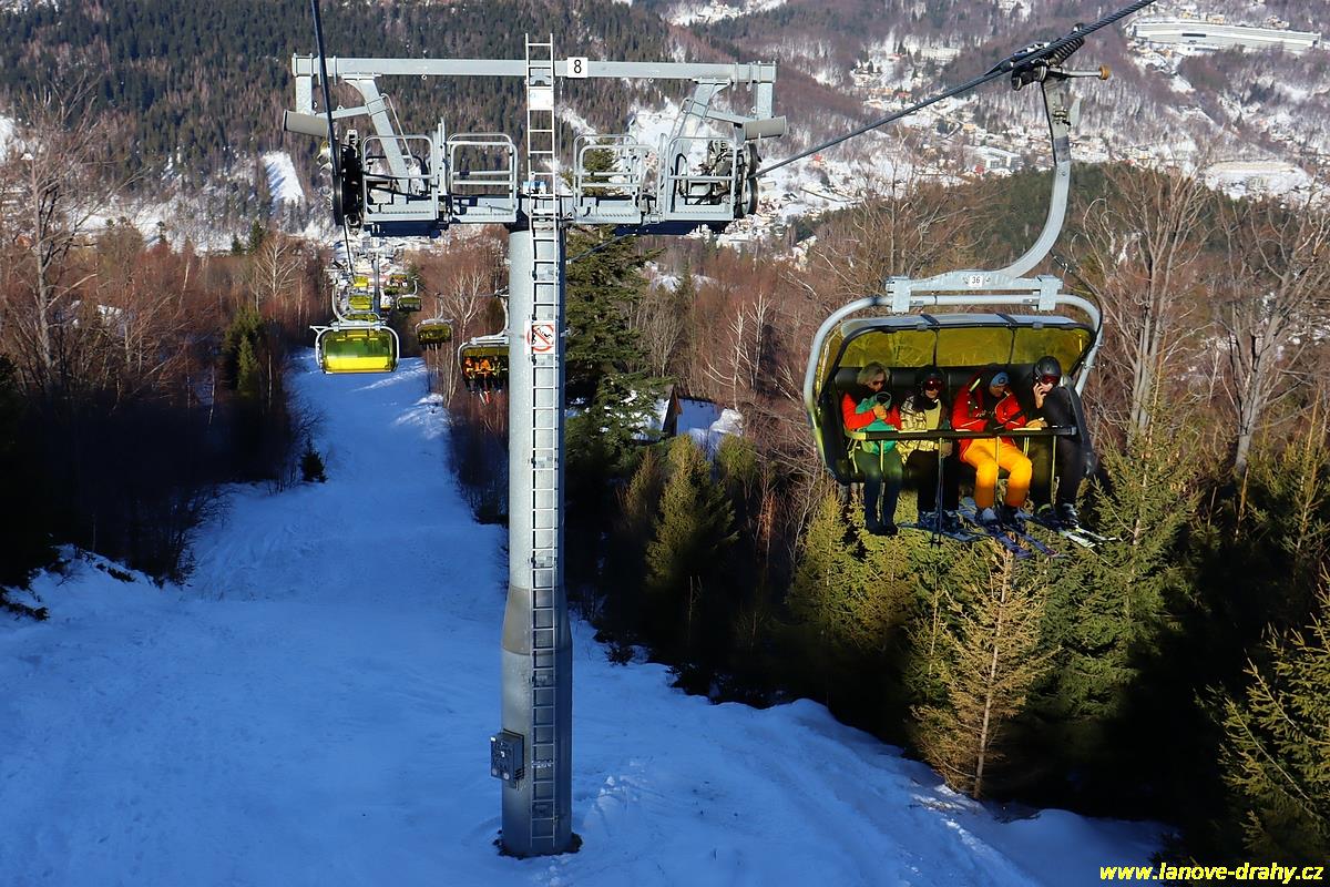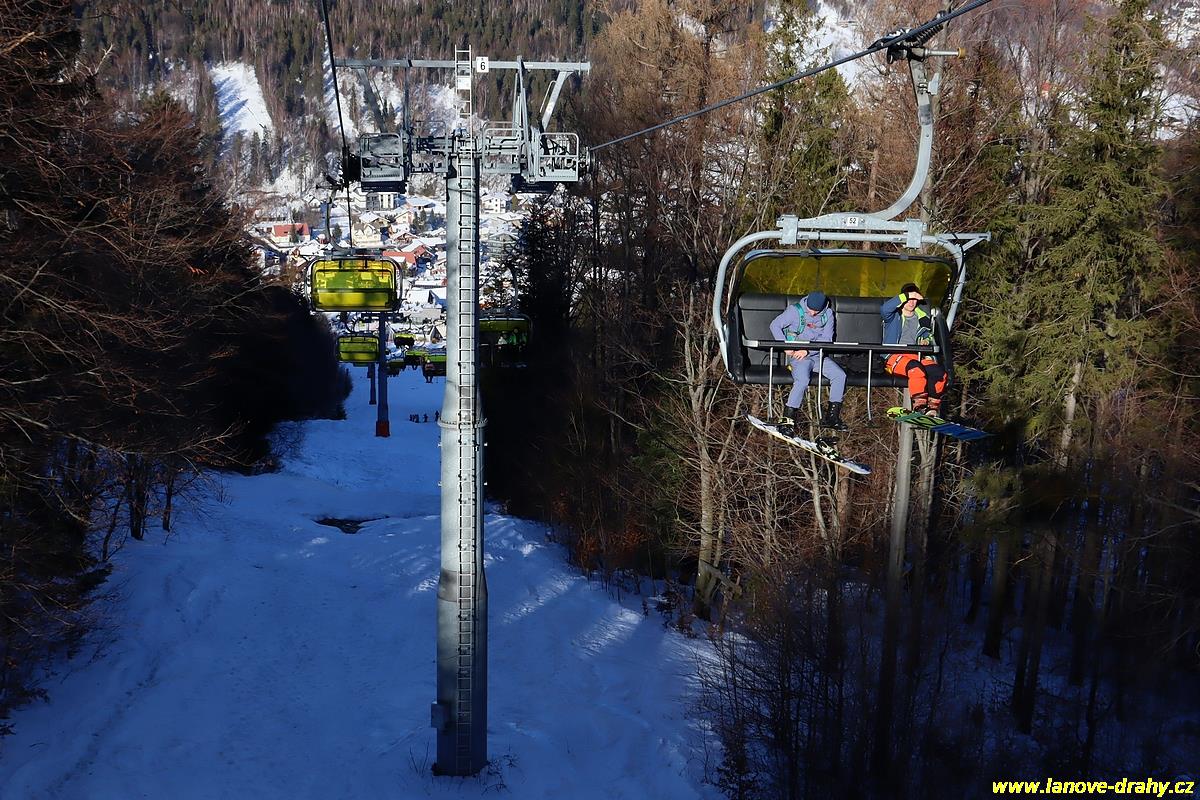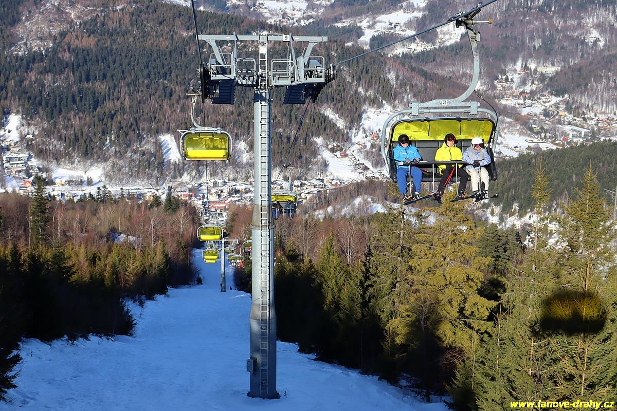 čtyřmístných sedaček se žlutými bublinami a s nástupním pásem |