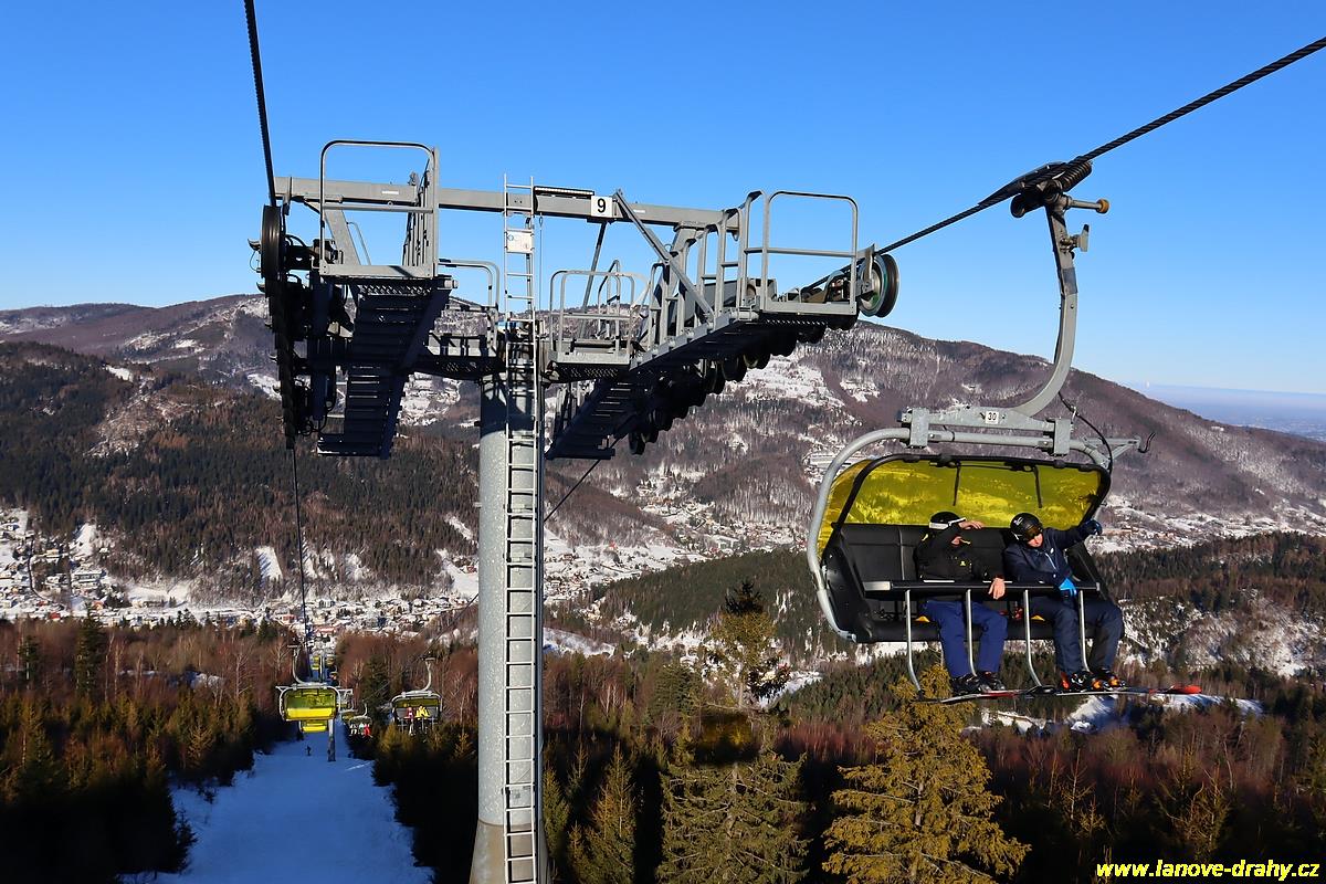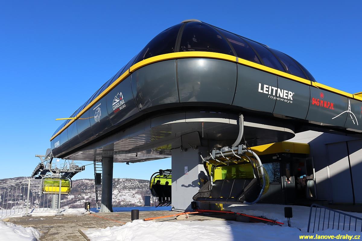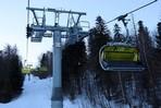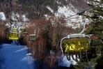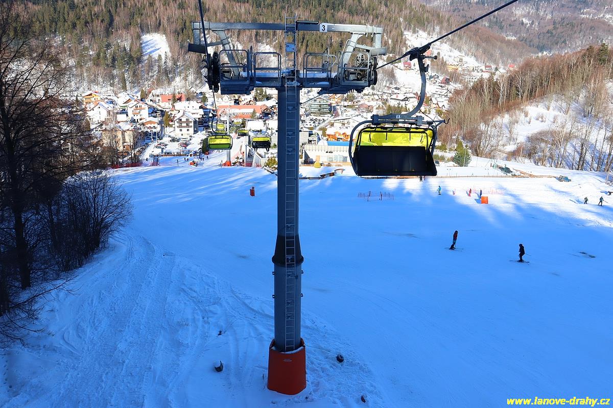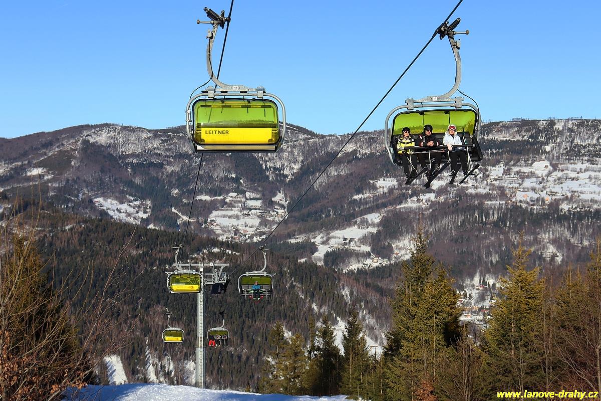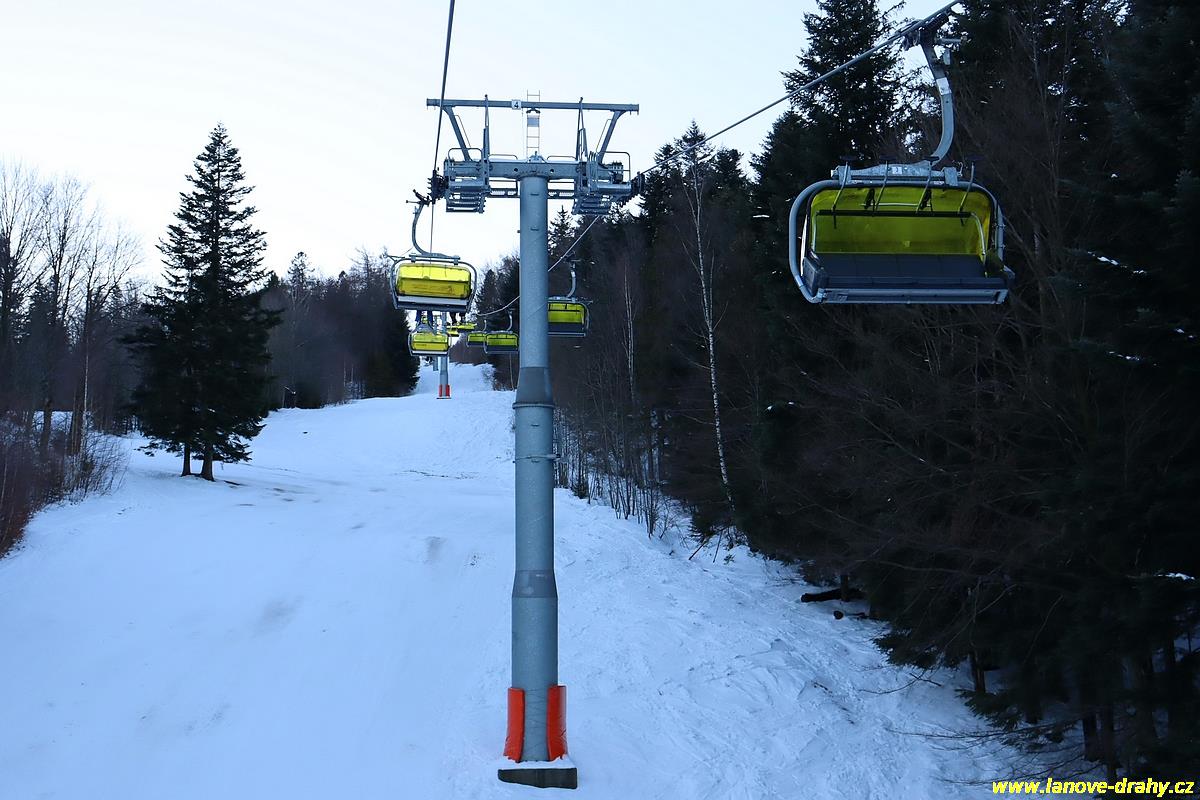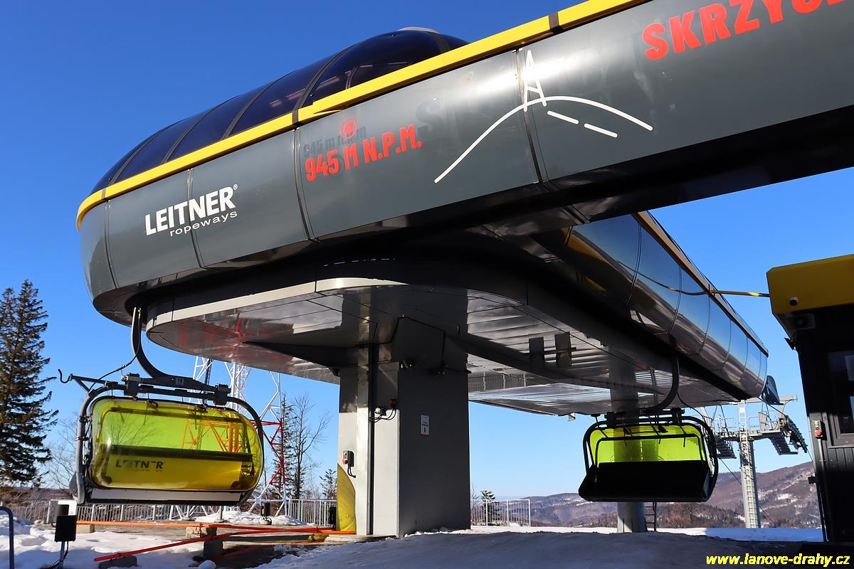 čtyřmístných sedaček se žlutými bublinami a s nástupním pásem |