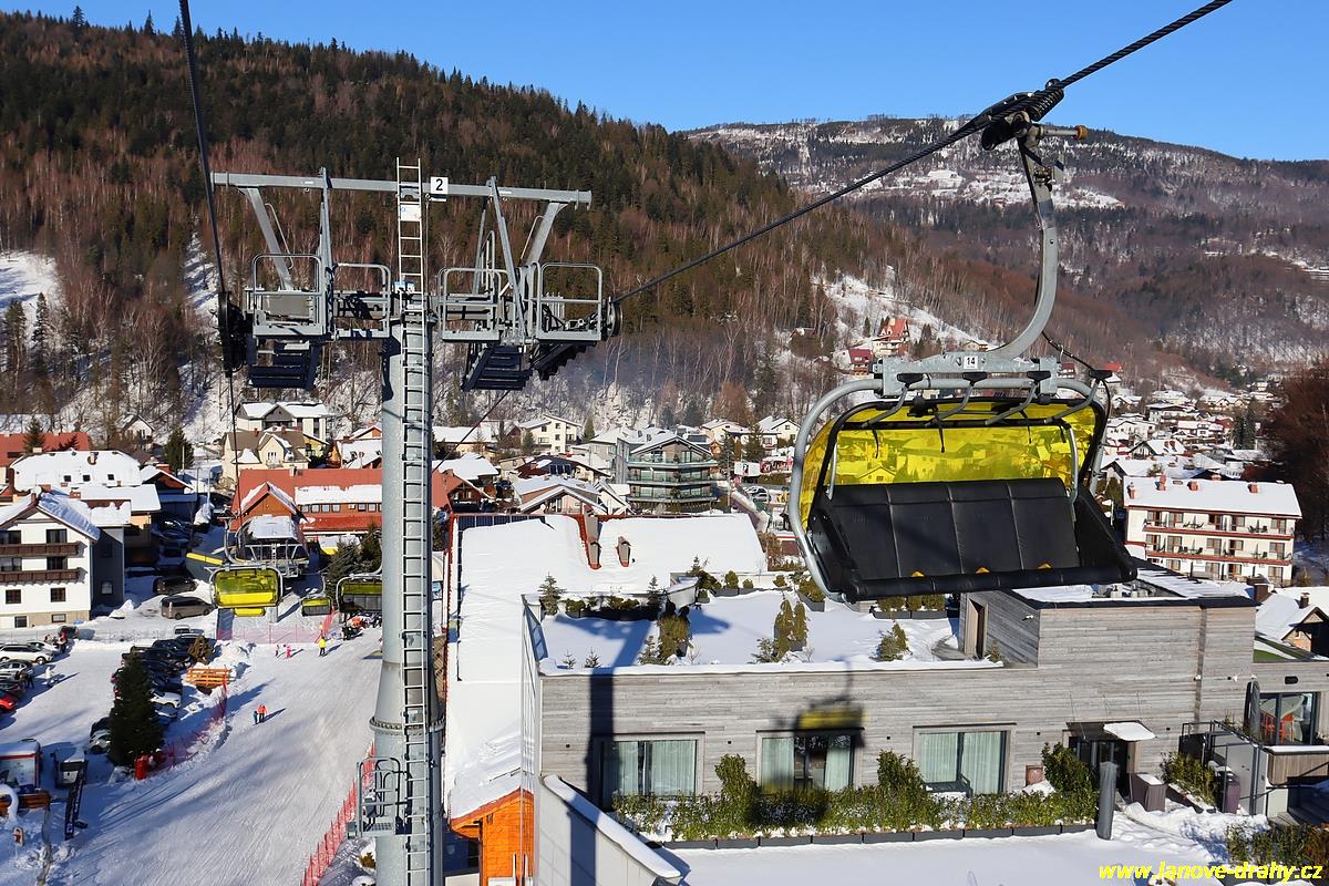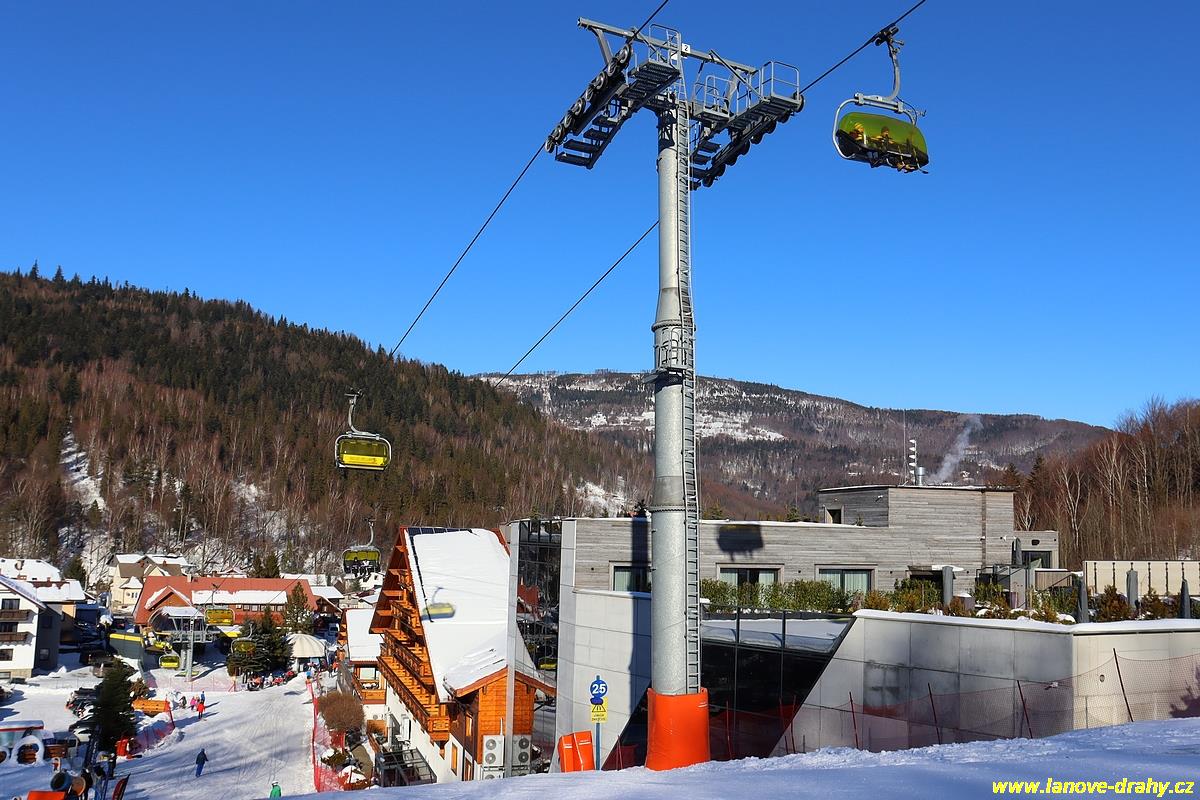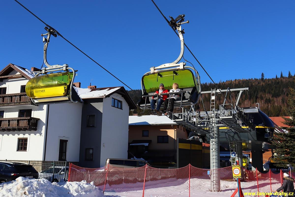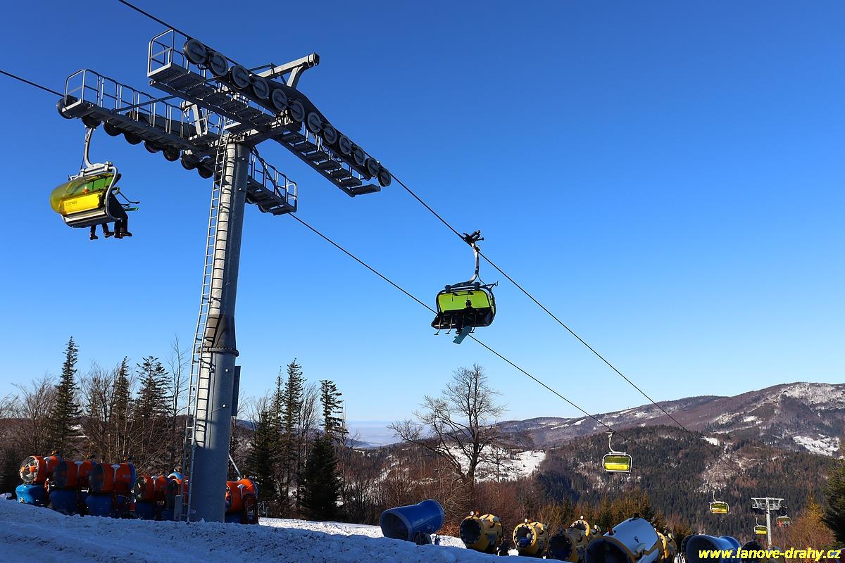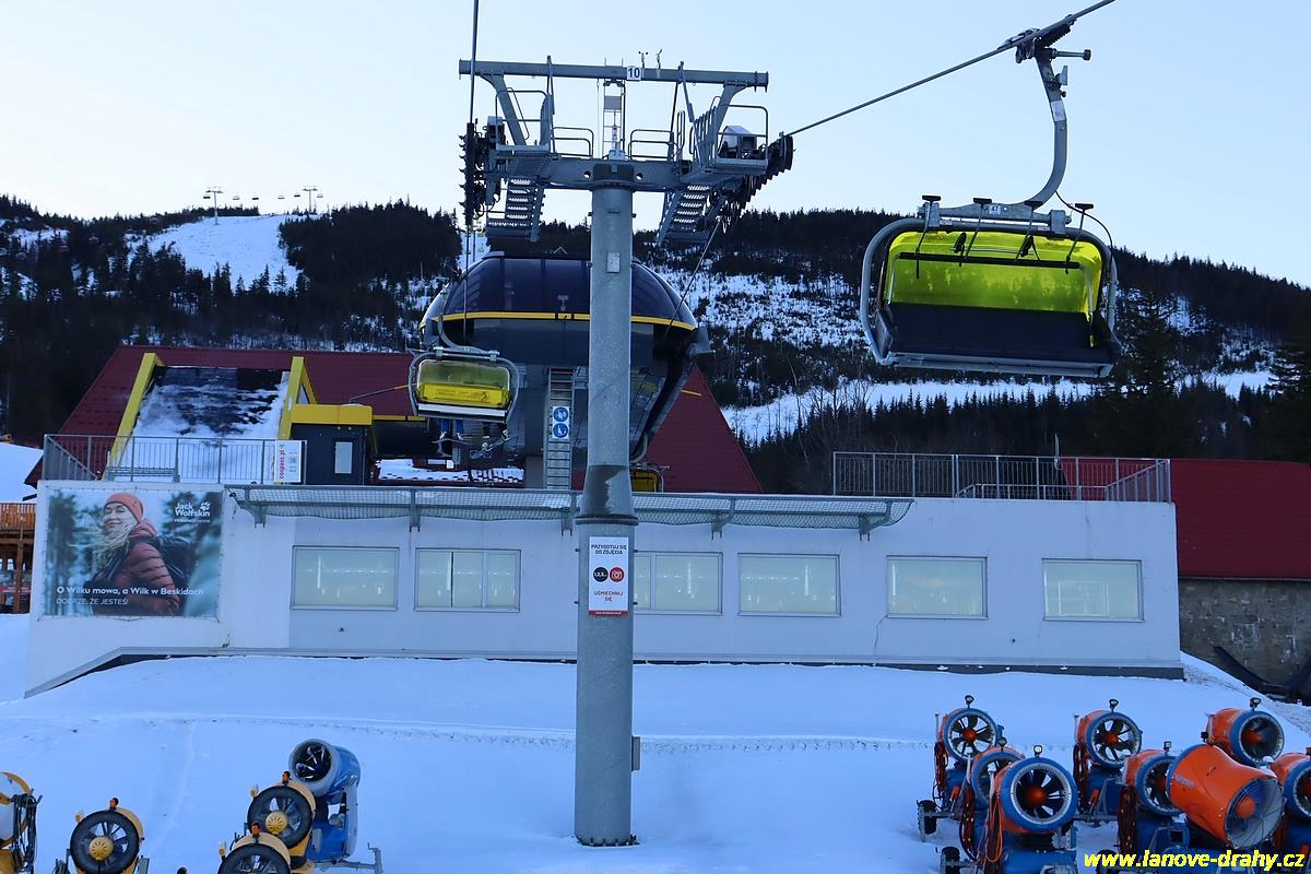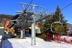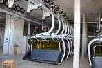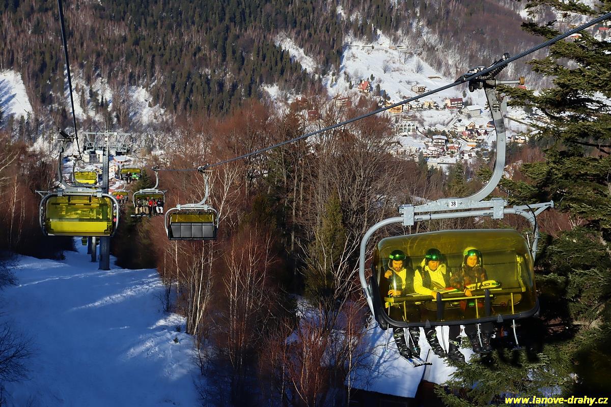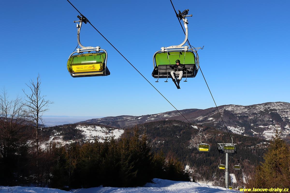 čtyřmístných sedaček se žlutými bublinami a s nástupním pásem |