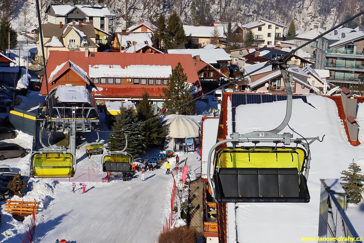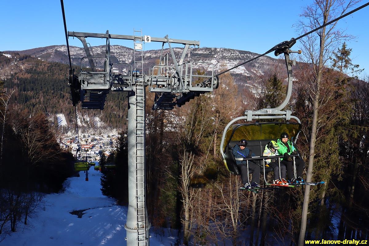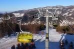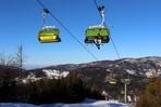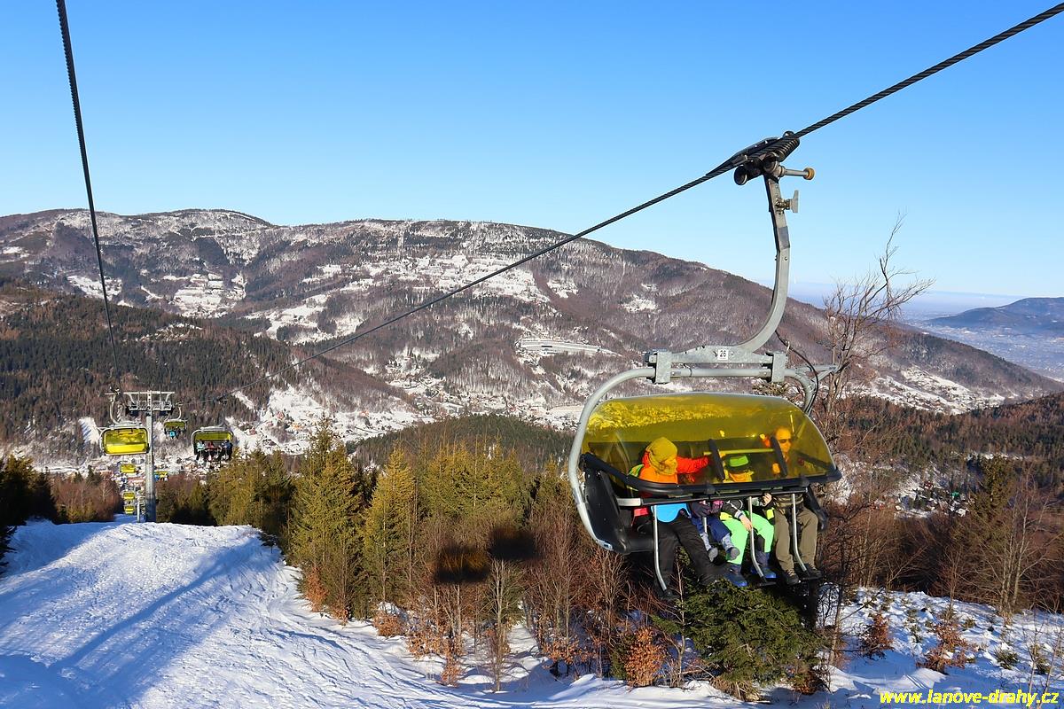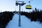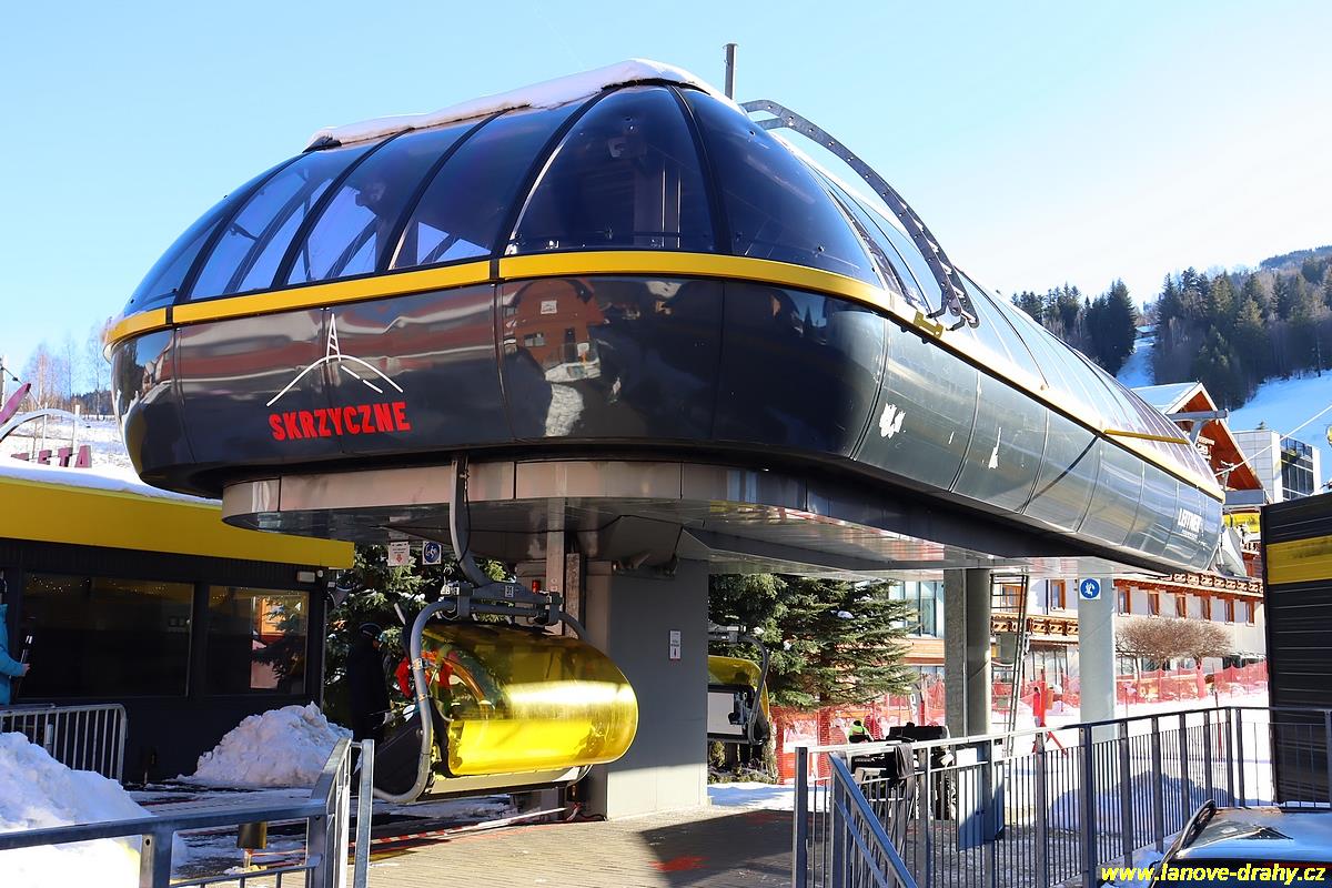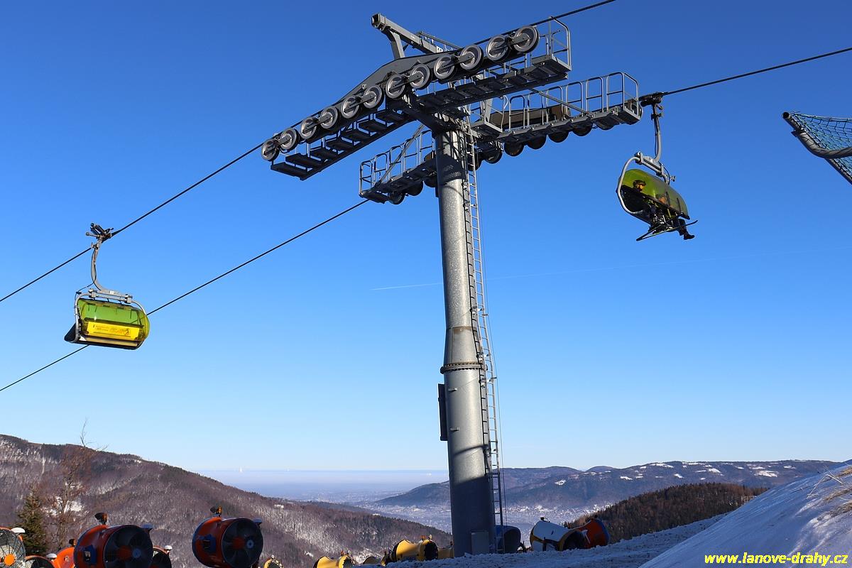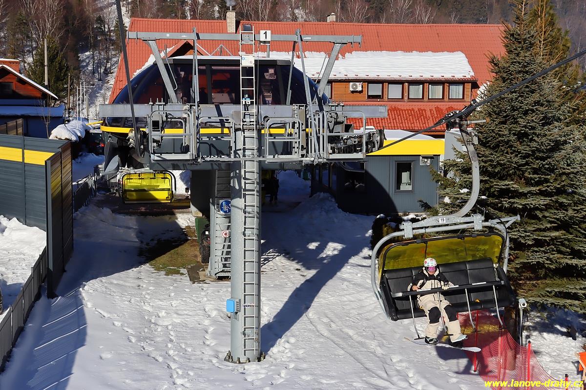 čtyřmístných sedaček se žlutými bublinami a s nástupním pásem |