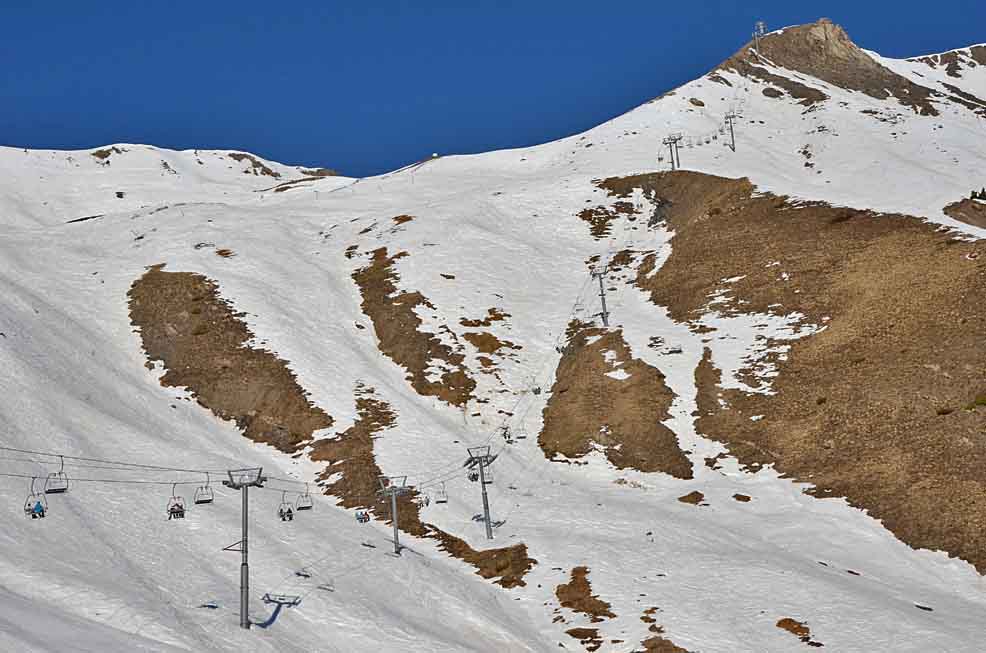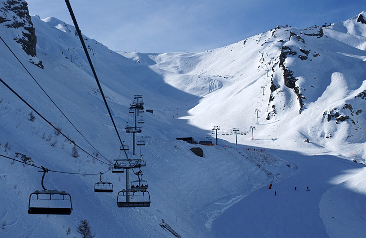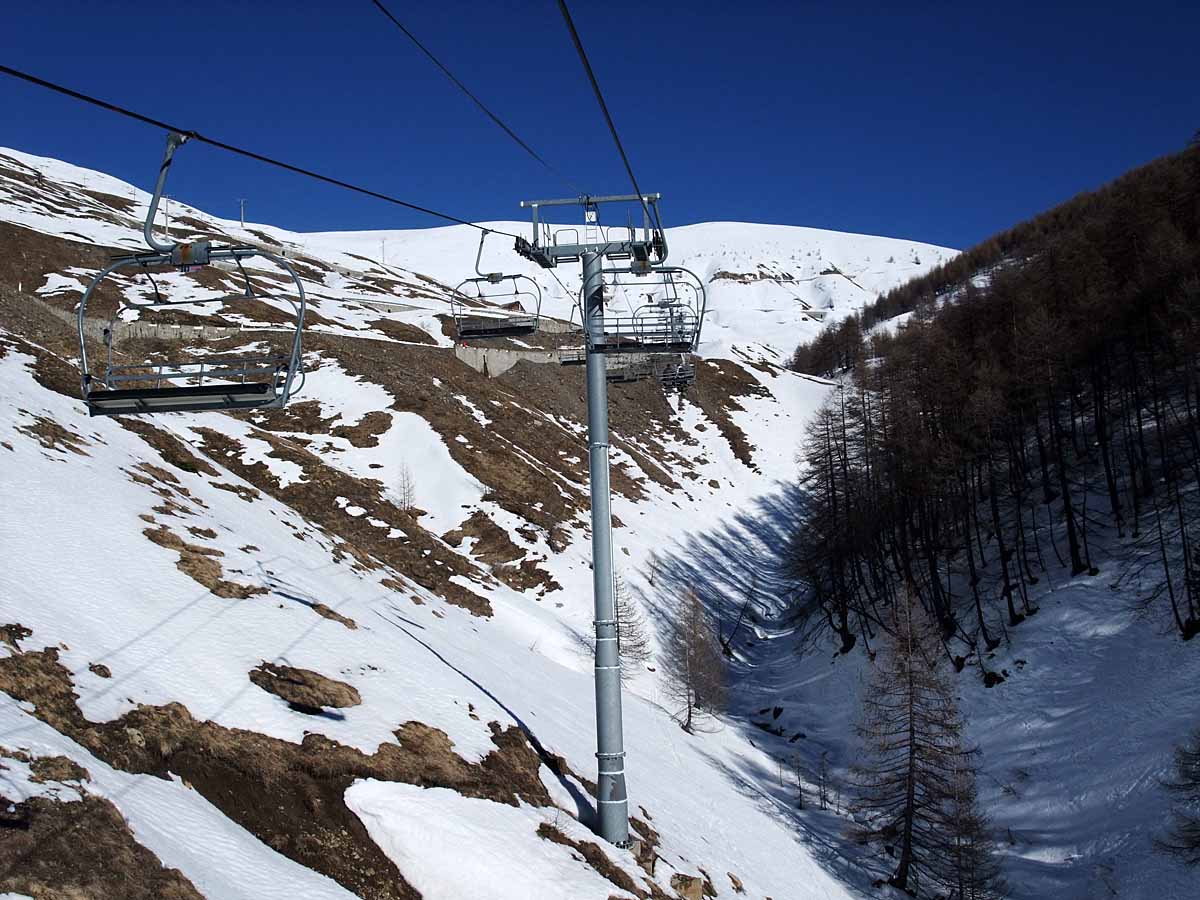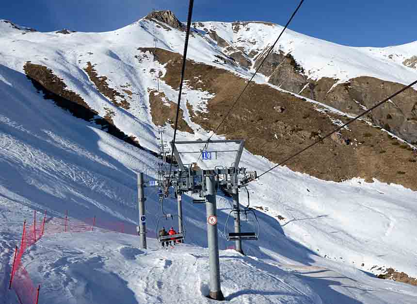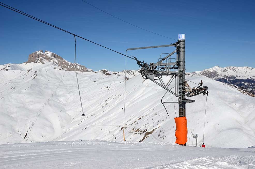 Poznámka: TSD6 La Chaup je druhou odpojitelnou sedačkou v celém středisku! V pozadí na ni navazující tuto sezónu zcela nová TSF4 Observatoire (náhrada za "vajíčko" TCD4 Aiguille, která dojezdila právě v týdnu, kdy jsem zde byl, ovšem její derniéru bohužel nafocenou nemám...).