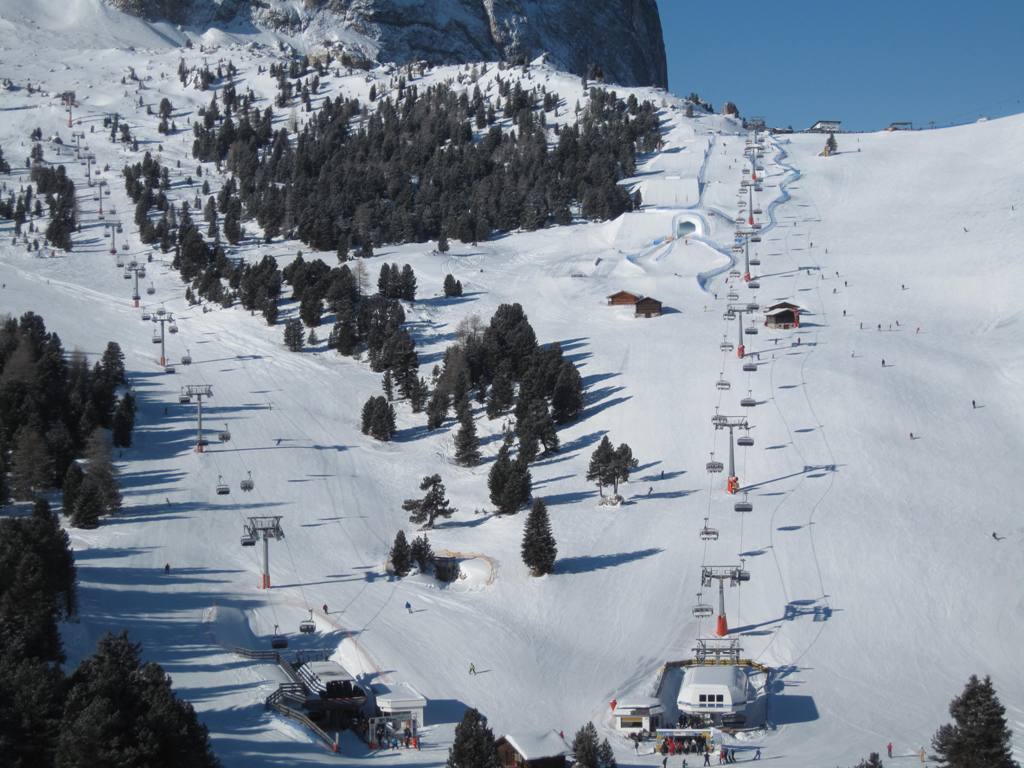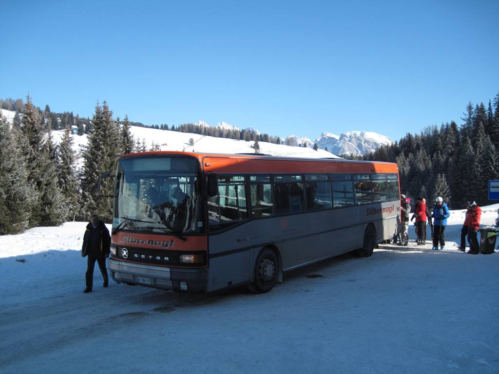 skibus z Monte Pany do areálu Alpe di Siusi (3 eura), celkem zážitek, taková "lesní pěšina" se zákazem vjezdu a jezdí tam 4 dvojkový setry na řetězech