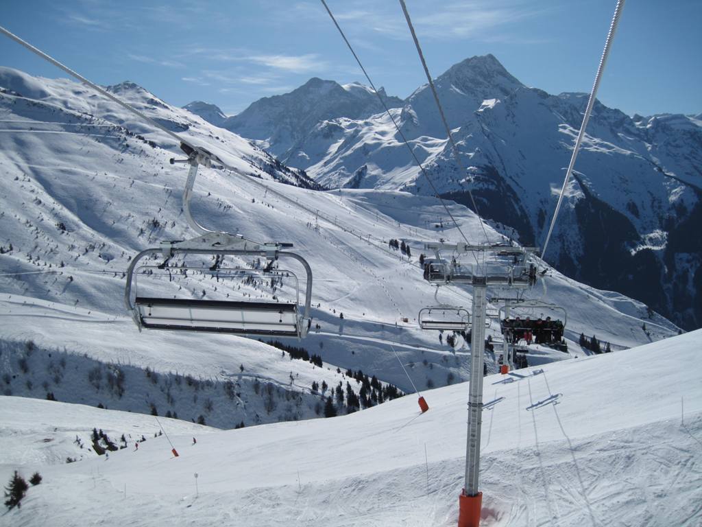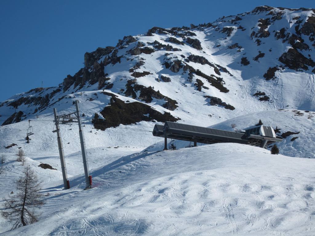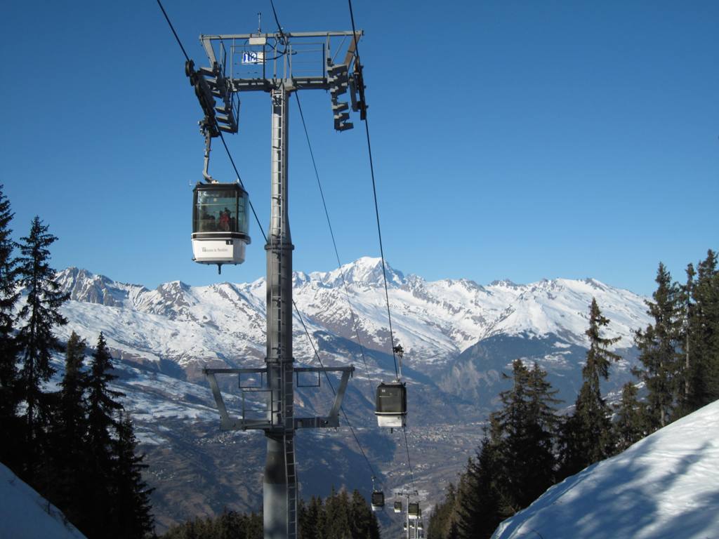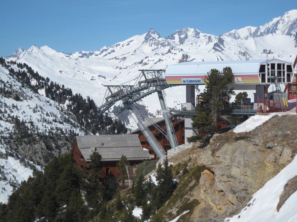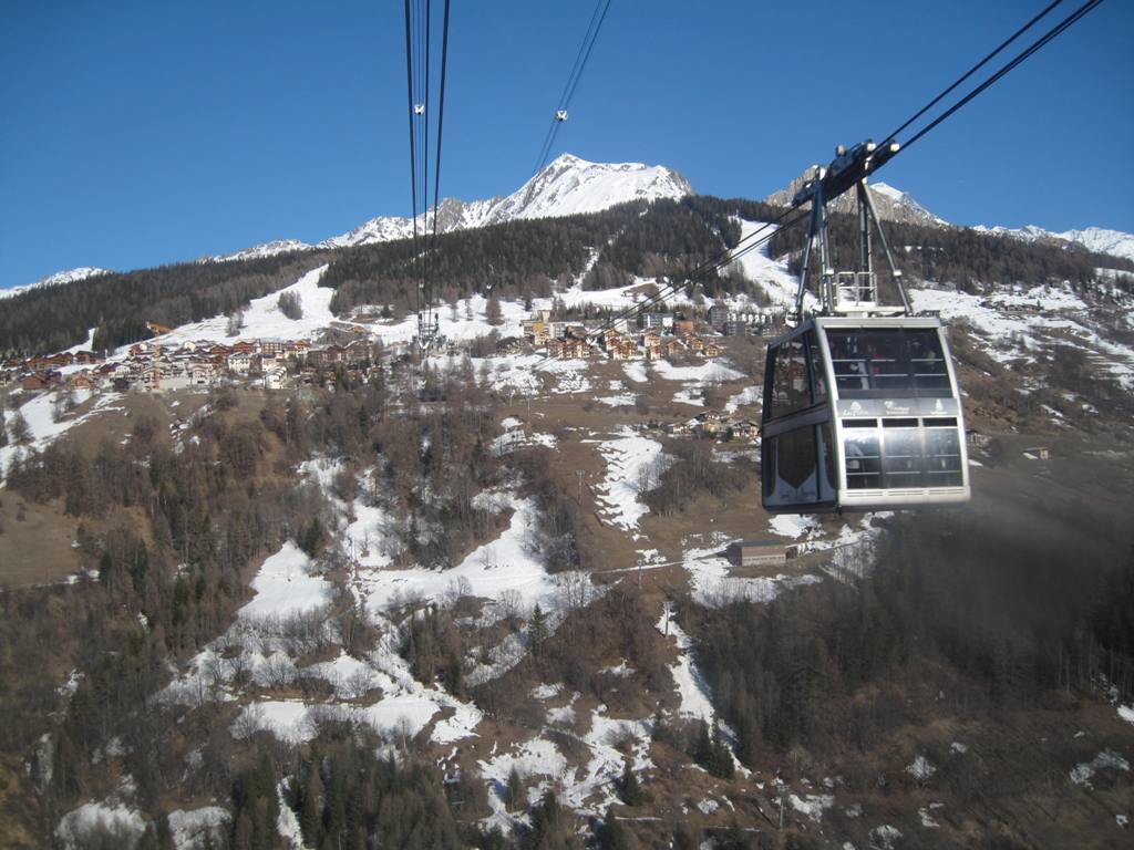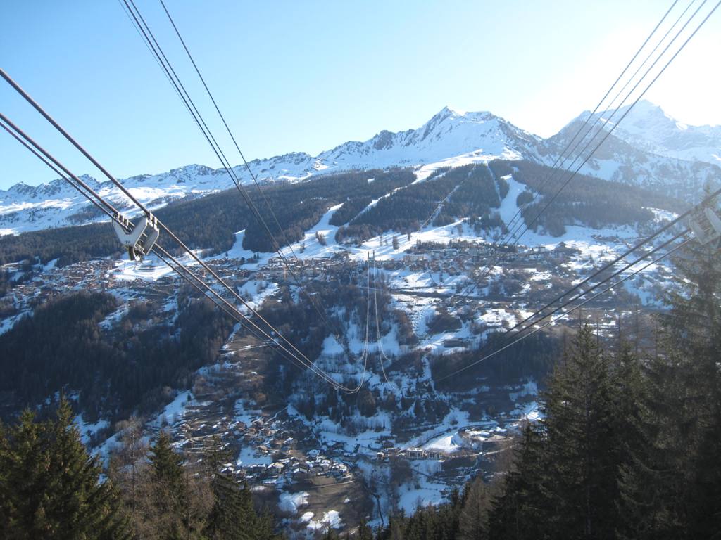 Pohled z opačné strany směrem na Les Coches, na fotce je vidět i lanovka Lonzagne, kterou se do areálu dostávají lyžaři z vesnice pod Vanoise expressem.