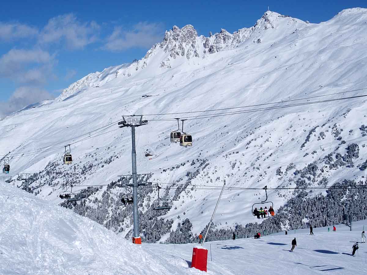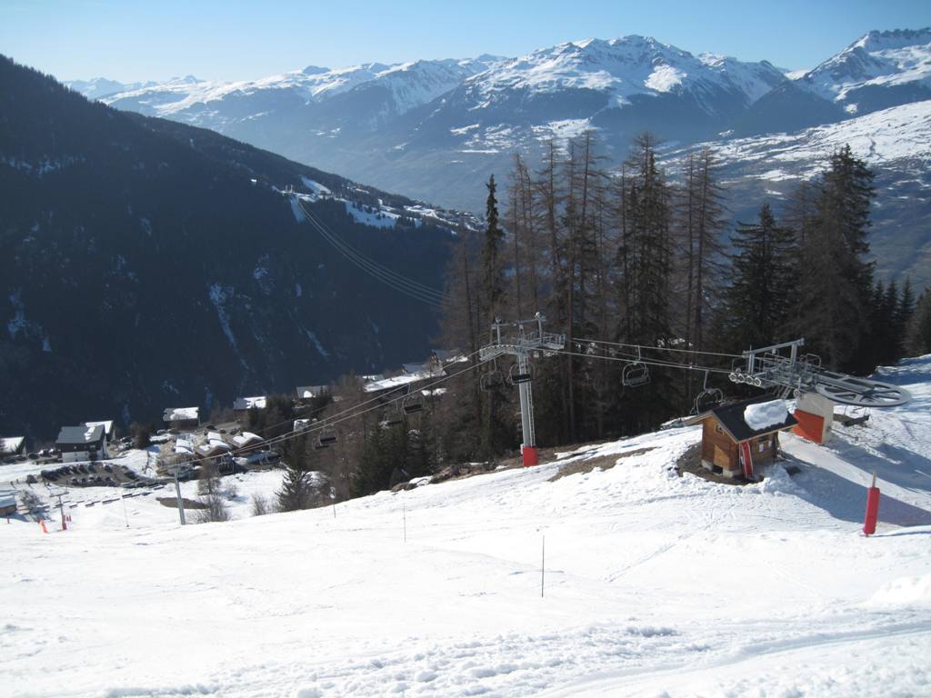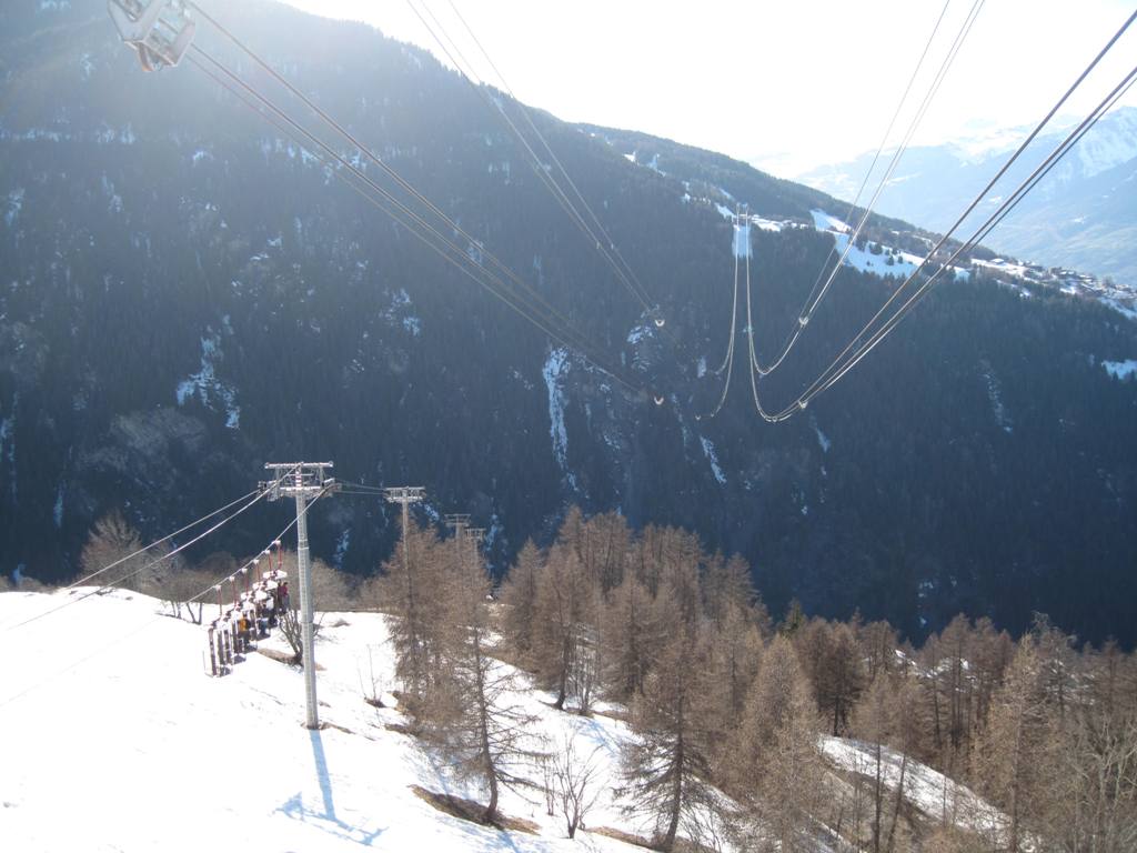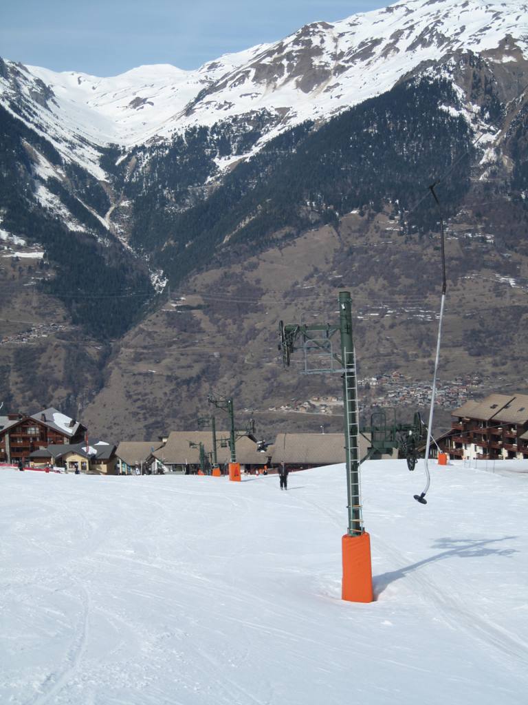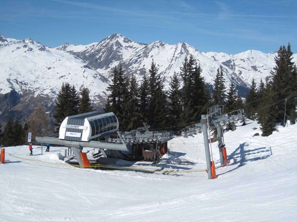 Pohled z opačné strany směrem na Les Coches, na fotce je vidět i lanovka Lonzagne, kterou se do areálu dostávají lyžaři z vesnice pod Vanoise expressem.