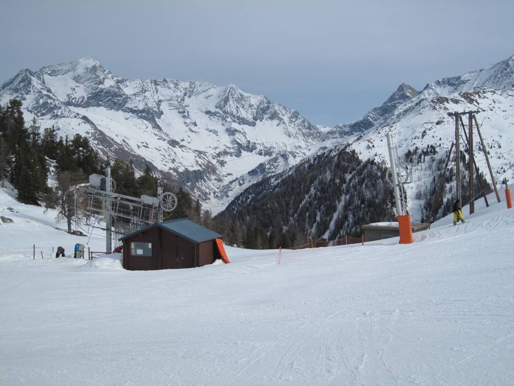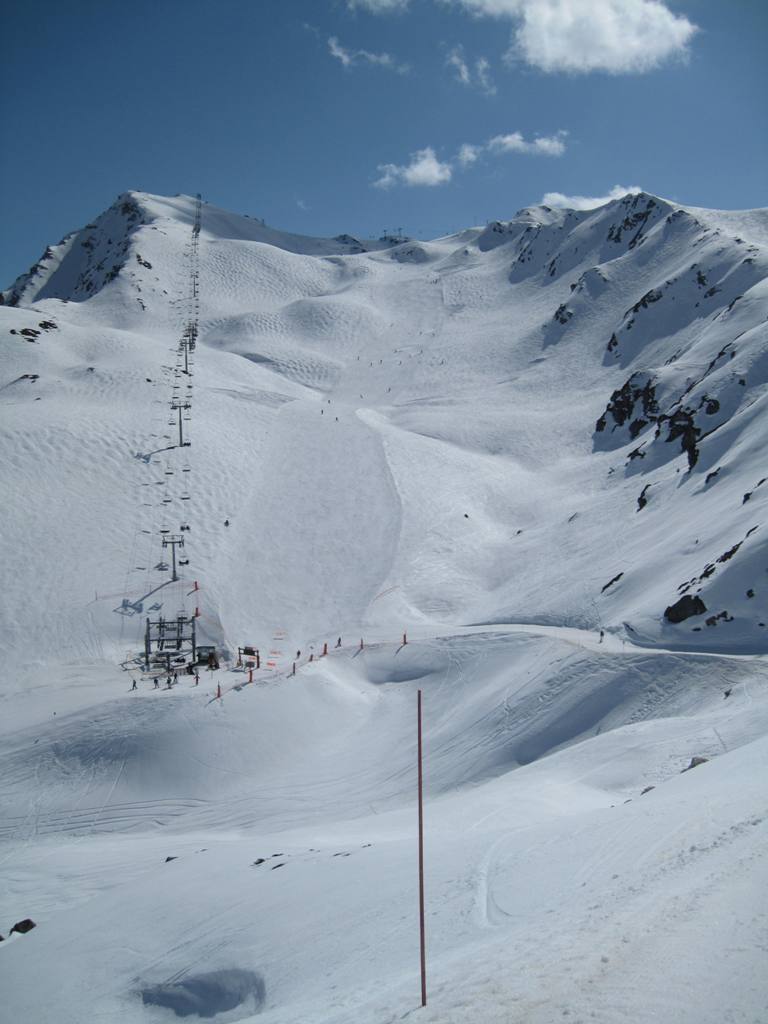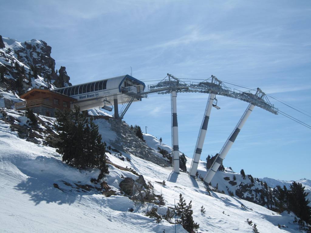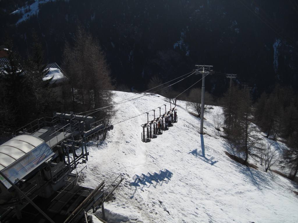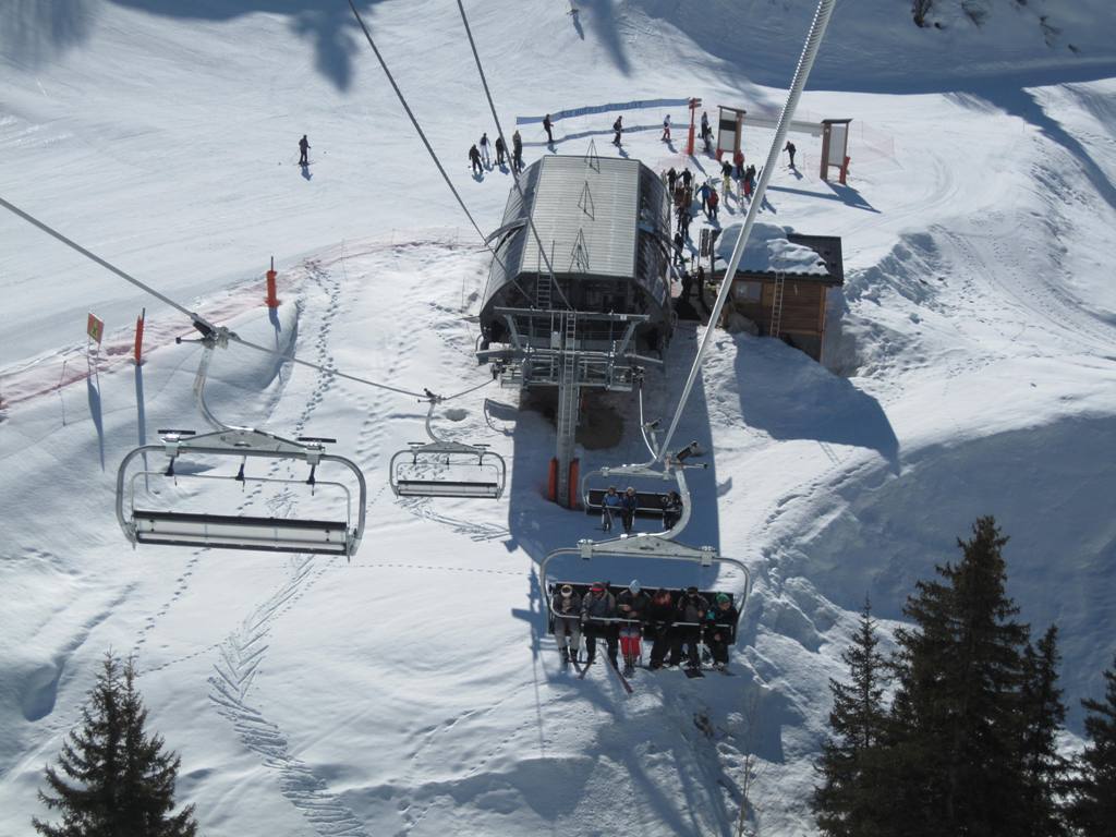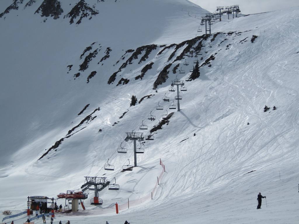 Pohled z opačné strany směrem na Les Coches, na fotce je vidět i lanovka Lonzagne, kterou se do areálu dostávají lyžaři z vesnice pod Vanoise expressem.