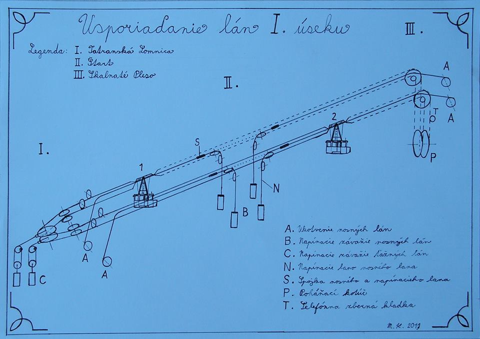Poznámka: Náčrt je môjho kamaráta a znázornuje jednoduchý princip kyvadlovej drahy na Skalnaté Pleso a všetky závažia tažných a nosných lán.