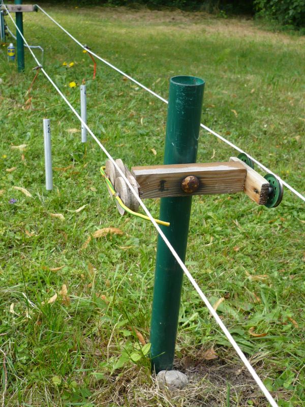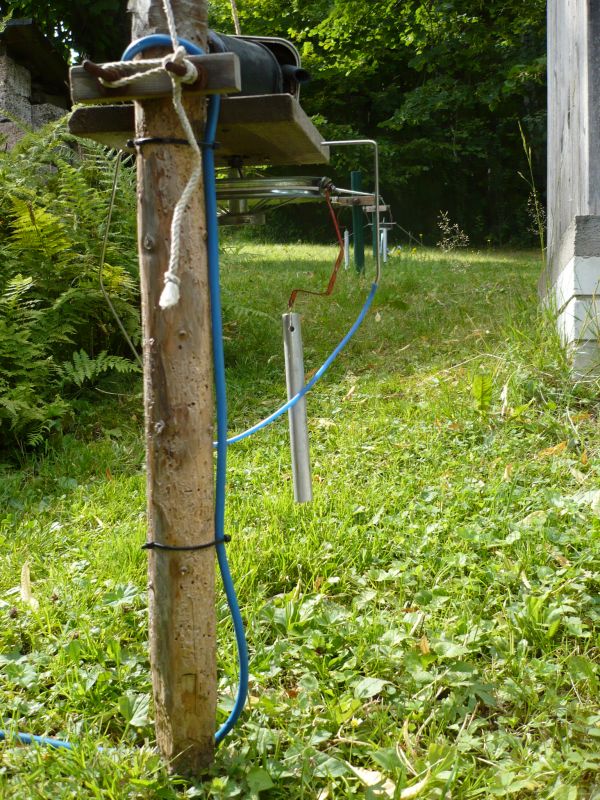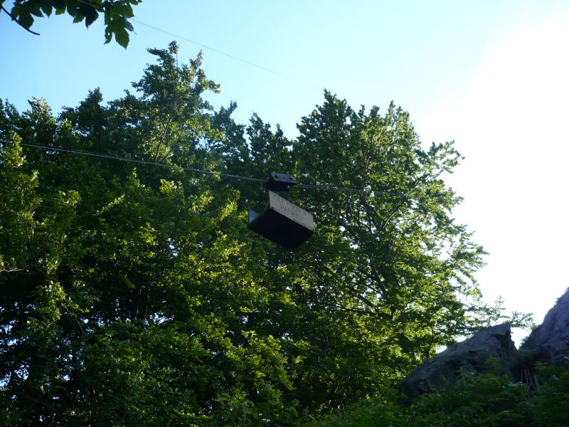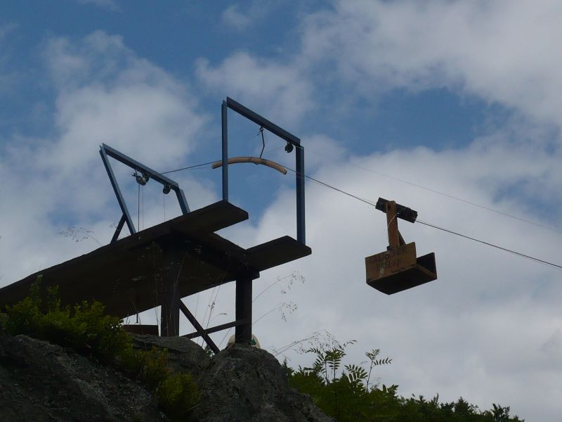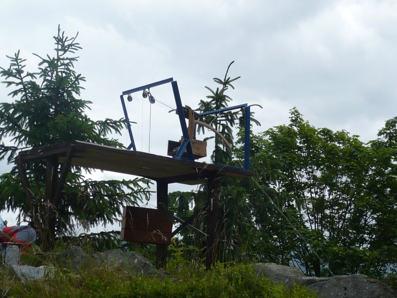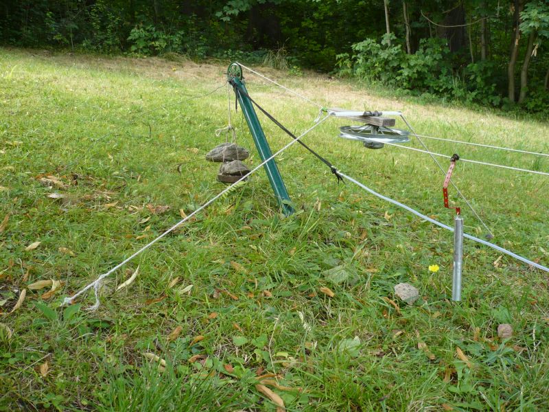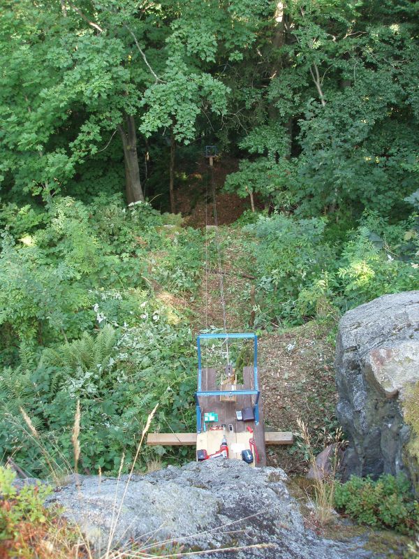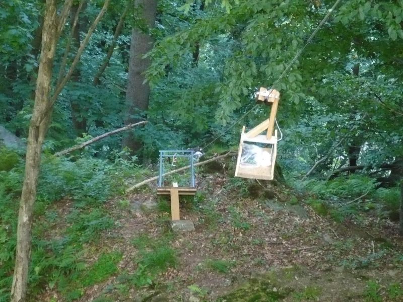 Tady jsou relativní pojmy "doma" i na "zahradě" :) Vlek je na našem pozemku hned za barákem, skála, ze které lanovky vede (loňskou sezóny vedla) je rovněž na našem pozemku, ale LD překračuje bývalou cestu (dnes pěšina) a dolní stanice už je za ní, na parcele souseda. Ale ploty tu v horách nemáme, takže je spíš potřeba sledovat, zdali je místo více či méně "na očích", a jestli zařízení nebude překážet. Při tom červnovém "Pohádkovém lese" bych chtěl lanovku umístit do středu obce, ale je to akce na jeden den, přes noc bych se bál to nechat takhle na očích. Stavba (pominu-li přivezení všech dílů) trvá cca hodinku, sklizeno může být do 30 min. Ty stanice se špatně přenáší jednomužně a práci při stavbě dá natažení lan a jejich vypnutí-je to věčné běhání nahoru a dolu.