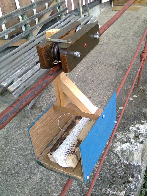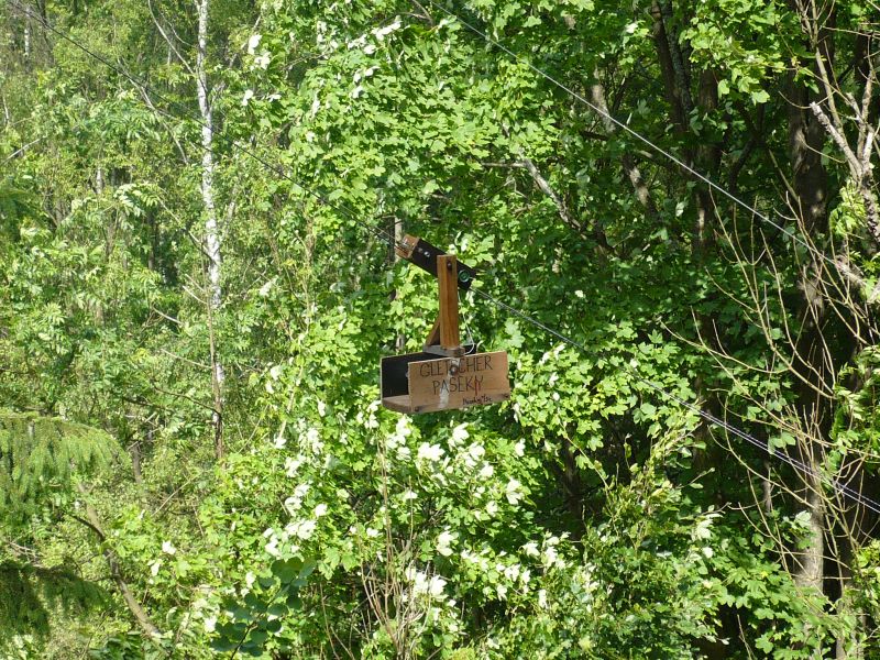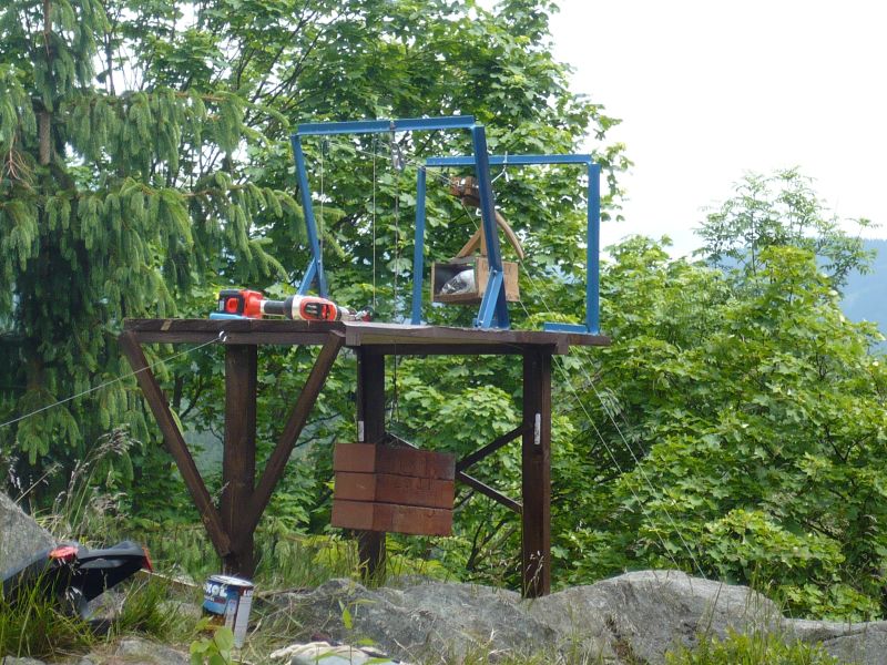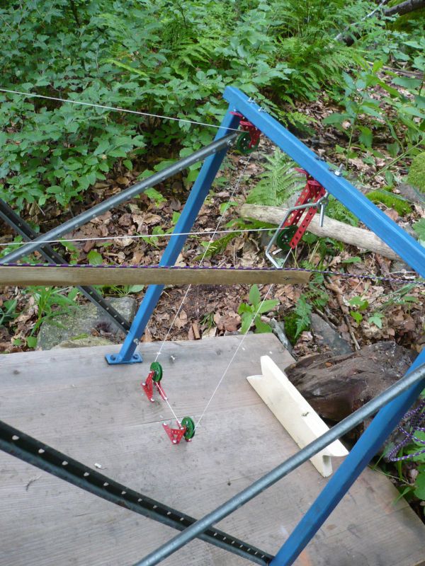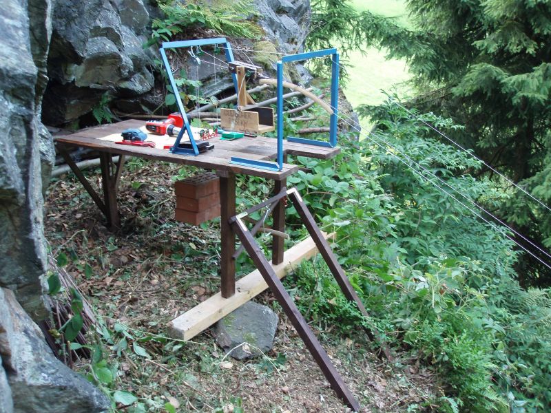 Poprvé jsem přispěl do vlákna o blbnutí s lanovkama, takže historii připomenu udtamtud: Visutá kabinovka se mi nejprve proháněla jen na nataženém provaze mezi stromy. Pak přišla úprava závěsu na jednostranný pro možnost jízdy přes podpěry, pak sbastlení horní stanice ze shnilého schodu. O pár let později již povedenější montáž dolní stanice. Vše poháněno jen taháním za tažný provázek-zde byl po léta největším kamenem úrazu pohon vyžadující plynulou regulaci, obousměrný chod a přívod elektrické energie do lokality hodné provozu této vistuté dráhy pod širým nebem. Až letos na jaře se realizace dočkal funkční a bezporuchový provoz lanovky 36 metrů dlouhé, poháněné akuvrtačkou-340 ot/min, rychlost ~0,75 m/s, napínání je prováděno závažím (15 kg) v horní stanici.