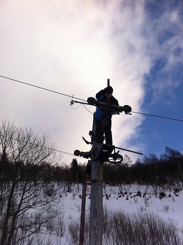Přijelo i pár freerajďáků, kterým se podařilo vyhodit lano :D . Po oznámení pán měl celkem radost a volal známému, aby to jel zkontrolovat. My mladý tupě hleděli ale nakonec jsme pomohli a lano dostali zpět na kladku :) .