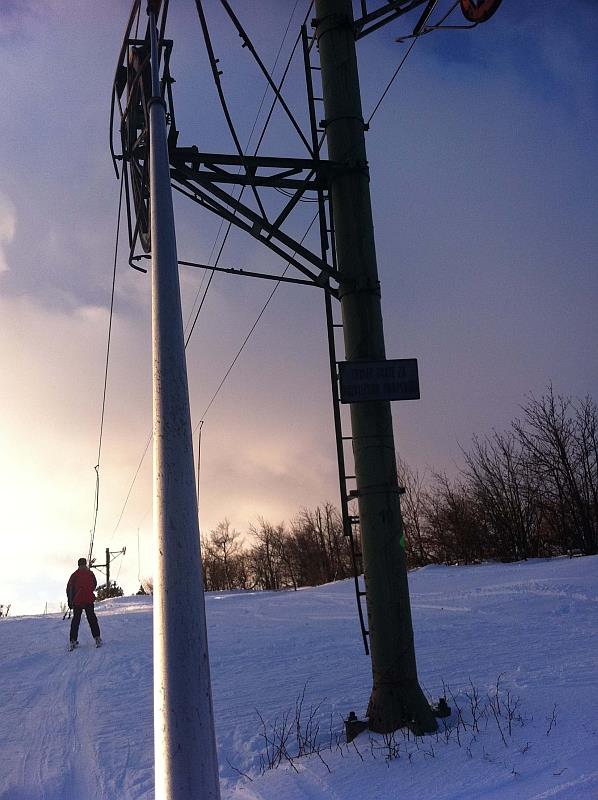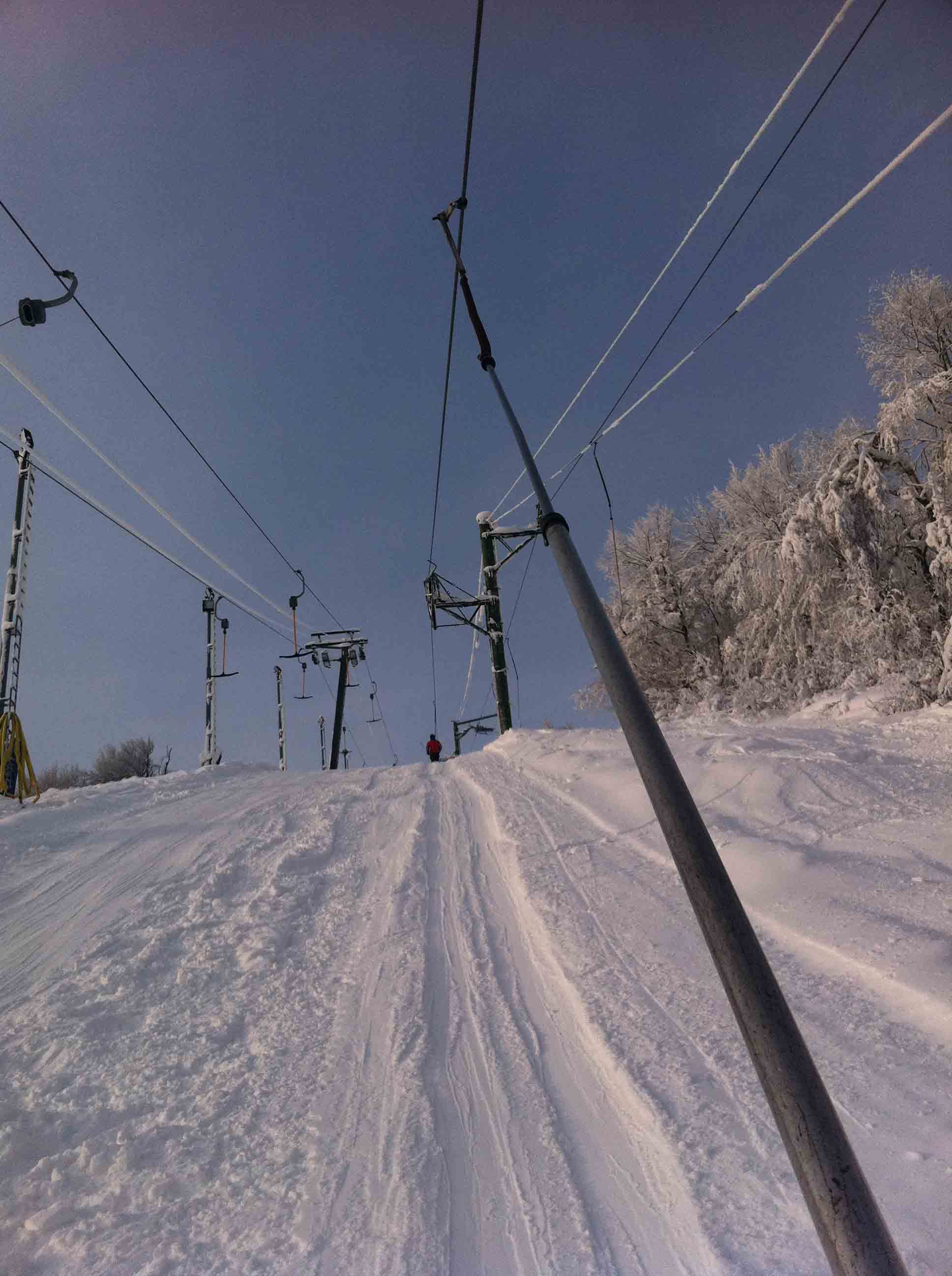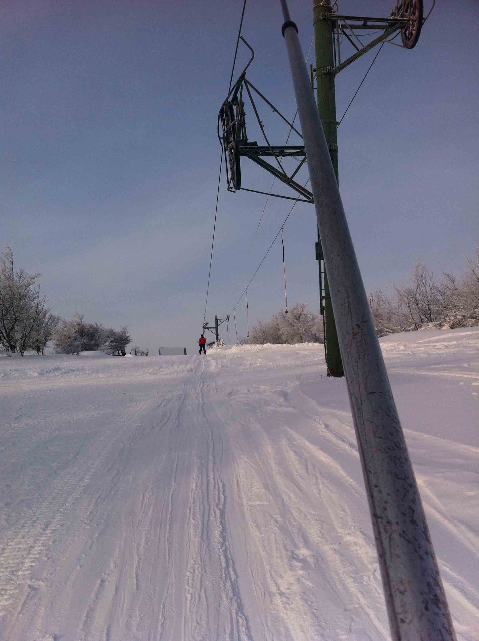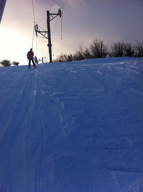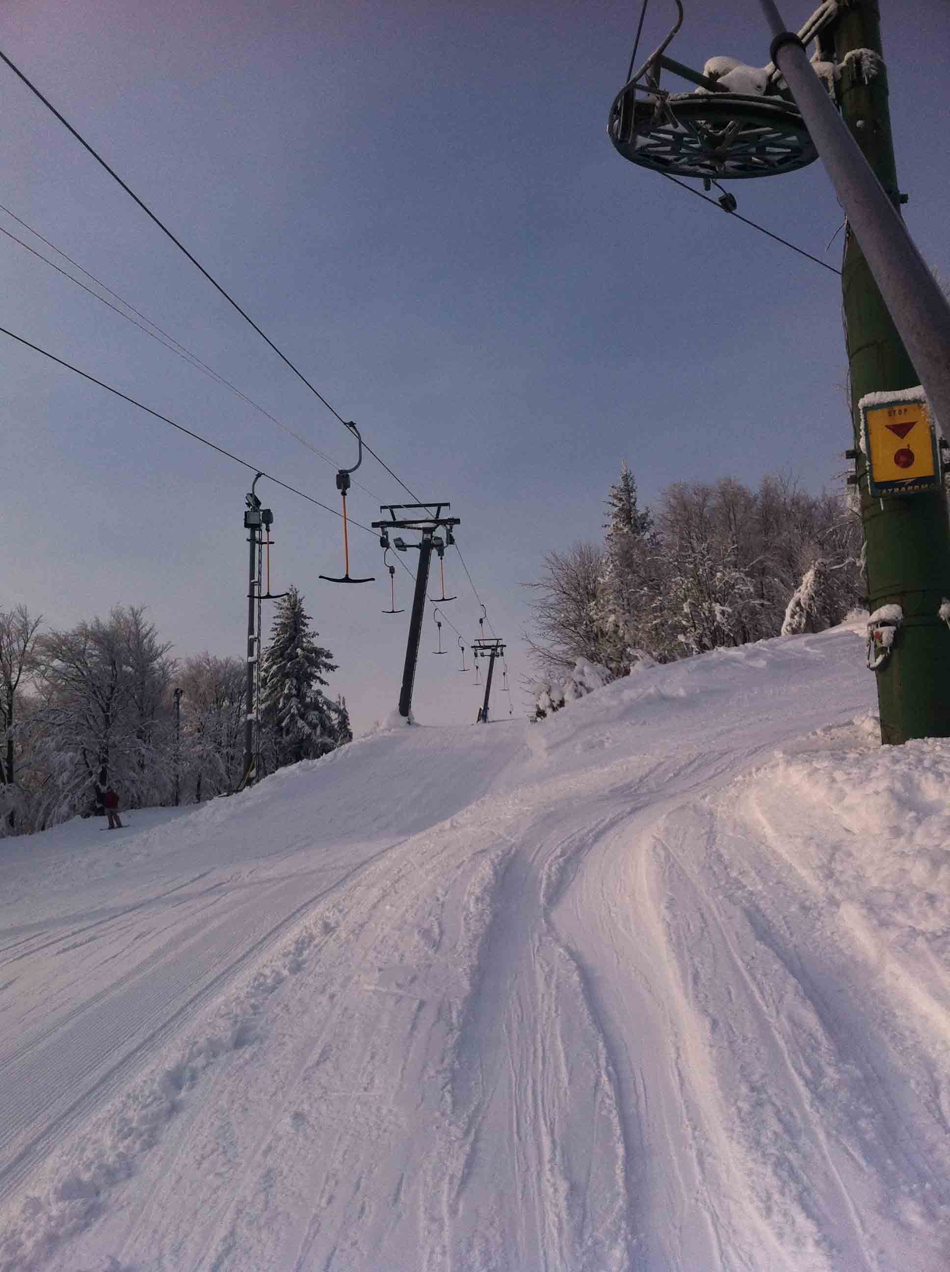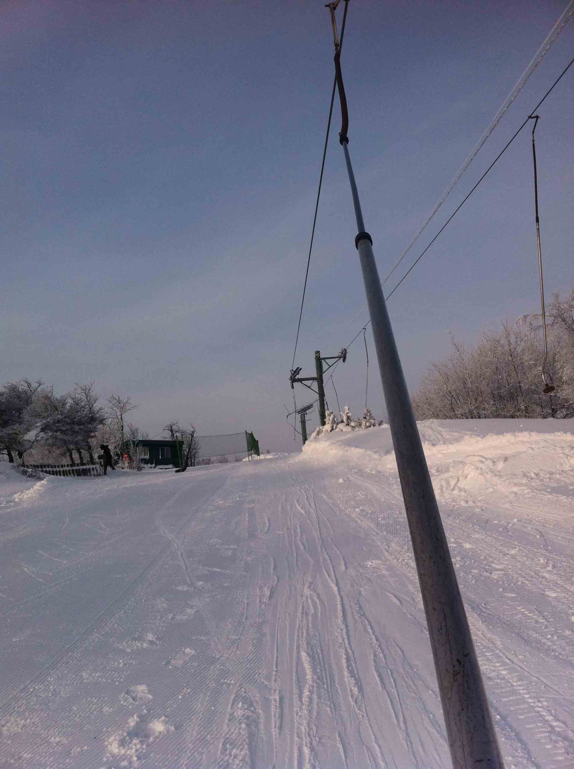 Ráno se jezdilo bez front nebo tak max 3 minuty. Samozřejmě nejdřív se rozjede jen Kotva, obsluhuje sjezdovky: Slalomák a neupravovanou freeride dvojku se super dřevěným skokánkem a převisem na sjezdovku tři. Na dvojce jezdí jen pár mladých