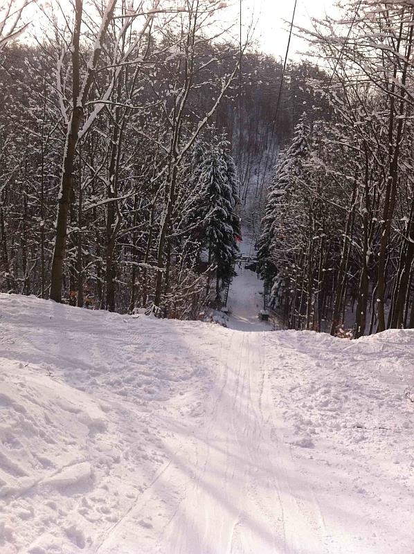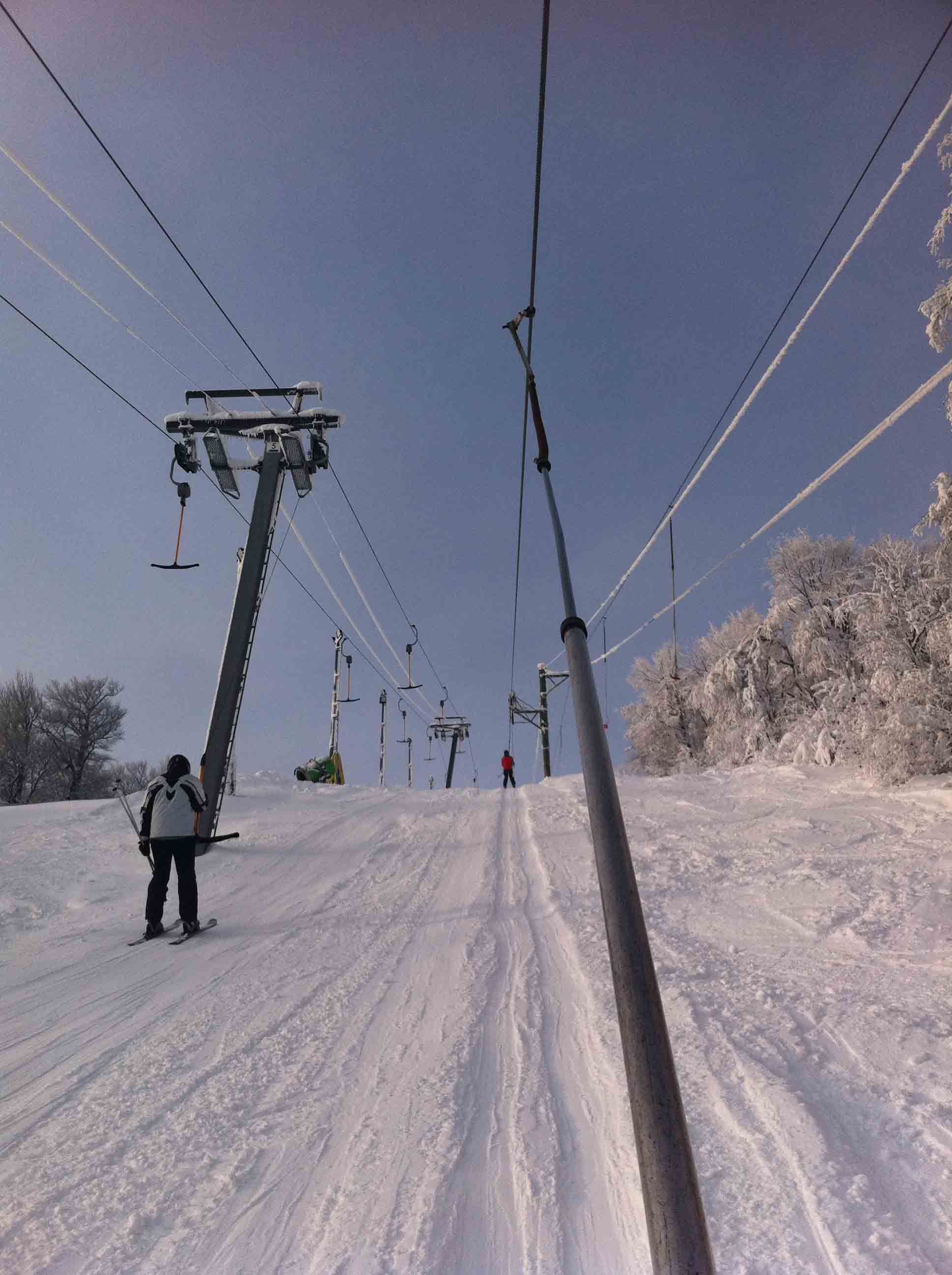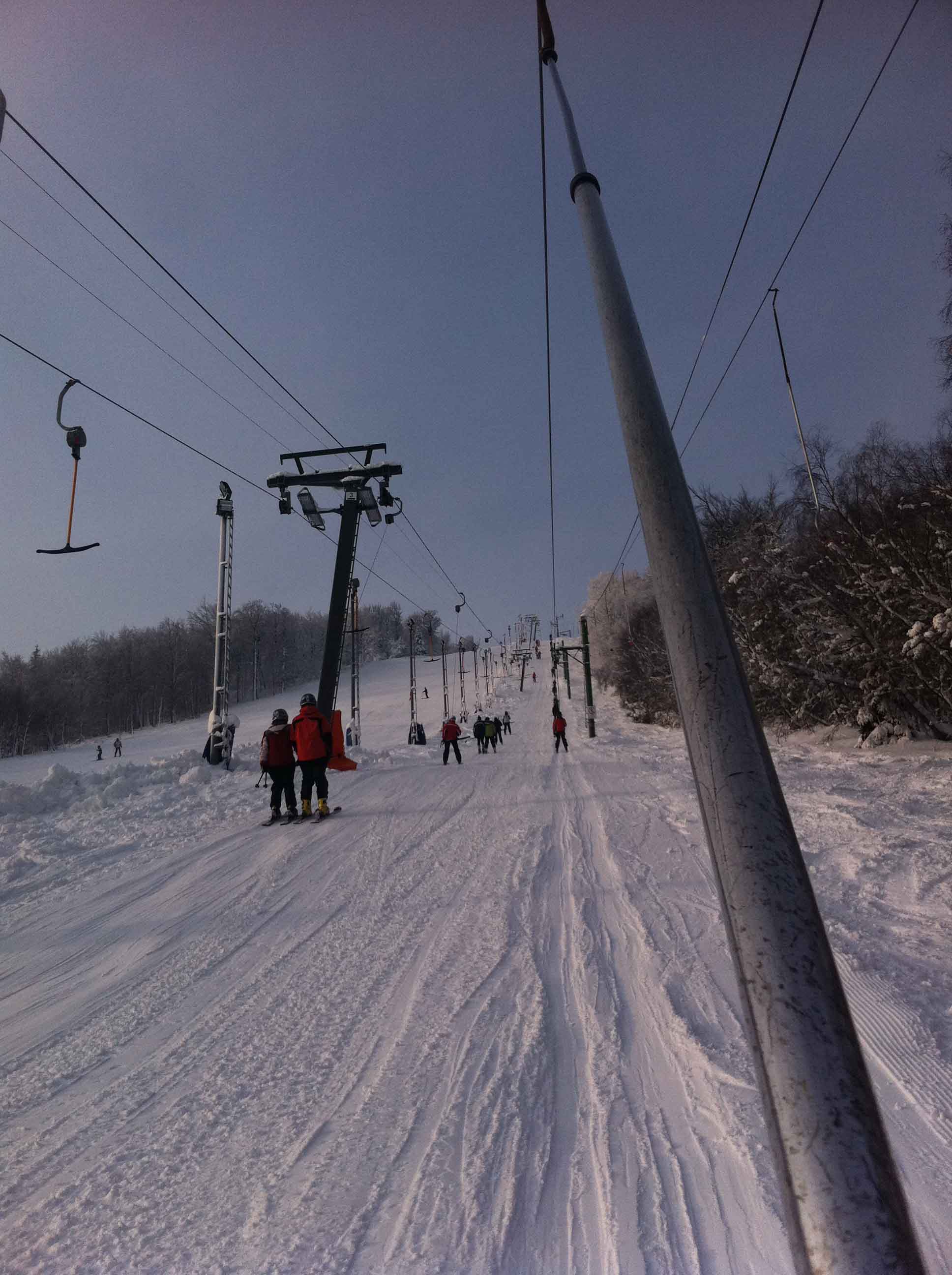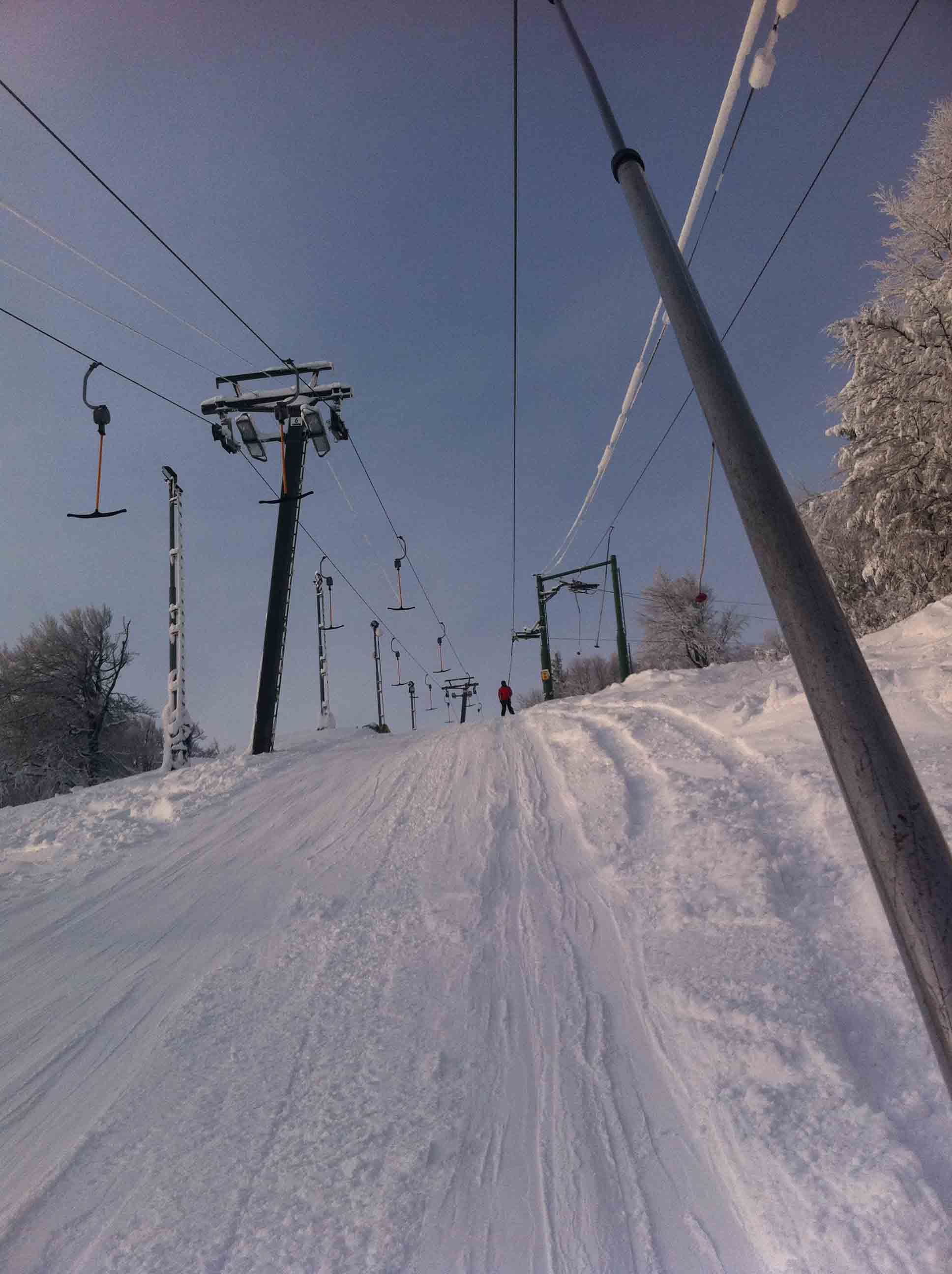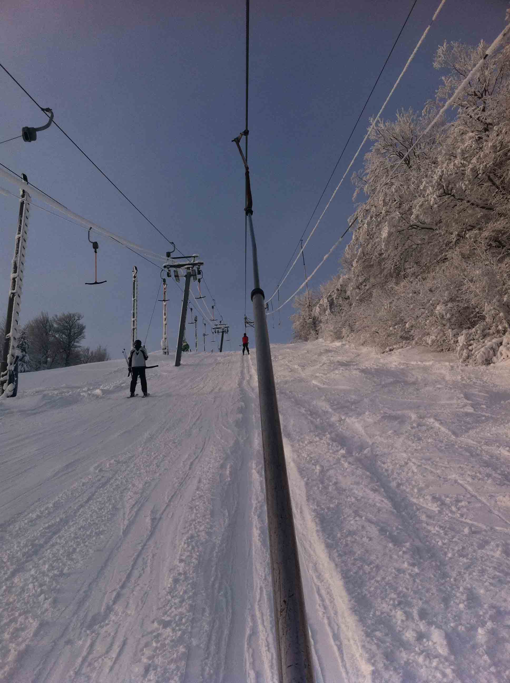Ráno se jezdilo bez front nebo tak max 3 minuty. Samozřejmě nejdřív se rozjede jen Kotva, obsluhuje sjezdovky: Slalomák a neupravovanou freeride dvojku se super dřevěným skokánkem a převisem na sjezdovku tři. Na dvojce jezdí jen pár mladých